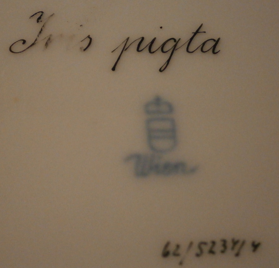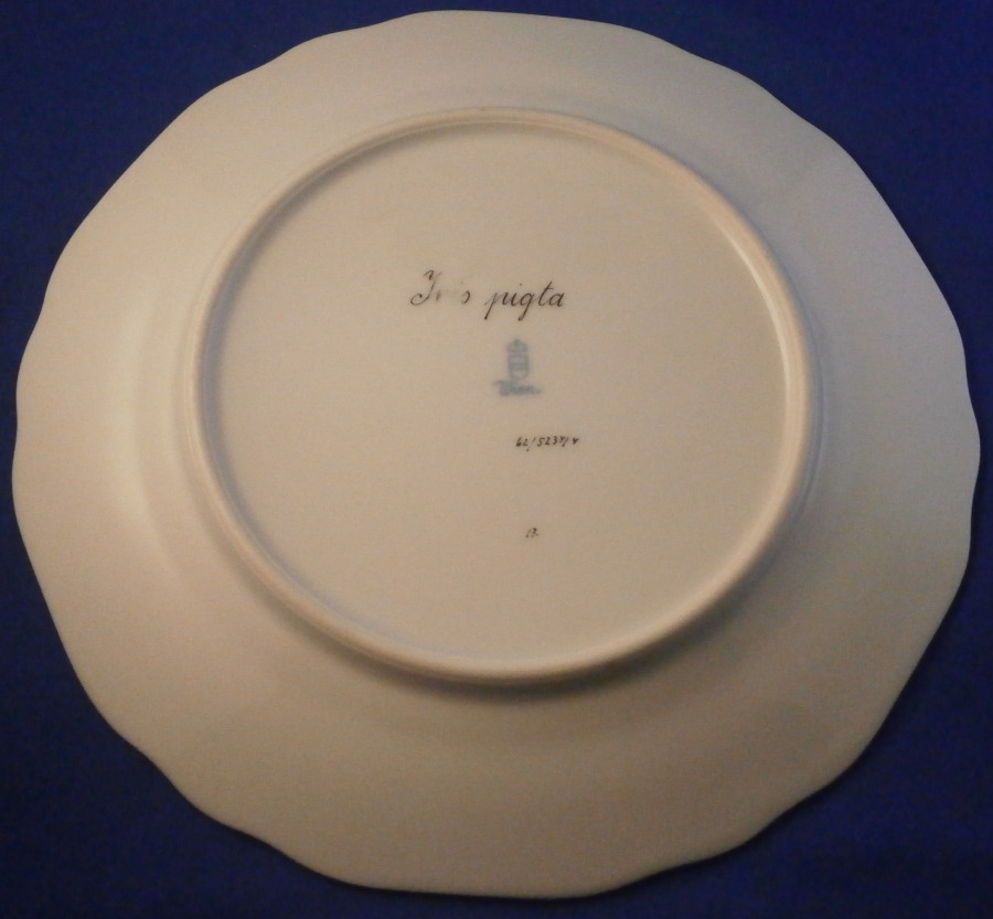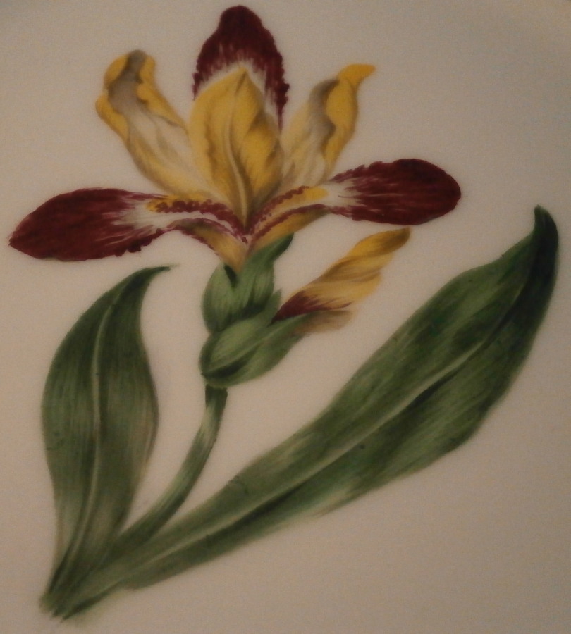 This is a nice floral plate made by Augarten during the original period in the early 20th century. It is hand painted with a superb iris flower in the center with a thin gold line around the well of the plate and a thick gold trim along the edge which is nicely shaped. The plate is 0.875 inches tall and 7.75 inches in diameter. It is in perfect condition with just the tiniest of gold wear. It displays perfectly! The piece is marked underneath with the blue shield with the crown on top as well as the word Wien underneath, a black 62/5234/4, a black number 17. and the Latin name of the flower in black - Iris pigta as shown. This one does not have the red rectangualr Augarten Austria mark like the others I ahve from this set but I ahve no doubt it is from the same time period. A superb piece that looks great especially with the three others I also have on the site if anyone is interested in a pair or set. Please email me for more information or photos.
