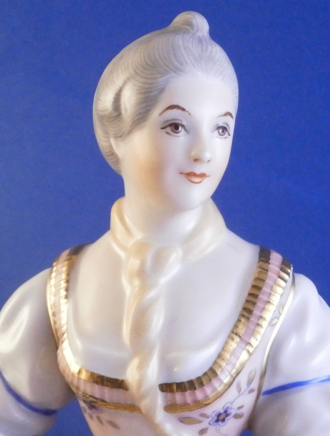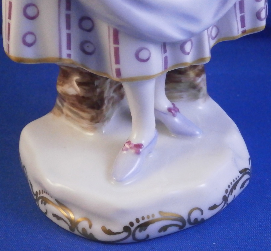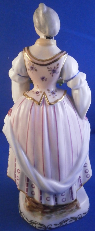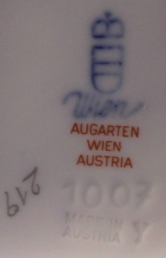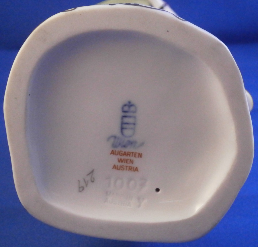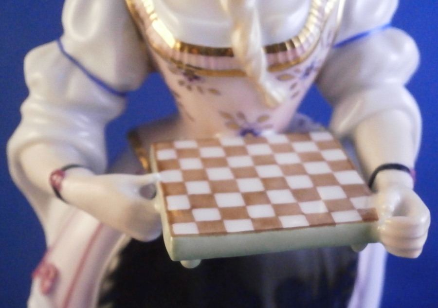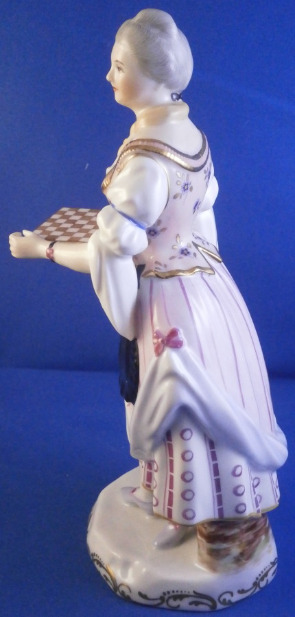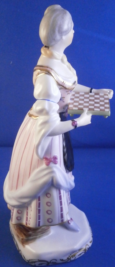 This is a figurine of a waitress holding a chessboard made by Augarten in the mid 20th century. Originally an 18th century Vienna version, Augarten redid them in the early 20th century and later. Not sure why a waitress is holding a chessboard but I am sure there is a reason for it :) The figurine is nicely modeled wearing a fancy dress and standing on a base with the typical Royal Vienna gold trim. The piece is hand painted with lots of detail and nice colors. Wish I had the 18th century original to stand them side by side but I am not that lucky. The figure is in perfect condition! She is 7.75 inches tall, 3.25 inches wide and 3.5 inches deep. Marked underneath with the blue shield with the crown on top as well as the word Wien underneath, Augarten Wien Austria in a red, impressed Made in Austria, a black 219 as a painter's mark, the letter y impressed and the model number 1007 as shown. I think you can still order the figurine from them directly but it'll costs around 2100 Euros if you do. Please email me for more information or photos.