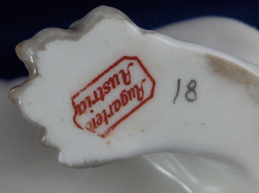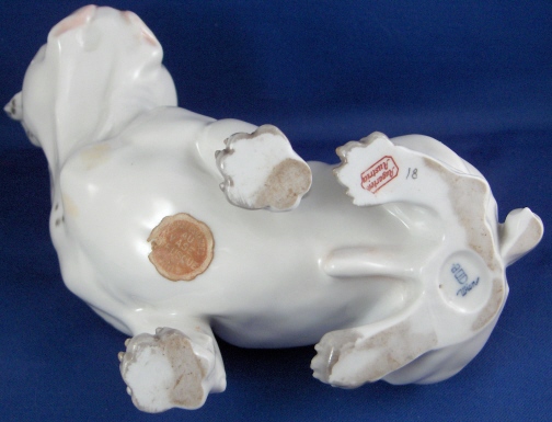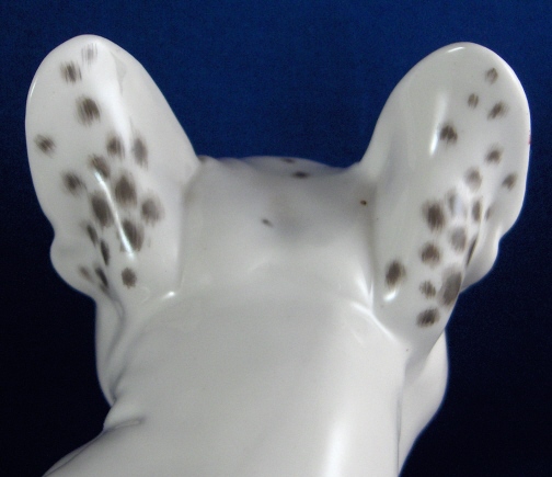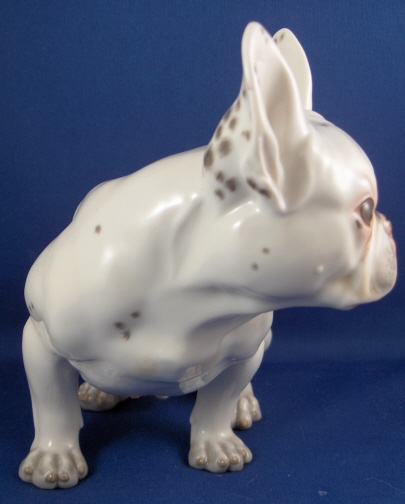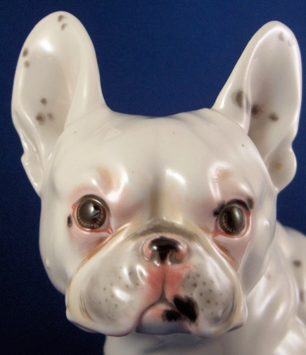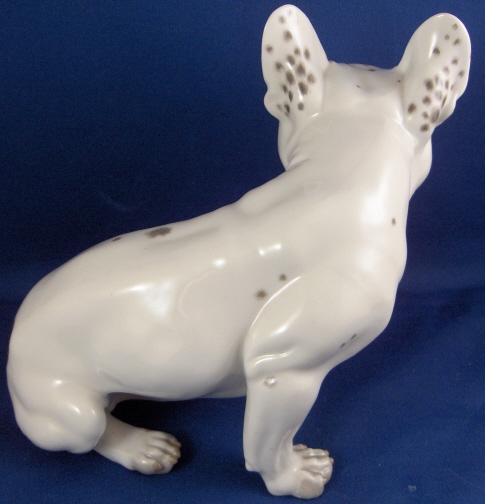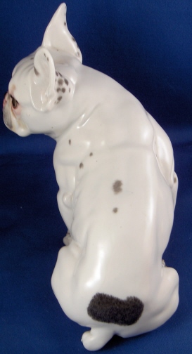 This is one of the hardest to find dogs - the large French Bulldog - made by Augarten especially from the original period in the early 20th century. This one is the painted version which is very very nice! The dog is 5.75 inches tall, 5.5 inches long and 3.75 inches deep. Marked underneath with the impressed shield with the crown on top as well as the word Wien underneath, Augarten Austria in a red rectangle, a black 18 and an impressed 8 though that is hard to make out. He is in perfect condition. Please email me for more information or photos.