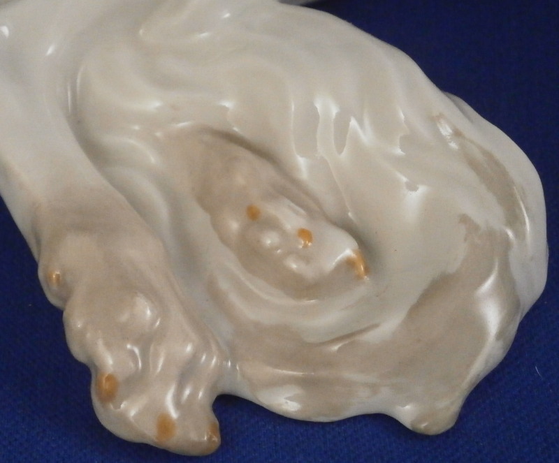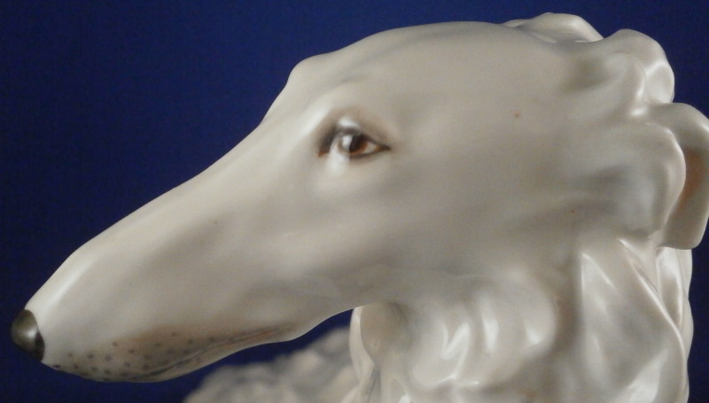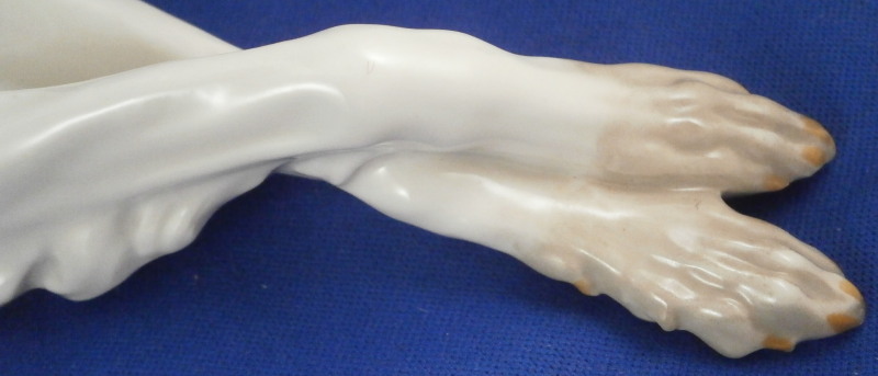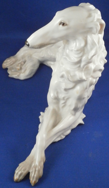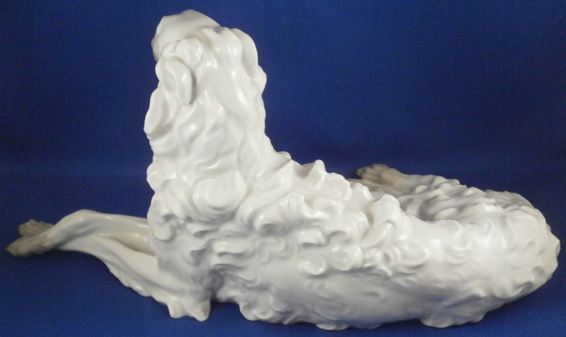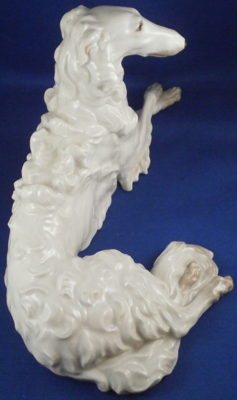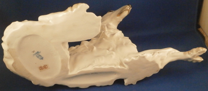 This is a very large figurine of a Russian Wolfhound / Borzoi dog made by Augarten in the 1930's during the original period. The figurine is the largest version being 6 inches tall, 6 inches wide and 12 inches long. The figure is very well modeled and hand painted and is in perfect condition. Marked underneath with the blue shield with the crown on top as well as the word Wien underneath, impressed number 1713/III , as well as Augarten Austria in a red rectangle. There is an impressed letter L and the black painter's number 28. on the underside. Please email me for more information or photos.