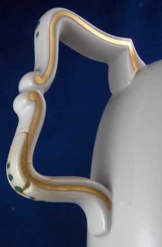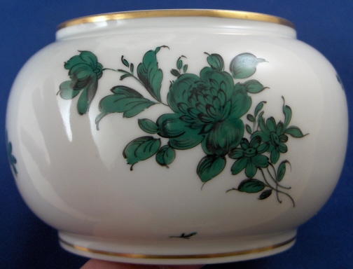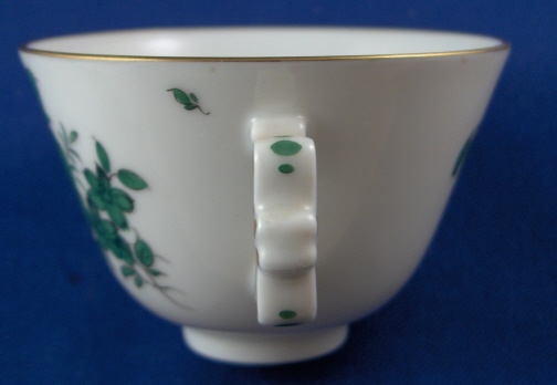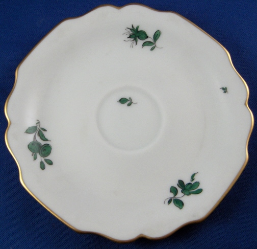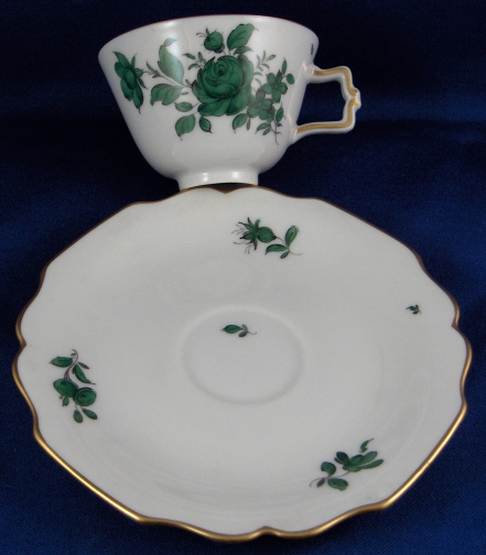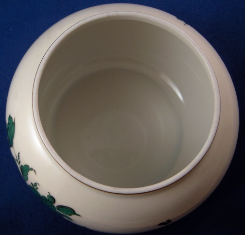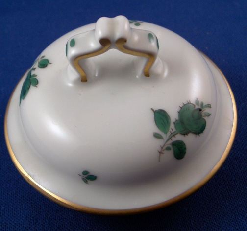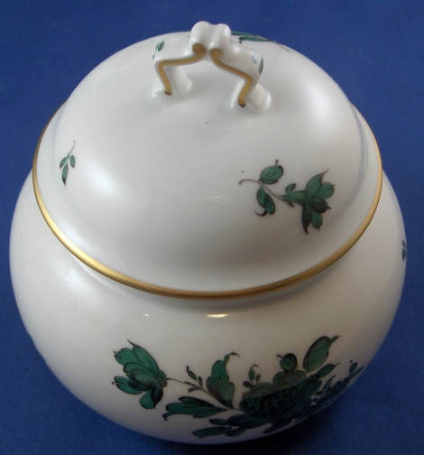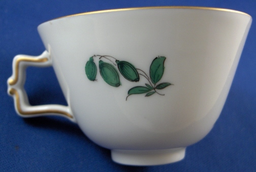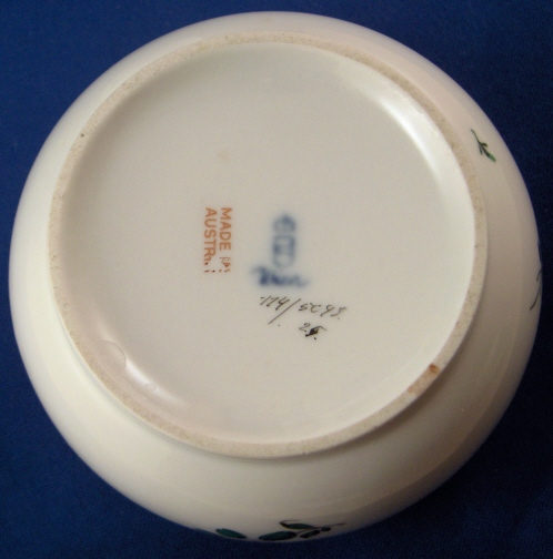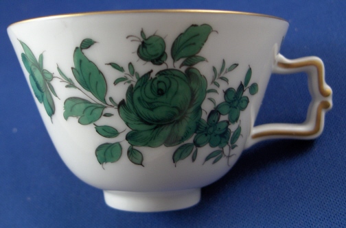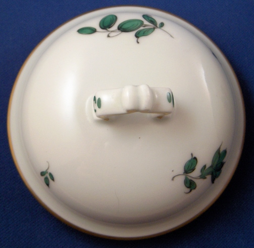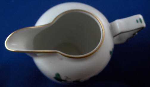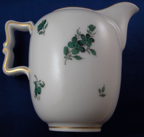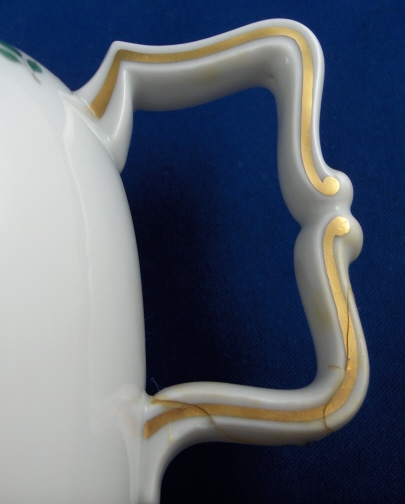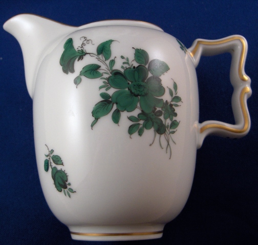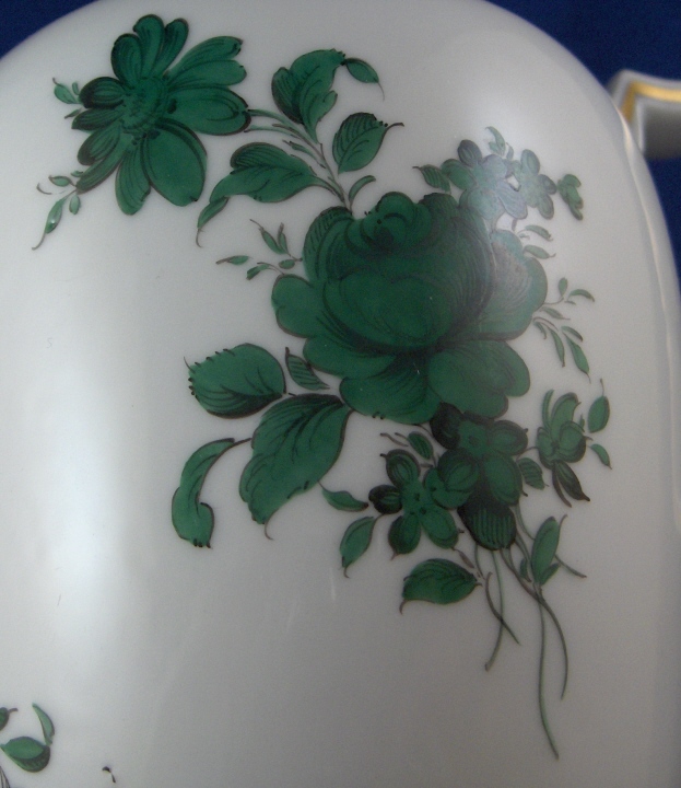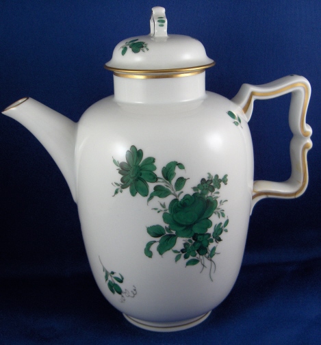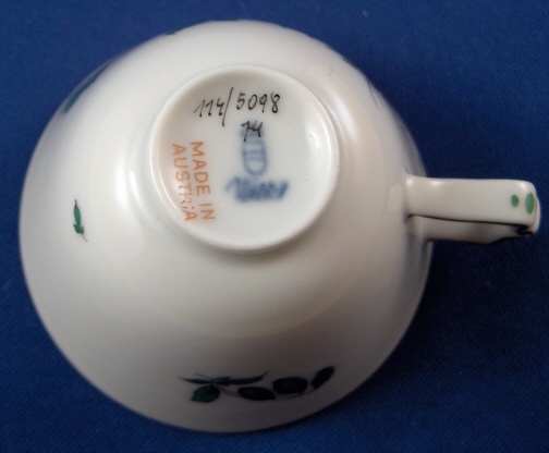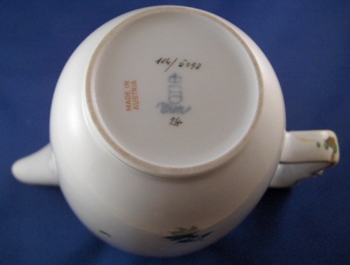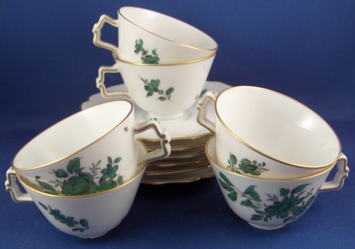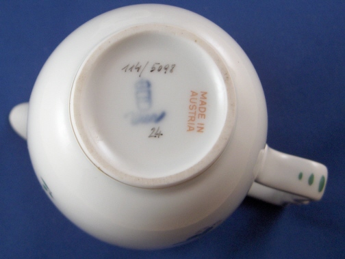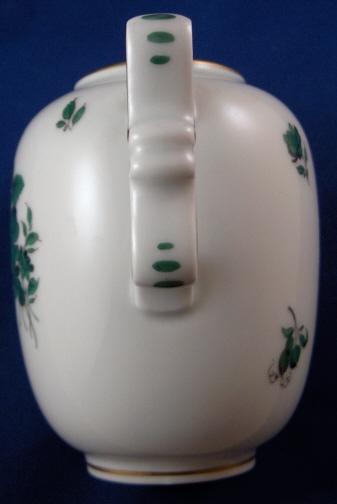This is a Mocca set for six in the Maria Theresia pattern made by Augarten in the 20th century. It has a nice shape to the handles and the green floral decoration is quite elegant especially with the gold trims to the rims. The set included 6 cups and saucers, a lidded sugar dish, a creamer and a lidded pot. All are in good condition except the handle of the pot was broken into pieces and reglued but it displays OK since most of the damage is underneath. The cups are 1.75 inches tall and 2.75 inches in diameter at the top. The saucers are 0.5 inches tall and have a diameter of 4.75 inches. The creamer is 4.125 inches tall and has a diameter of 3 inches. The sugar dish with lid is 3.75 inches tall and has a diameter of 3.75 inches. The pot with its lid is 7.5 inches tall and 4.25 inches in diameter. All pieces are marked with the underglaze blue shield mark with the crown on top and Wien underneath as well as Made in Austria and some black numbers. Please email me for more information or photos.