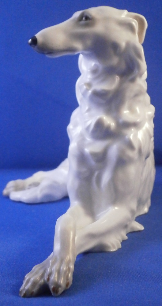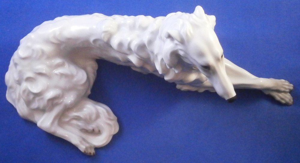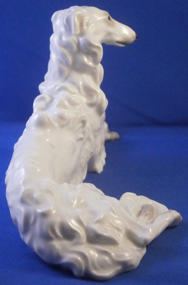 This is a figurine of a Russian Wolf dog / Wolfhound / Borzoi made by Augarten in the mid 20th century. A supebly modeled figure with lots of detail to it and hand painted just enough to look amazing! The fur is superbly done as is the detail of the face and paws. One of their nicer models for sure. The figurine is the medium sized version being 4.25 inches tall, 8 inches long and 3.75 inches deep. It is in perfect condition. Marked underneath with the blue shield with the crown on top as well as the word Wien underneath, impressed number 1713/II , as well as Made in Austria impressed and a painter's mark 27. as shown. Please email me for more information or photos.