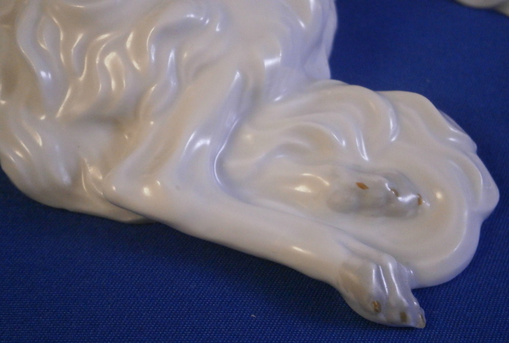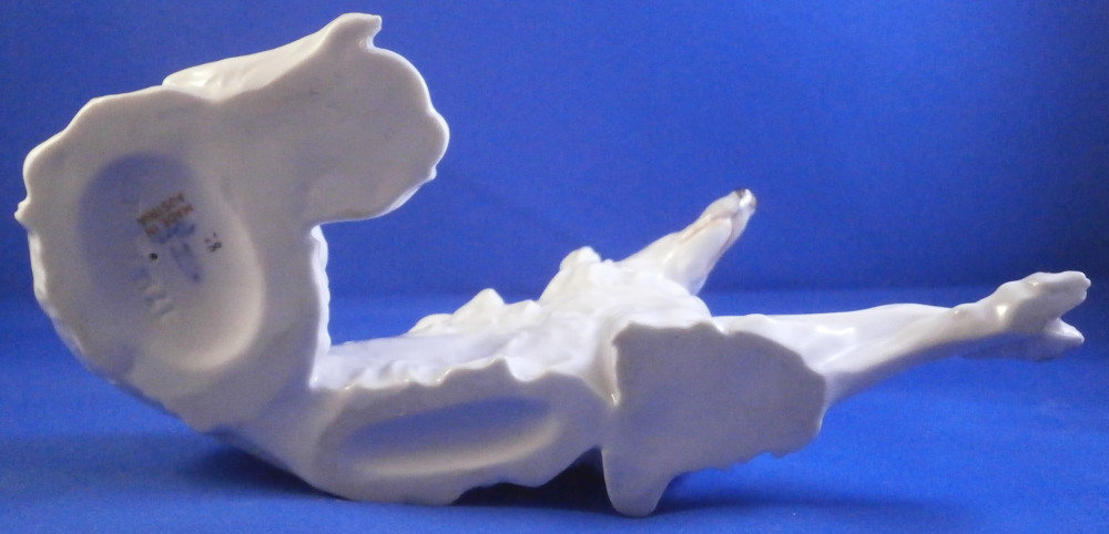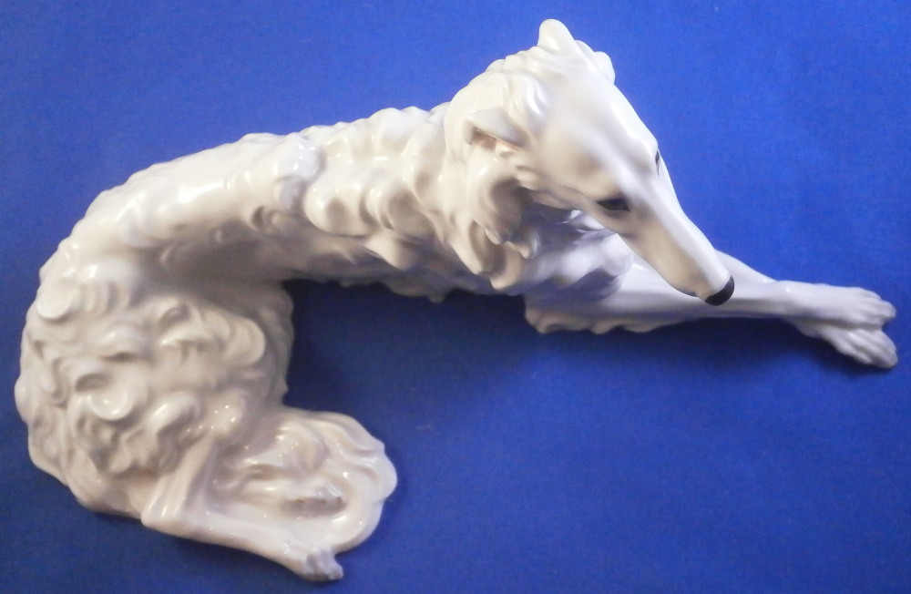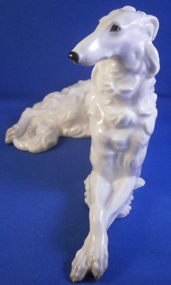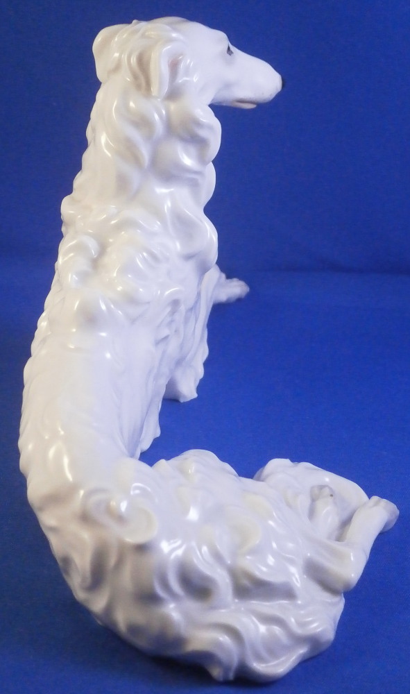 This is a figurine of a Russian Wolf dog / Wolfhound / Borzoi made by Augarten in the mid 20th century. A superbly modeled figure with lots of detail to it and hand painted just enough to look amazing! The fur is really well done as is the detail of the face and paws. One of their nicer models for sure. The figurine is the medium sized version being 4.25 inches tall, 8.125 inches long and 3.75 inches deep. It is in perfect condition. Marked underneath with the blue shield with the crown on top as well as the word Wien underneath, impressed number 1713/II, an inpressed letter F as well as Made in Austria in red and a painter's mark 82 (I think). as shown. Please email me for more information or photos.