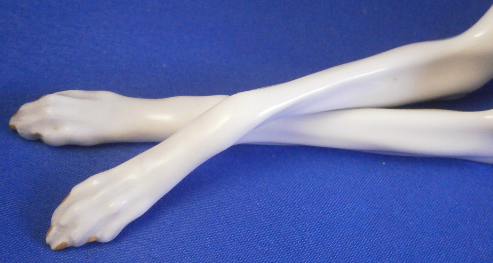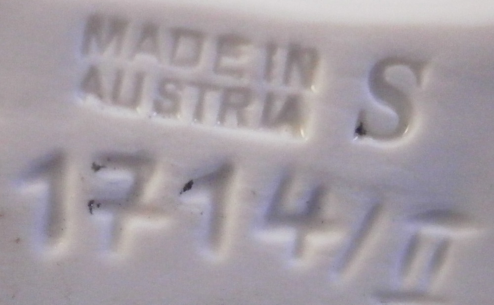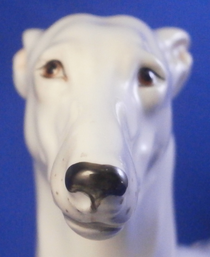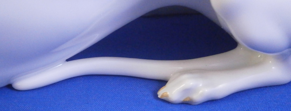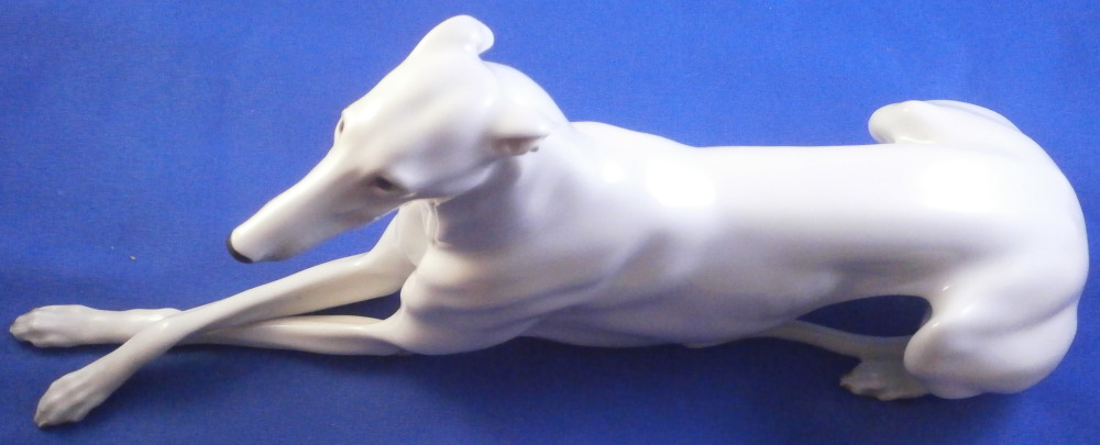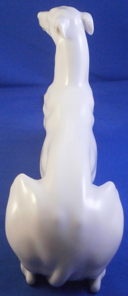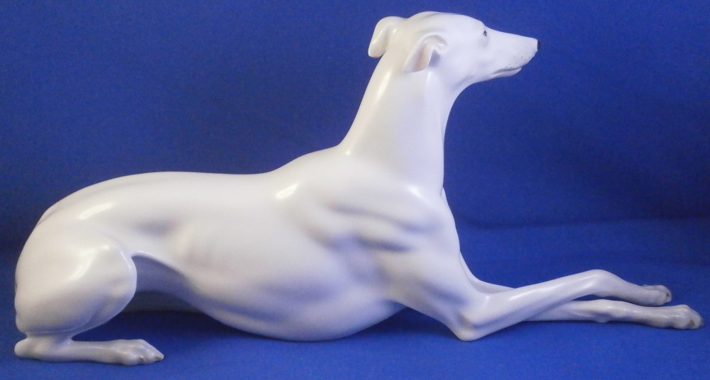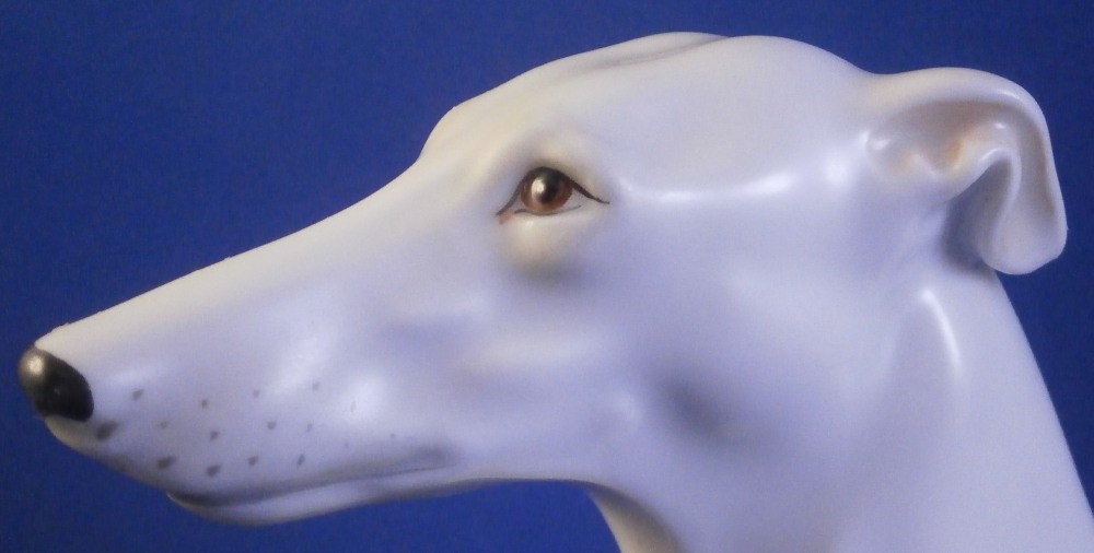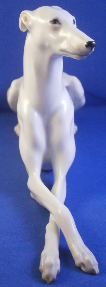 This is a superb figure of a Greyhound / Whippet made by Augarten in the mid 20th century. This is probably the most popular of their dogs and one of the hardest to find especially this painted medium sized version. The figurine is superbly modeled and painted just enough to look real. You can even see its ribs a tiny bit and all the muscels. The figurine is 5 inches tall, 3 inches wide and 10.625 inches long. The figure is in perfect condition. It is marked underneath with the blue shield with the crown on top as well as the word Wien underneath, impressed number 1714 as well as an II (the size reference), impressed Made in Austria, impressed letter S and a painter's number 219 in black. A stunning looking dog! Please email me for more information or photos.