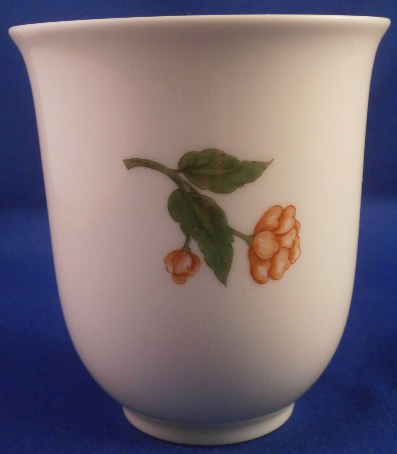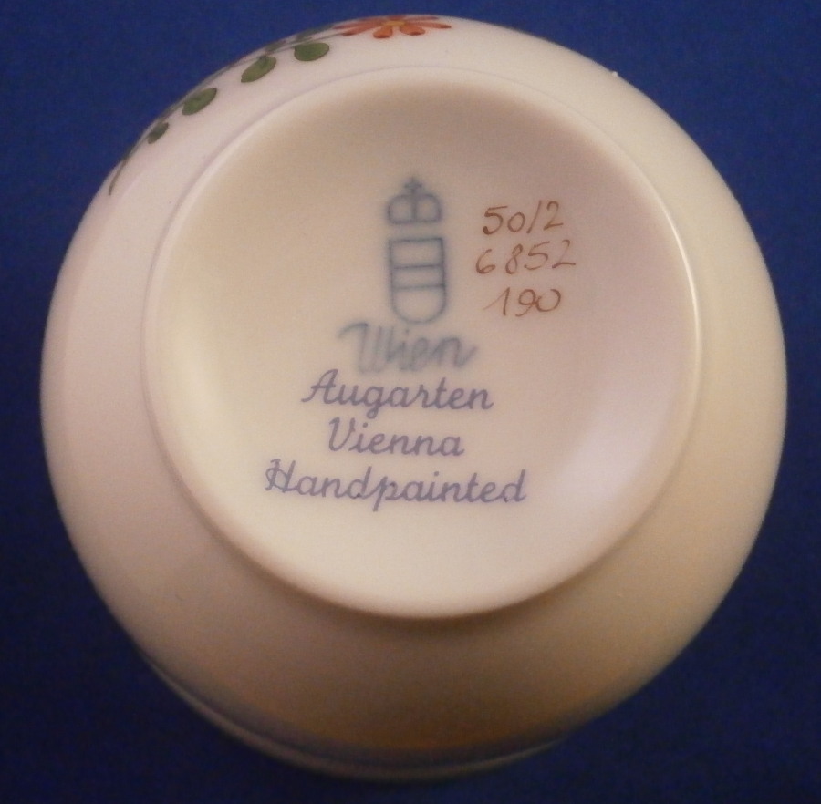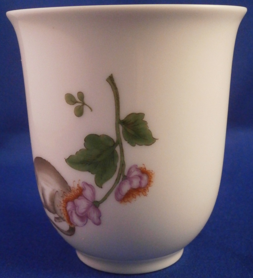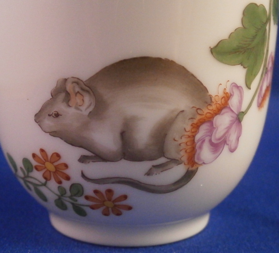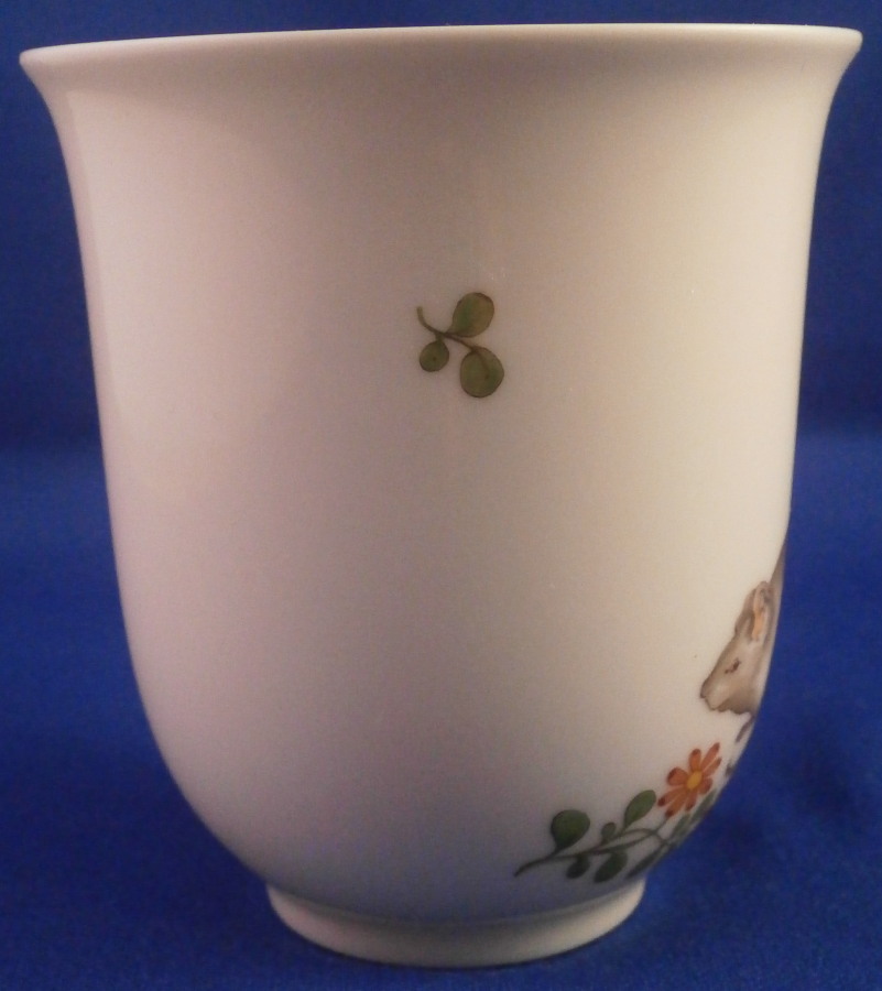 This is a really fun beaker shaped cup made by Augarten during the late 20th or even early 21st century. The design I found on a set of dishes called the Children's dream that they still produce though this shape cup was not part of the catalog . The design is reminiscent of their early days during the Du Paquier period of the 18th century. It has the superb little mouse to the front with a flower with its stem and leaves right next to is, another flower below and to the other side and two single leaves as well. I think the mouse is superb cute and not something you come across often at all. The cup is just over 3 inches tall and has a diameter of 2.75 inches. It is in perfect condition and is marked underneath with the blue shield with the crown on top as well as the word Wien underneath, Augarten Vienna Handpainted as well as some numbers as shown. Please email me for more information or photos.