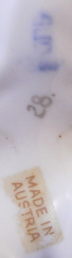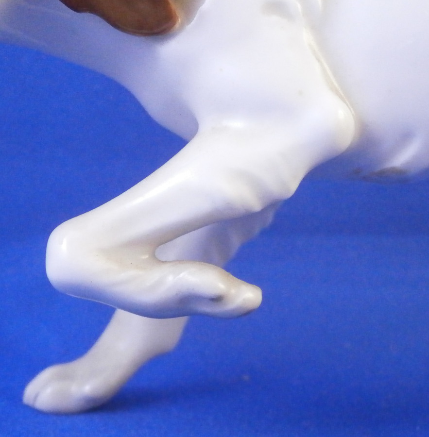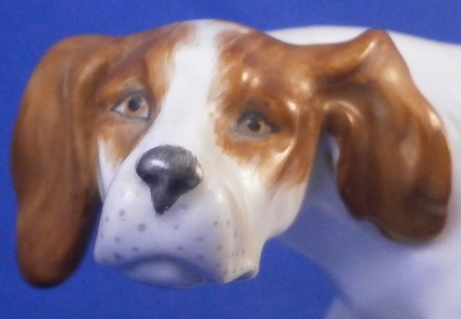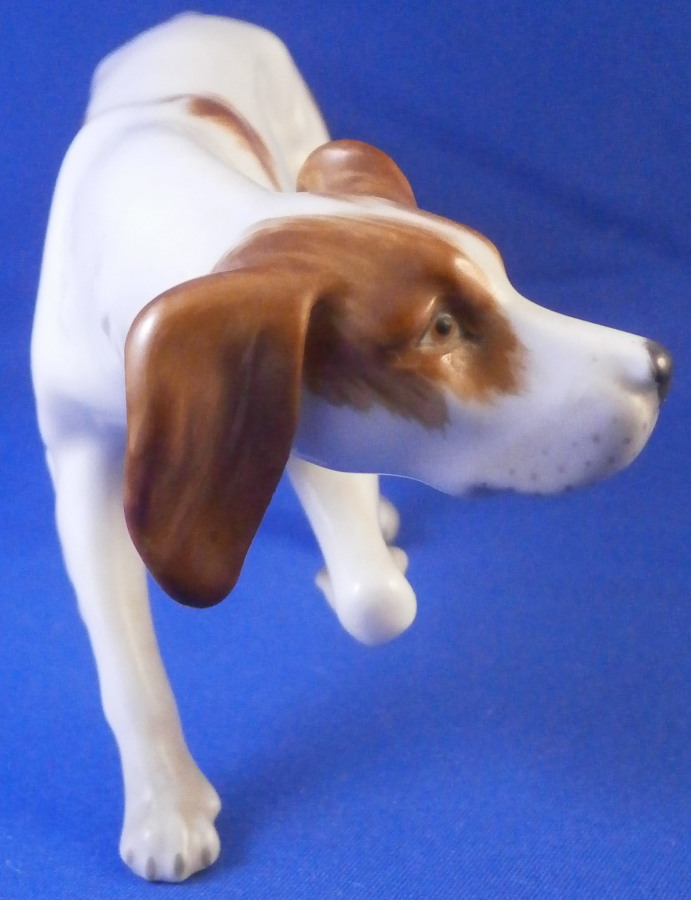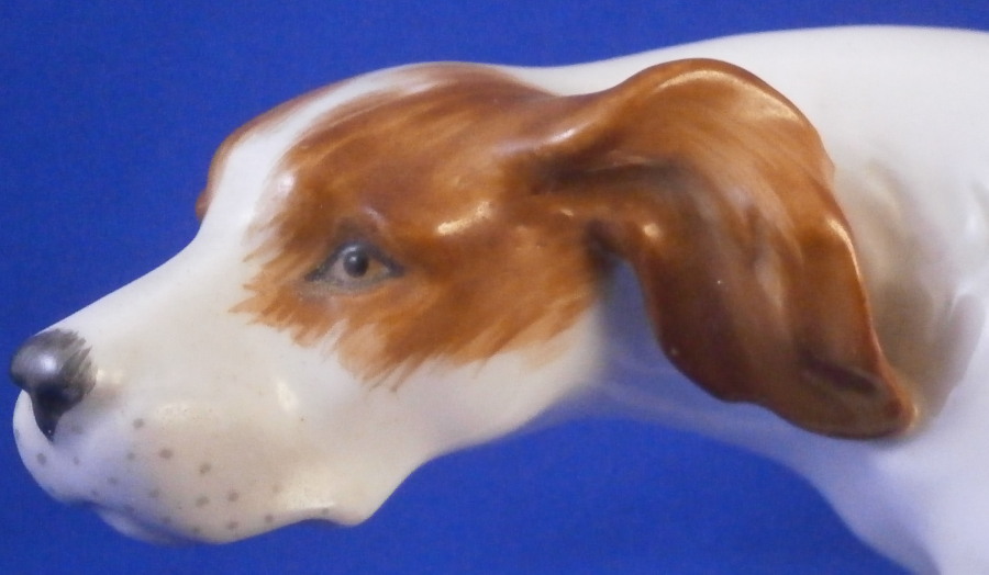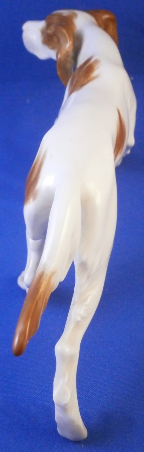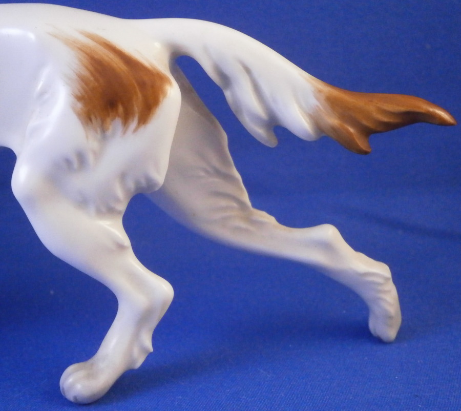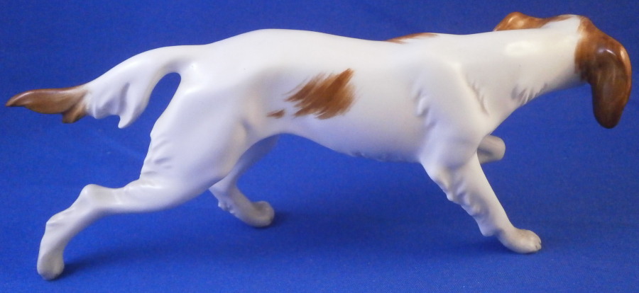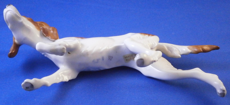 This is a really superb figurine of a dog made by Augarten around the early to mid 20th century. A nice early piece for this maker as it has the Made in Austria mark in red added after firing and no model number yet though it would be 1670. I think he is a setter though don't hold me to that as I am not very good with dog breeds. The figure is superbly modeled and full of motion and little details and hand painted with brown patches. The figurine is about 2.5 inches tall, 2 inches wide and 6.75 inches long. Bigger than many of their models. The piece is in perfect condition! There are two ground down spots on his belly not visible when on display from where firing supports were attached when he was made. That is normal! Marked underneath with the blue shield with the crown on top as well as the word Wien underneath (hard to see), Made in Austria in red and a black 28. as a painter's number. A really nice dog figurine and a model you rarely come across! Please email me for more information or photos.