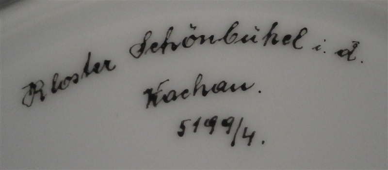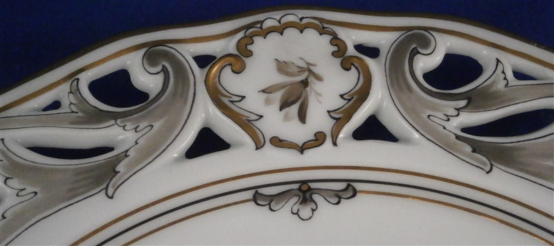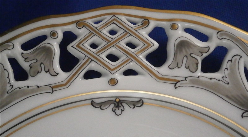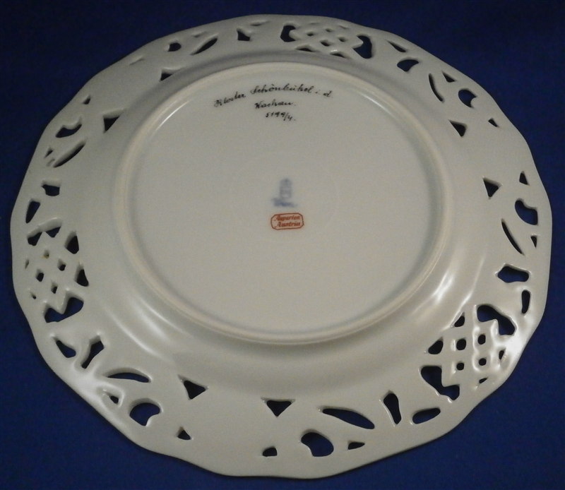 This is a reticulated plate made by Augarten during the original period in the early 20th century. It is handpainted with a superb scene in the center of Kloster Schoenbuehel i.d. Wachau and has a nicely reticulated rim highlighted with a nice design in grey tones and gilding. This rim design is slightly different from the other plate in that it does have the floral cartouches on the rim. The plate is 0.75 inches tall and 7.875 inches in diameter. It is in perfect condition. Marked underneath with the blue shield with the crown on top as well as the word Wien underneath, a black 5199/4. as well as the words Augarten Austria in red in a rectangular box and the title of the scene as shown. A rare plate from the original period. Please email me for more information or photos.