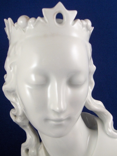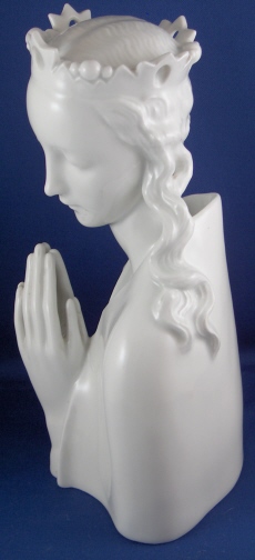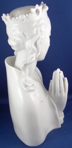 This is a bust of the Madonna wearing a ray wreath made by Augarten during the original period in the 1930's. This piece was designed by Ida Schwetz-Lehmann in 1933 and this peice was manufactured during that time which makes it much rarer than the later pieces. The figurine is 9.25 inches tall, about 4 inches deep and 5.75 inches wide so she is the largest of the 3 versions. Marked underneath with the blue shield with the crown on top as well as the word Wien underneath and the red Augarten Austria in a rectangle. She is in perfect condition with a small firing crack from the making on the sleeve of her right hand hard to spot and not important since she is still a first choice piece. Also impressed are the number 1715 over 3 and ISL - the artist initials. Please email me for more information or photos.