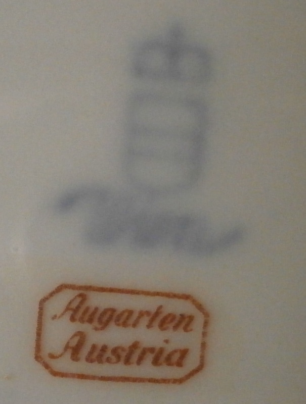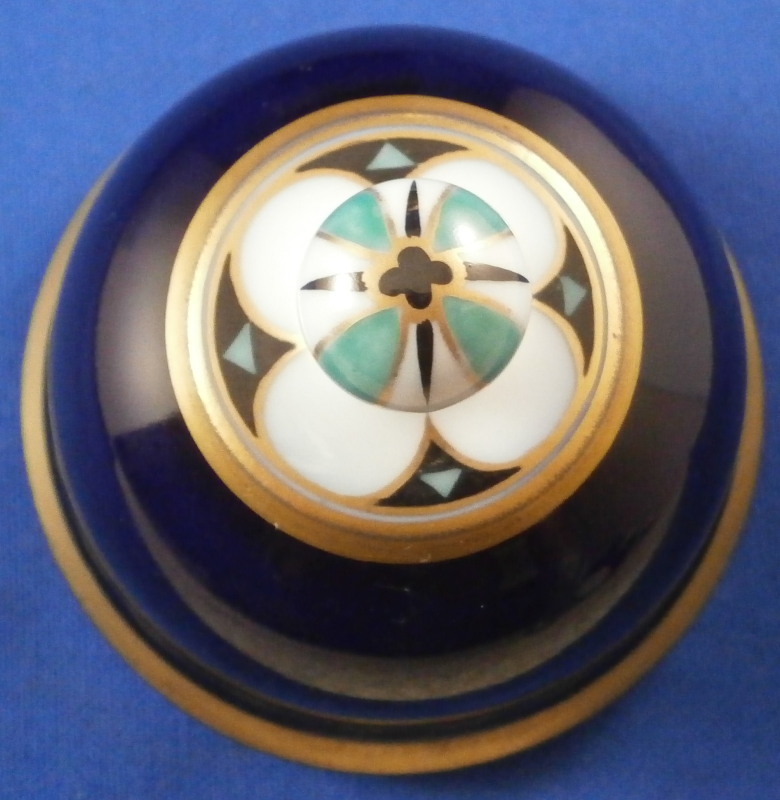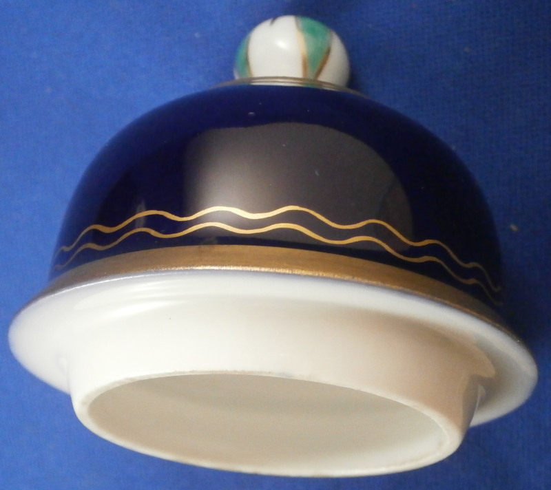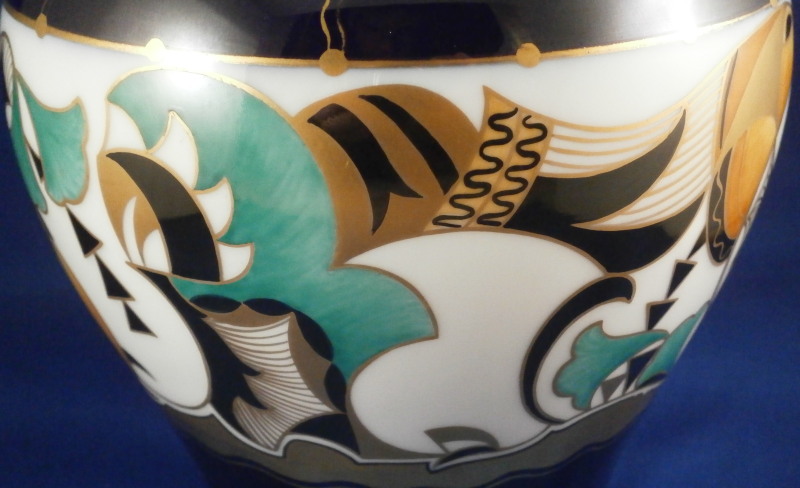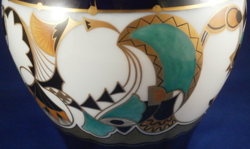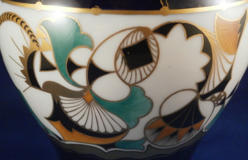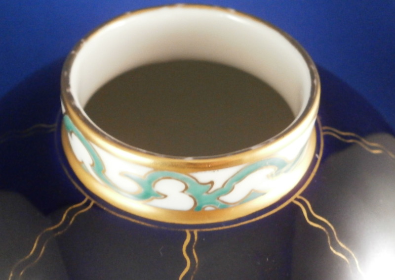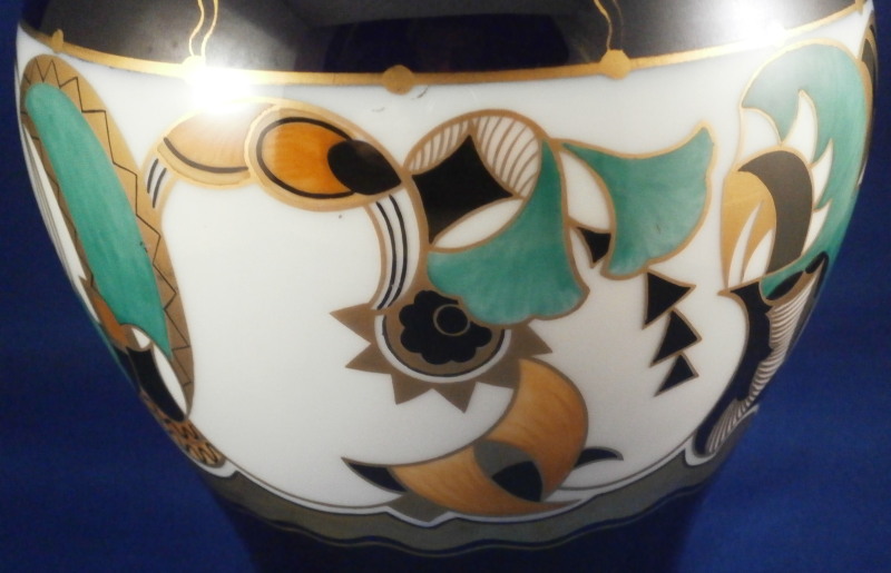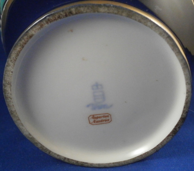This is a superb lidded vase made by Augarten during the original period of the 1920's. A model you won't see often and so early it does not have the normal impressed model number yet. This would be model number 106 . It is superbly hand painted with an Art Deco design in in green, orange, black with gold highlights in the center section, a cobalt blue ground to the bottom and top section with some more gilding to that and a nice green and gold design to the top rim. The lid has the same cobalt blue ground with gilding and a nice design to the top and the finial. A reallys tunning piece and almost impossible to find from this period. The vase with the lid in place is 8.5 inches tall and has a diameter of 5.5 inches. The top opening is has a diameter of 2.25 inches. The vase and its lid are in superb condition with some minor gold wear on the top edge as well as to the gold trim on the cobalt blue background of the top section. One minor spot of wear to the black trim of the central section. It is marked underneath with the blue shield with the crown on top as well as the word Wien underneath, Augarten Austria in a red rectangle. Please email me for more information or photos.