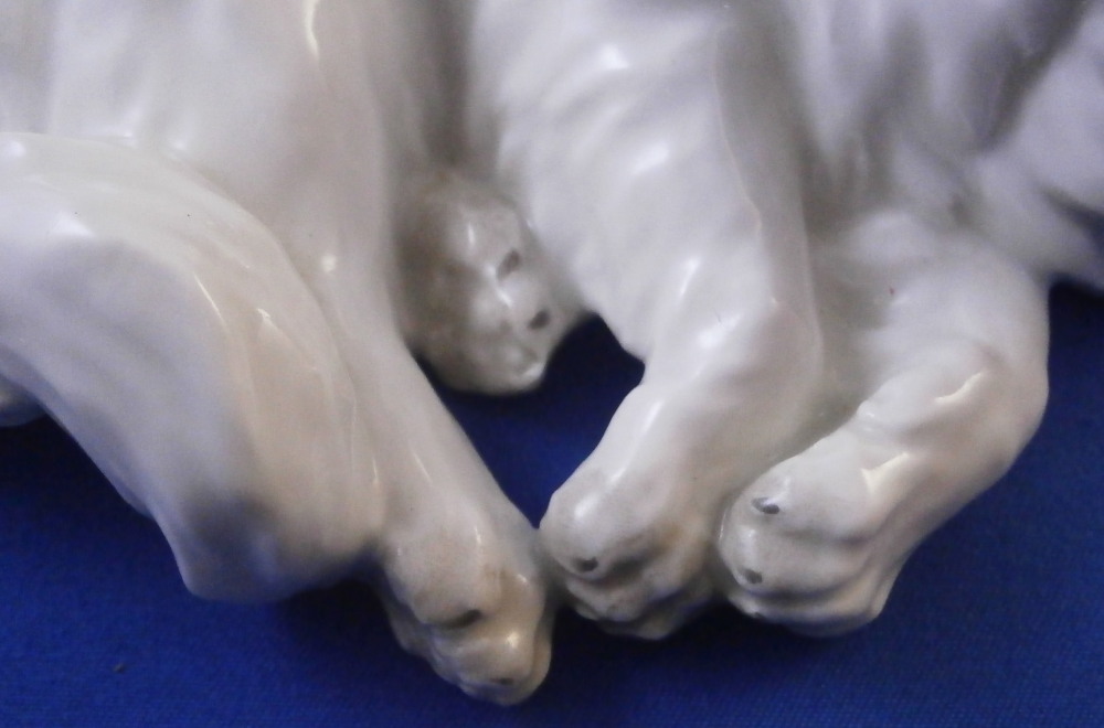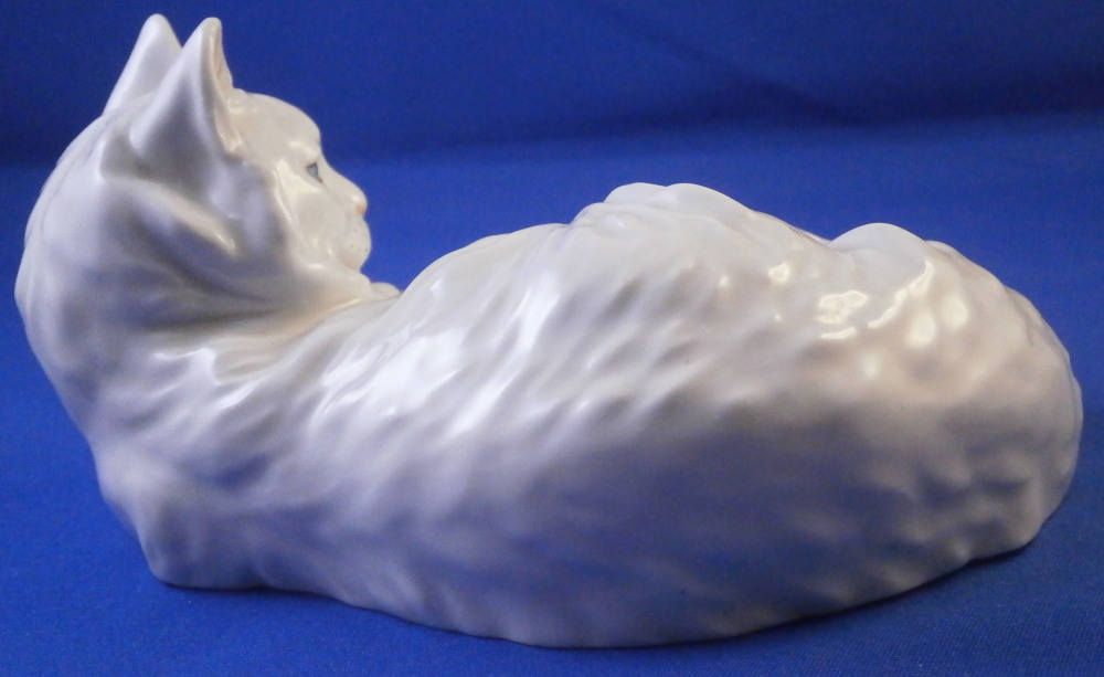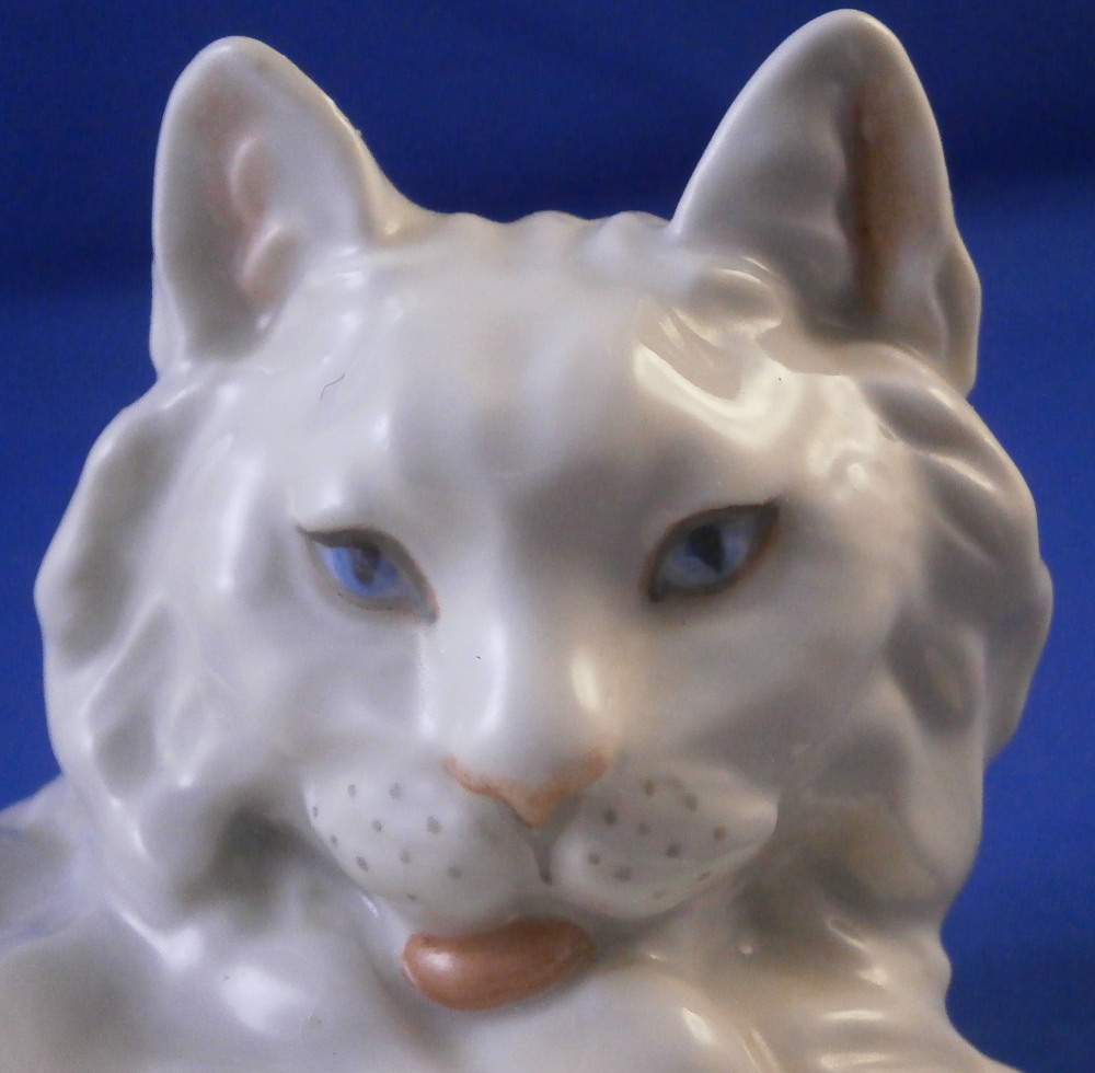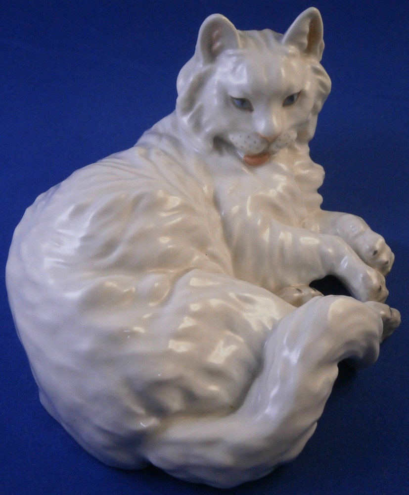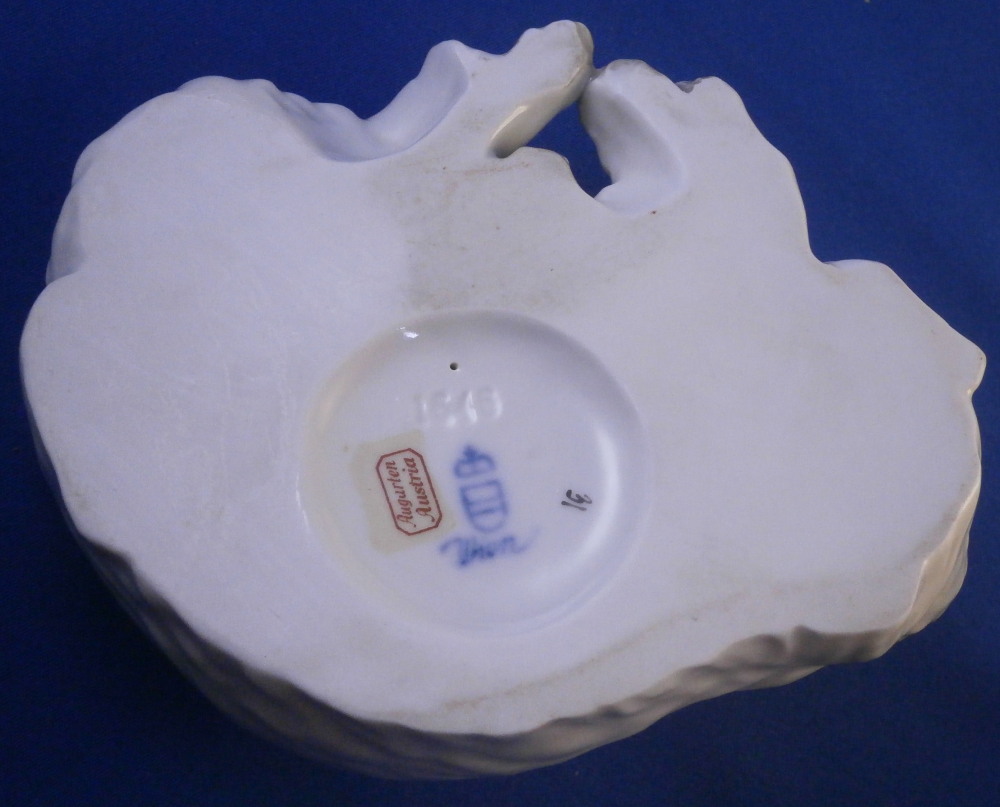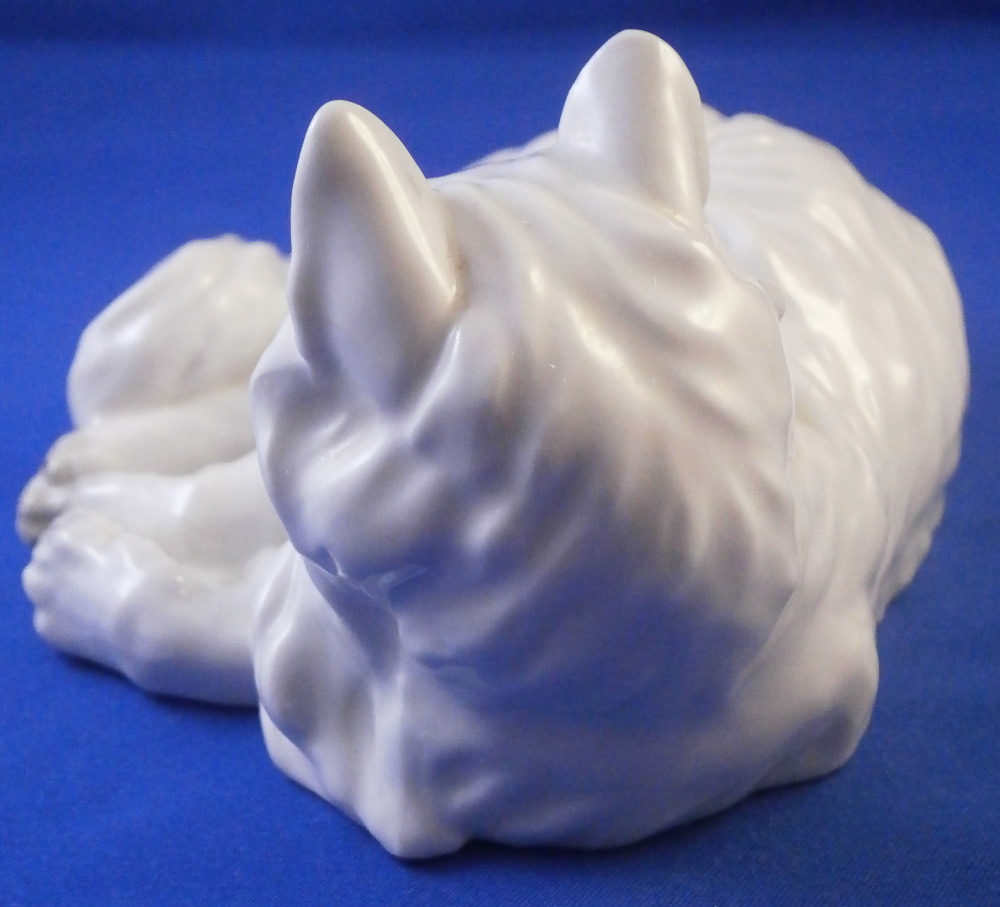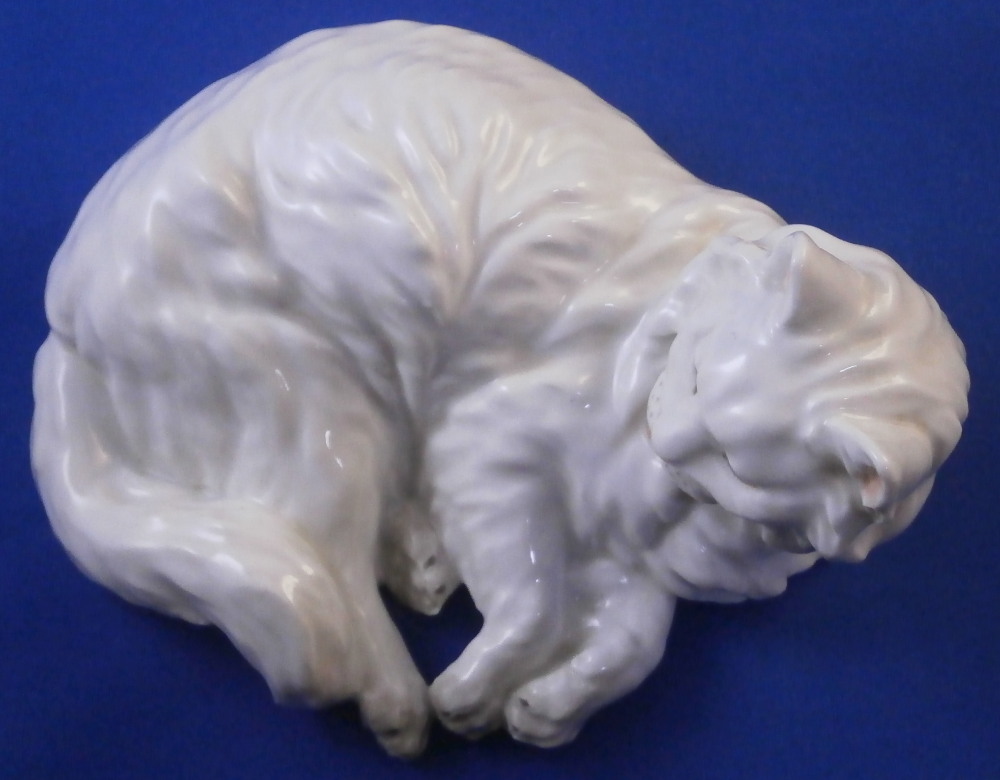 This is a really nice figurine of a cat made by Augarten during the original period in the earlier 20th century. It is in a very typical pose for a cat with it lying down while cleaning itself. The figure is nicely modeled with lots of detail and hand painted just enough to make it super cute. A bit of color to the face and paws is all it takes to look amazing! The cat is 2.5 inches tall, 5.125 inches wide and 4 inches deep. The figure is in perfect condition and is marked underneath with the blue shield with the crown on top as well as the word Wien underneath, black painter's number 31, impressed number 1646, as well as made in Augarten Austria in a red rectangle as shown. Please email me for more information or photos.