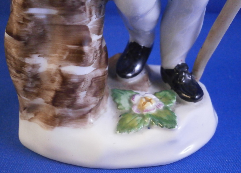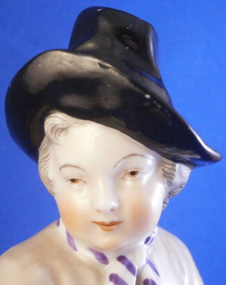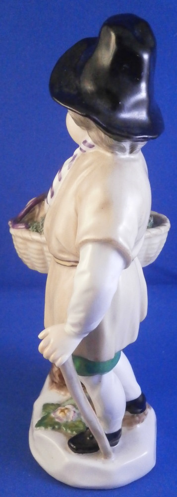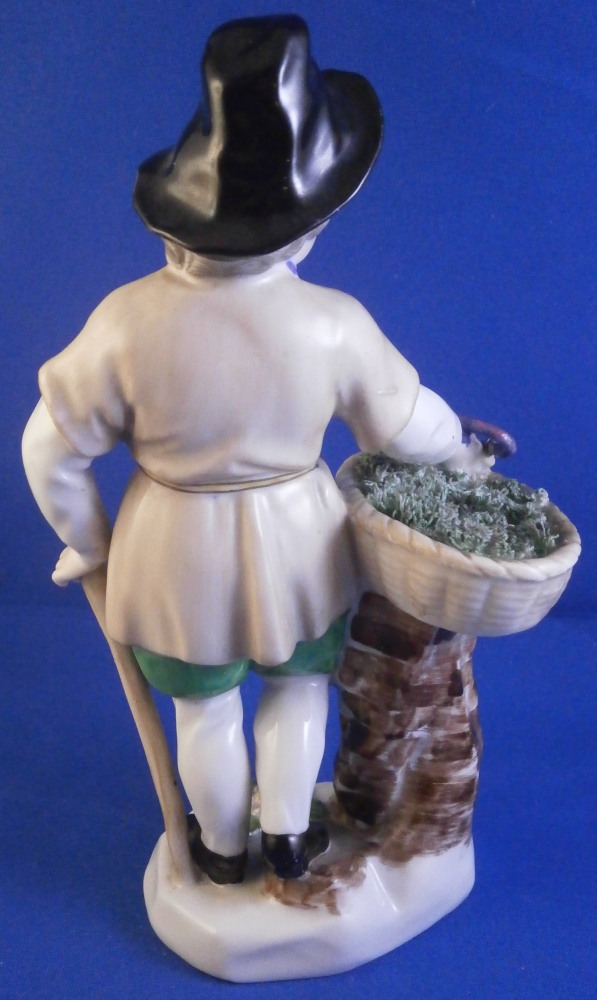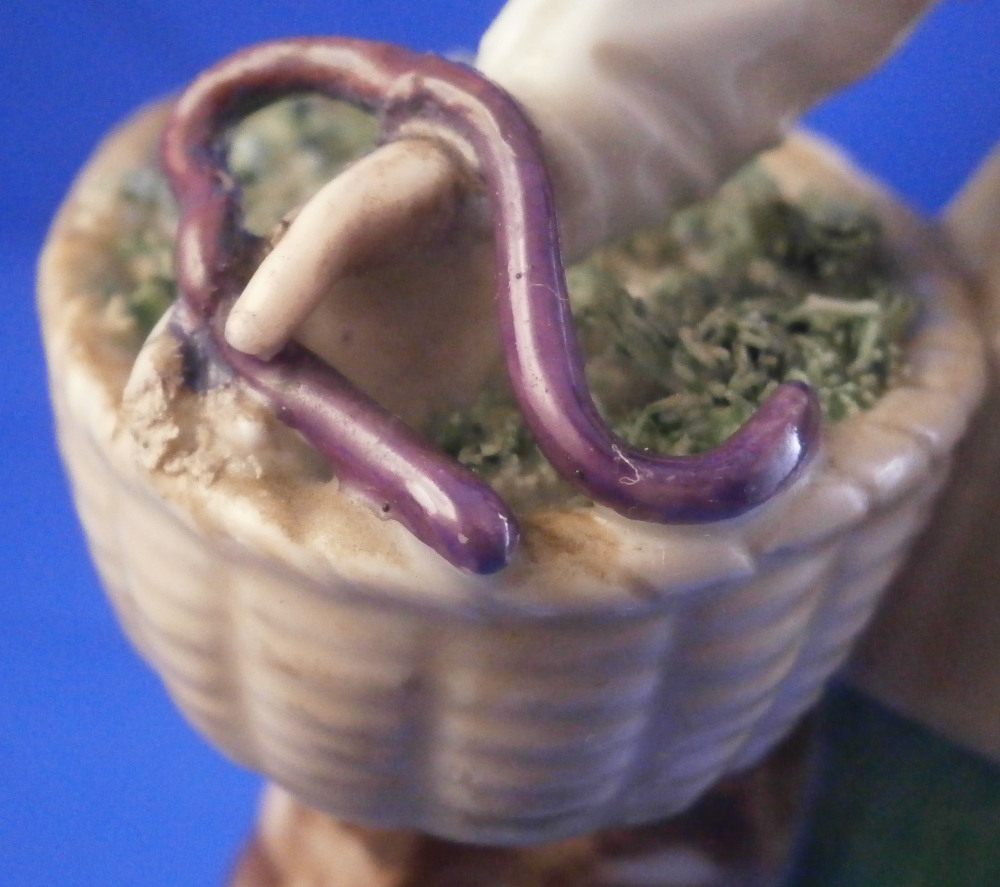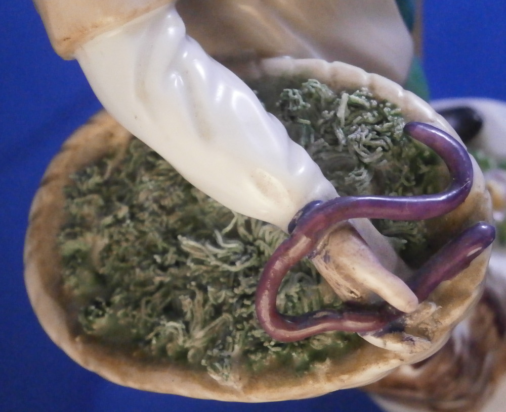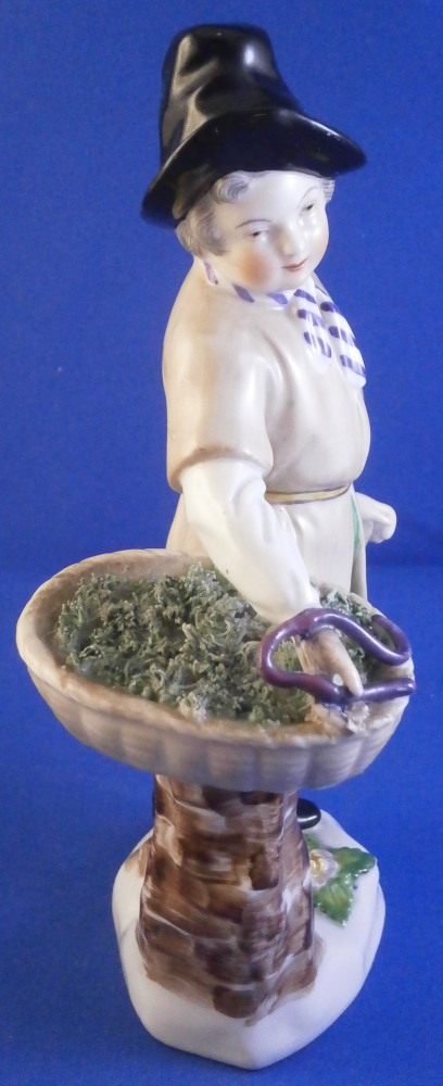 This is a figurine of a gentleman with a basket by his side made by Augarten in the early 20th century during the original period he was first designed in. The figure is of a street vendor and he is meant to be selling eels but if you'd like to bring him into the 21st century we could just say he is selling Kale :) The eels are covered in the greenery to keep them cool and moist with one purplish eel slivering over his hand. He is holding a walking stick in his left, has a flower on top of the base and and is superbly modeled with lots of detail and hand painted to perfection. Really a nice model and one of my favorite ones as well. I own it more than once but this is teh frist I ahve had from the original period. The figure displays nicely but the eel has been restored in the center section that is over his hand and his index finger tip under the eel as well. Impossible to spot when on display! The piece is 6.625 inches tall, 4 inches wide and 2.5 inches deep. Marked underneath with the blue shield with the crown on top as well as the word Wien underneath, Augarten Austria in a red rectangle, the usual impressed marks including the model number 1014, a black painter's number 27 and impressed II (I think). Please email me for more information or photos.