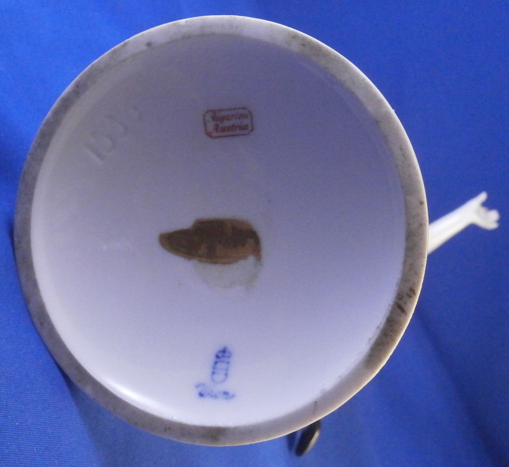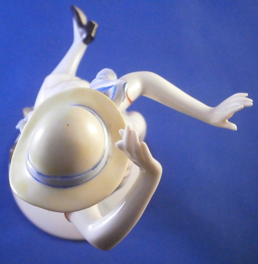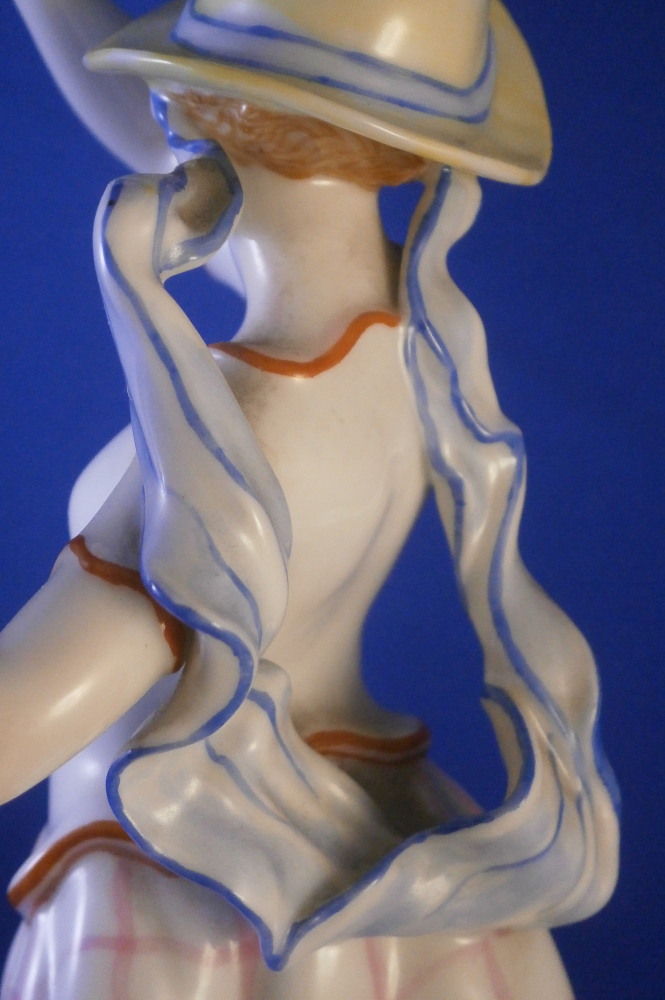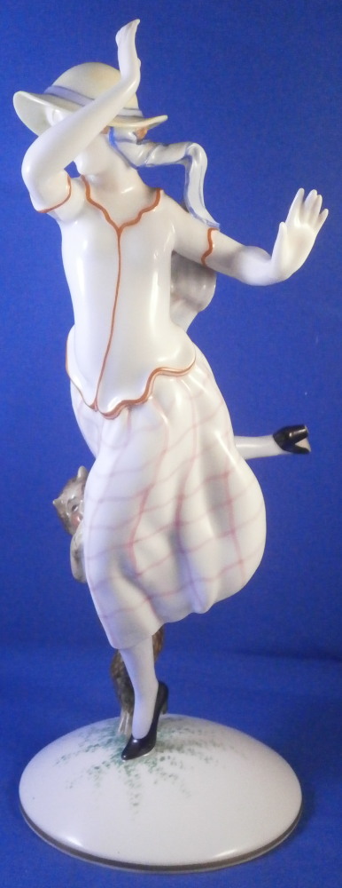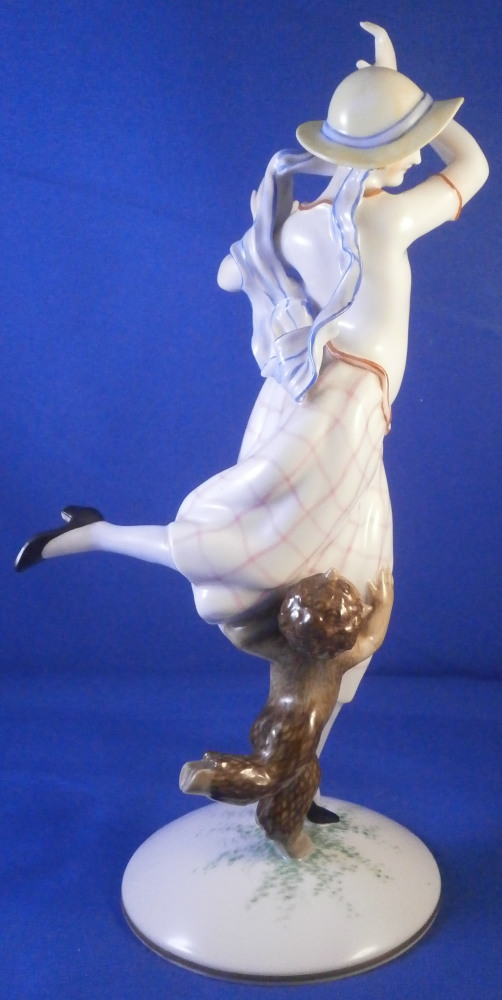 This is a really nice figurine of a lady with a faun by her side made by Augarten in Vienna , Austria. Designed by Carl Schwetz in about 1925 and from the original period. Not a model one sees often at all and the two I did find were restored quite heavily. The figure is of a lady dressed in a cheery outfit dancing with a little faun holding onto her skirt and also dancing. A very typical figurine for this maker and period. They are great and rather hard to find! Superbly modeled and hand painted. The piece is in good condition with just the index finger of the upper (left) hand missing a piece as shown. The location and it not being terrible make it not obvious at all when on display and if need be this would be an easy fix for a decent restorer. The figurine is 9.25 inches tall, 4 inches wide and 4.125 inches deep. Marked underneath with the blue shield with the crown on top as well as the word Wien underneath, Augarten Austria in a red rectangle and impressed model number 1533 plus the remnants of an old sticker. Please email me for more information or photos.