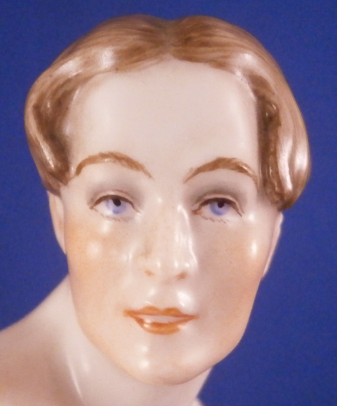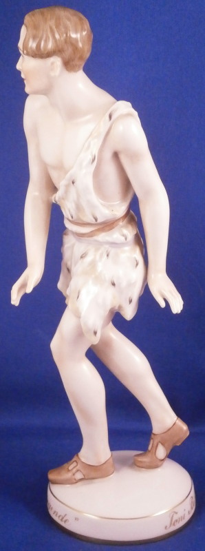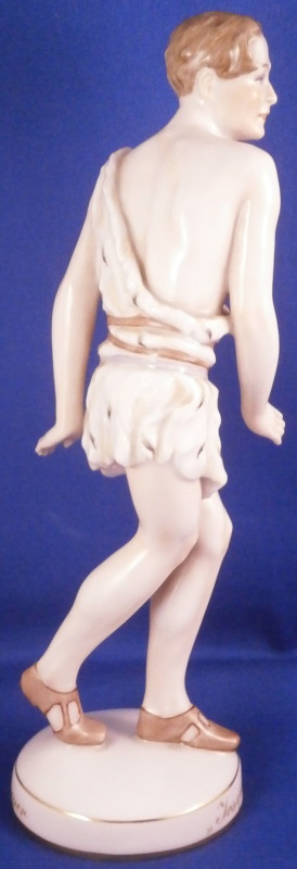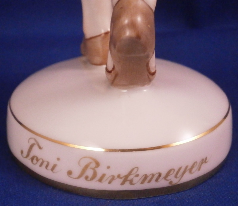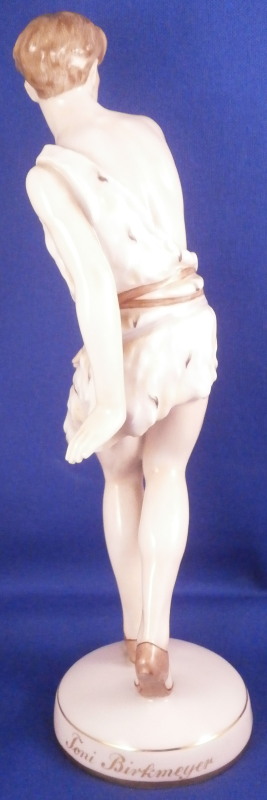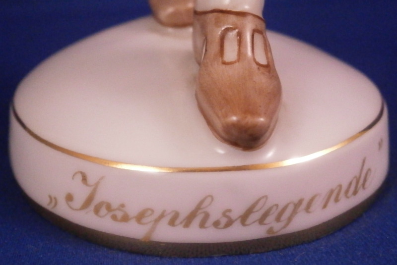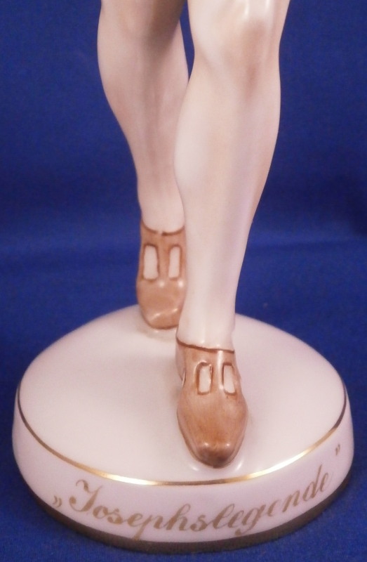 This is a rare and superb figurine designed by Mathilde Jaksch in the 1920s and made by Augarten during the original period around this time. It is of the dancer Toni Birkmeyer (Anton Heinrich Birkmeyer) who was the first Solo dancer and Ballet director of the Vienna State Ballet / Opera. This here shows him in the Josephslegende (The Legend of Joseph) which is a ballet in one act for the Ballets Russes based on the story of Potiphar's Wife, composed in 1912–14 and premiered at the Paris Opera in 1914. One can find this model in white but I have never come across it in the painted version and could find another one during my research. A nicely modeled piece that is hand painted to perfection. The figure is in perfect condition. The piece is 8 inches tall, 2.25 inches wide and 2.5 inches deep. Marked underneath with the blue shield with the crown on top as well as the word Wien underneath, Augarten Austria in a red rectangle and the impressed number 1627. The base has the words Toni Birkmeyer and Josephslegende written in gold on the outside edge. Please email me for more information or photos.