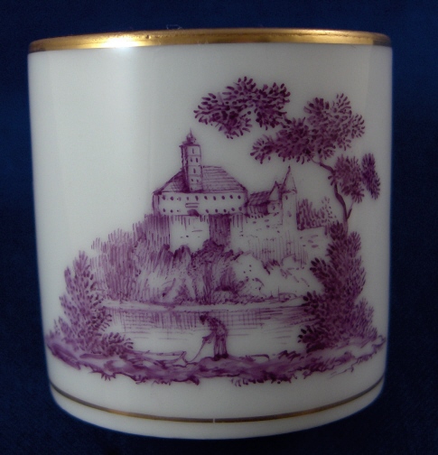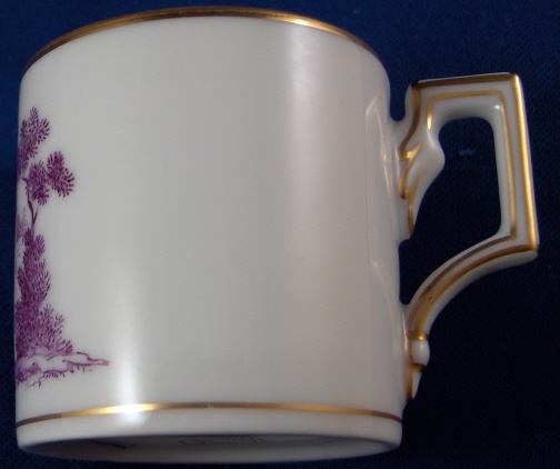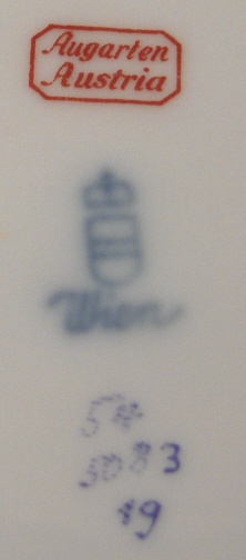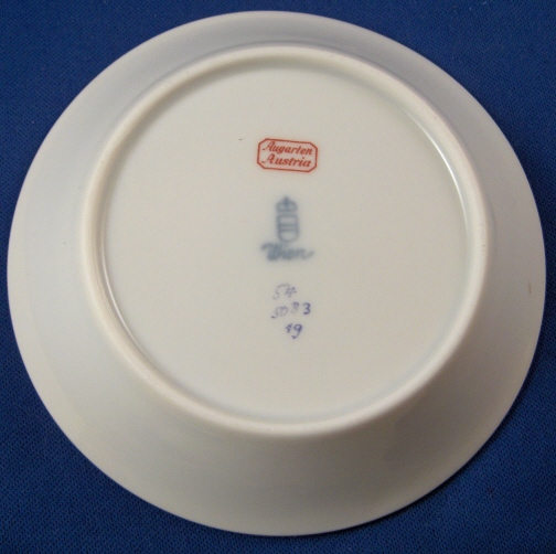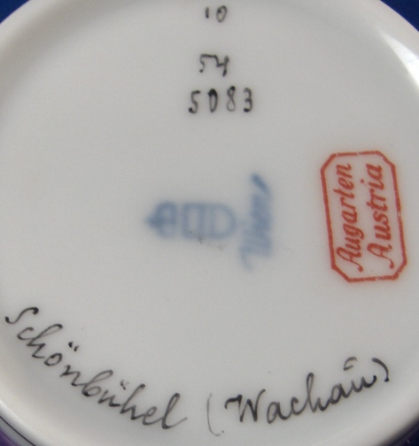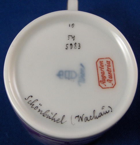 This is a cup and saucer made by Augarten during the original period in the early 20th century. The cup is handpainted with a superb puce scene depicting a castle by a river called Schloss Schönbühel . It has a nice gold trim to the inside top rim. The saucer has the same gold trim. These original pieces are hard to find and highly collectible! The cup is 1.875 inches tall and 1.875 inches in diameter. The saucer is 0.75 inches tall and just under 4.25 inches in diameter. The set is in perfect condition. Marked underneath with the blue shield with the crown on top as well as the word Wien underneath, a black 10, 54 and 5083 as well as the words Augarten Austria in red in a rectangular box. Underneath also Schoenbuhel (Wachau) in black. A rare cup and saucer from the original period! Please email me for more information or photos.