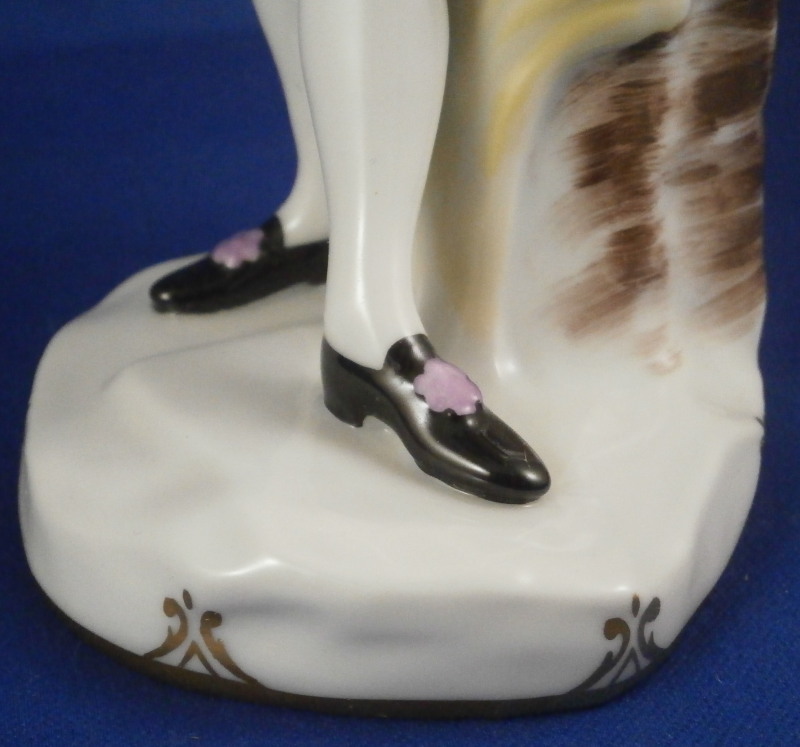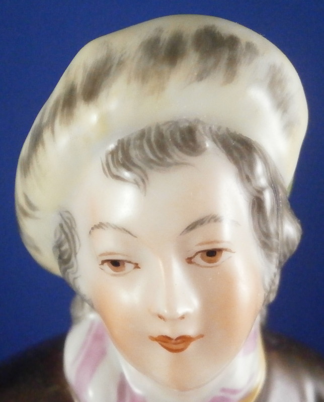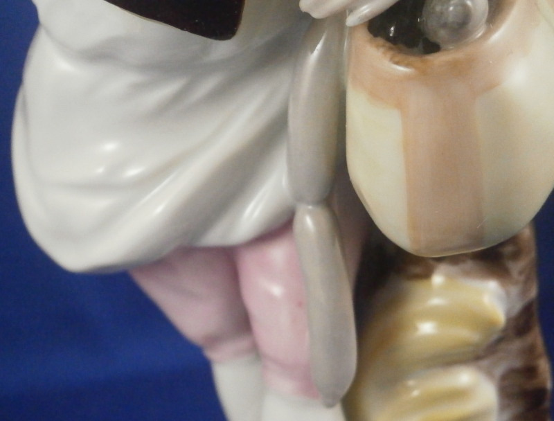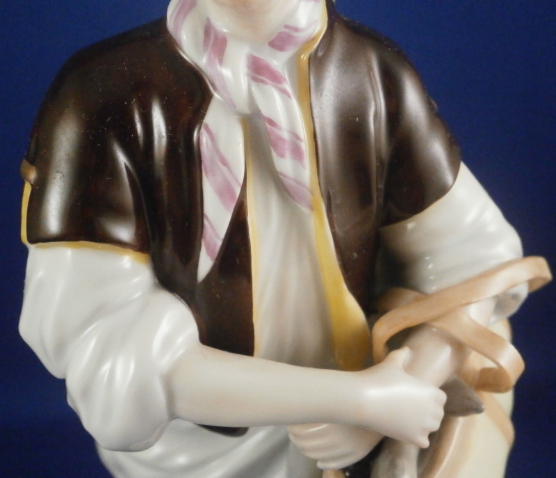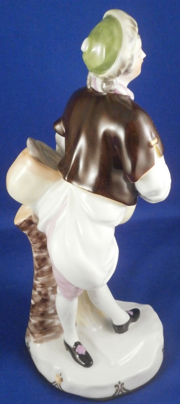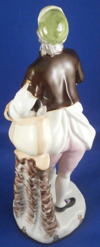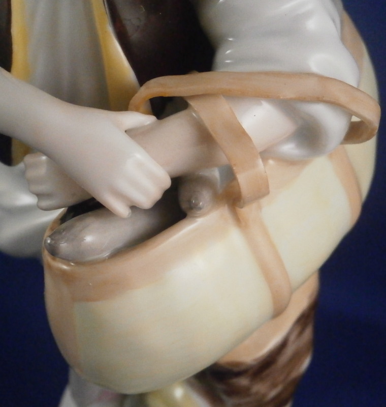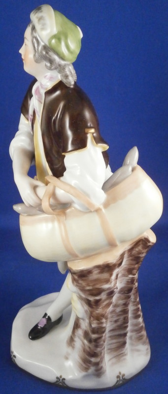 This is a figurine of a gentleman street vendor based on the original Cris de Paris series from the 18th century Vienna model made by Augarten in the early 20th century during the original period. He is a salami seller and is holding a basket on his left arm filled with salamis. Nicely dressed and leaning against a tree stump on a typical Vienna base with some nice gilding on the edge. A very well modeled figure with lots of superb hand painted detail all around. The figure is in perfect condition which is always a bonus. He is 7.875 inches tall, 3 inches wide and 3.125 inches deep. Marked underneath with the blue shield with the crown on top as well as the word Wien underneath, Augarten Austria in a red rectangle as well as the usual impressed marks including the model number 1011 as shown. Painter's number 18. in green. There are two cut marks underneath the Wien name denoting it being a second choice piece possibly due to a tiny faint stray black line mark near his butt on the white apron. Displays perfectly! Please email me for more information or photos.