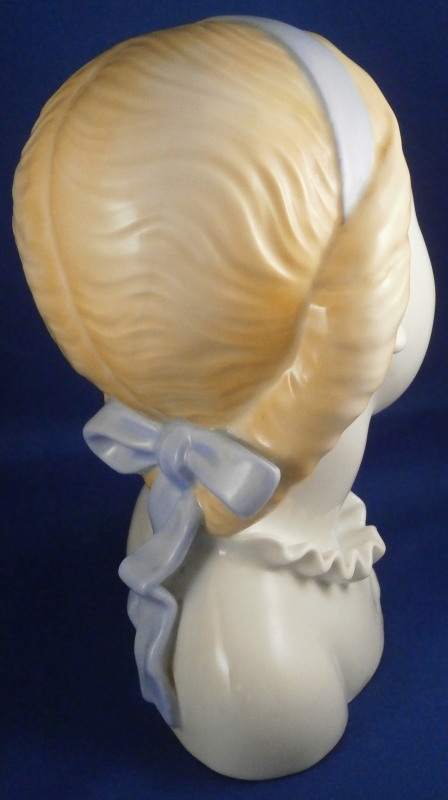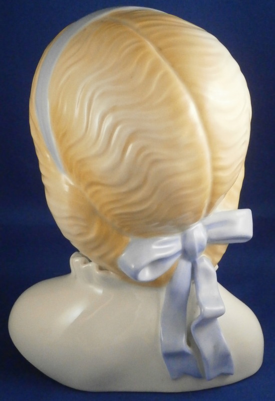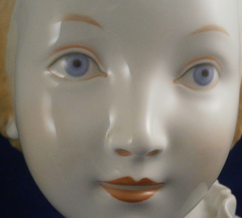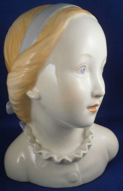 This is a bust of a girl made by Augarten during the mid 20th century. This is the much harder to find painted version. This piece was designed by Ida Schwetz - Lehmann who also designed a few other pieces including the Madonna bust one sees much more often. She also designed a matching boy bust. The figure is nicely modeled and hand painted to perfection. The figurine is 7.25 inches tall, about 4.25 inches deep and 5.25 inches wide. Marked underneath with the blue shield with the crown on top as well as the word Wien underneath, impressed Made in Austria and the number 1750 as well as the letter L. The artist name is incised underneath one of the shoulders only visible when turned over. She is in perfect condition. Please email me for more information or photos.