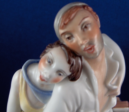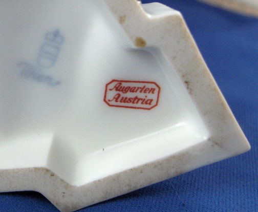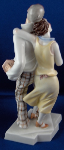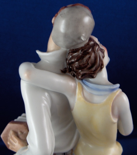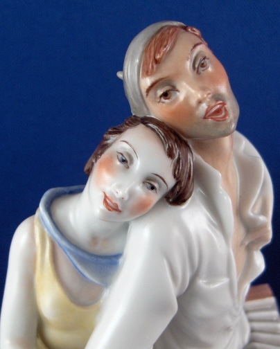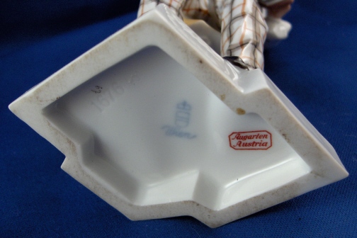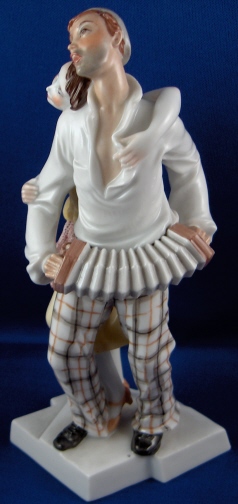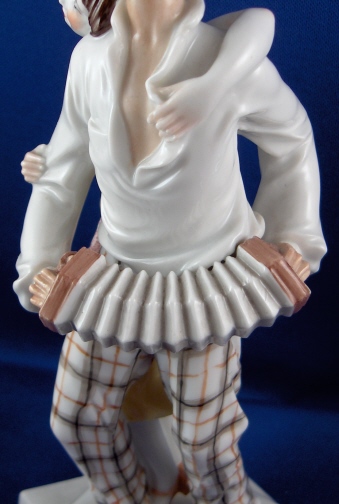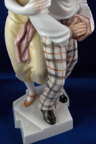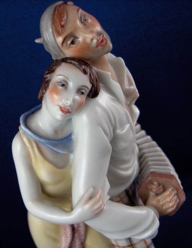 This is a rare and superb figurine titled "Peripherie" which I think was designed by Mathilde Jaksch and was made by Augarten during the original period in about 1930. It is of a man playing an accordion and a lady wearing the typical fashion of the time leaning on his shoulder. A superbly modeled and handpainted piece and I could only find one other which was white and not painted so definitely not a common model! Actually this seems to be the only known painted one! The figure is in perfect condition. The piece is 7 inches tall, 3.5 inches wide and 2.375 inches deep. Marked underneath with the blue shield with the crown on top as well as the word Wien underneath, Augarten Austria in a red rectangle and the impressed number 1676 with something behind it I cannot make out as well as the painters number 67 in black. There are initials incised into the back top of the base I cannot quite figure out but might be LJ. Please email me for more information or photos.