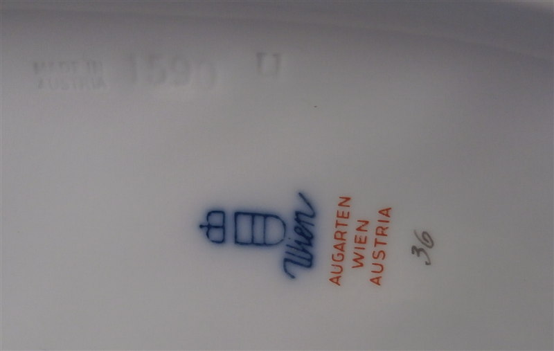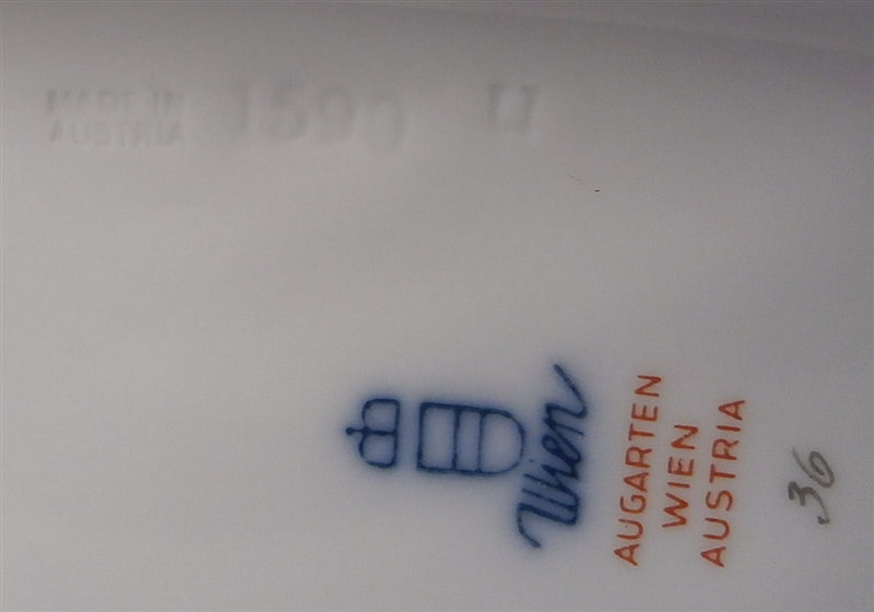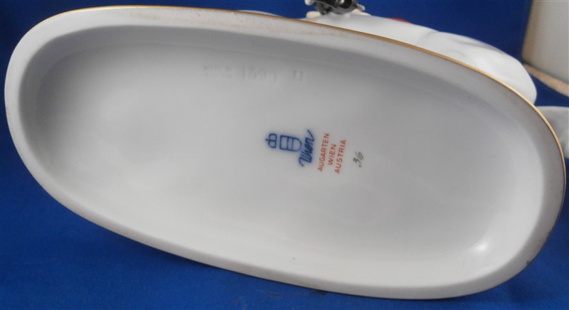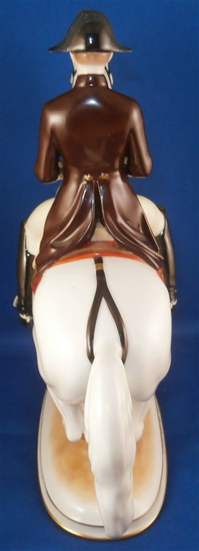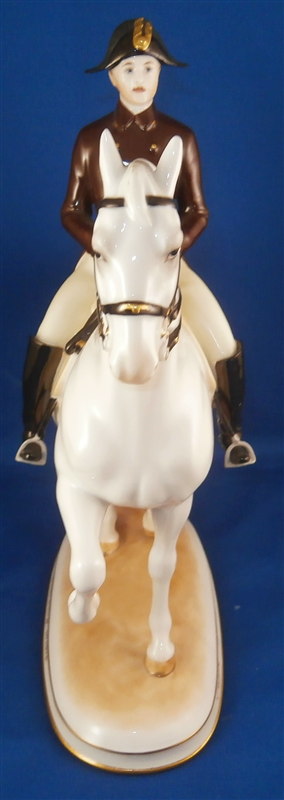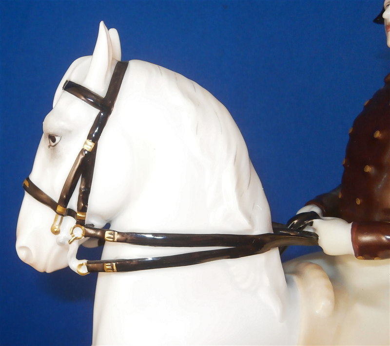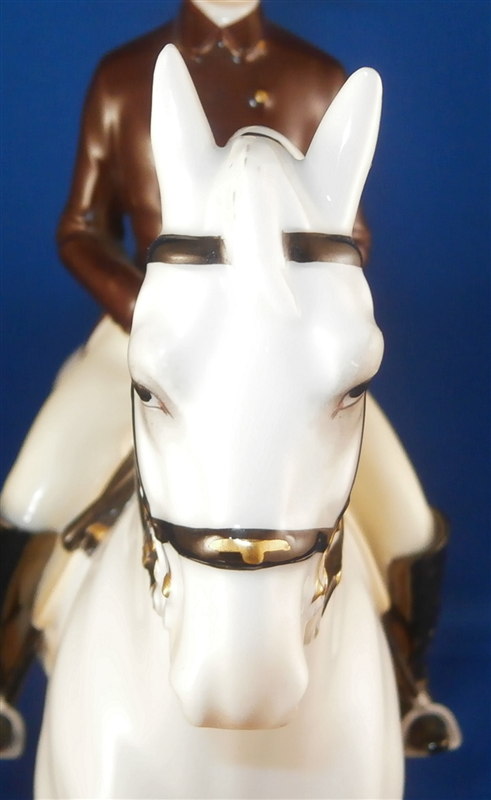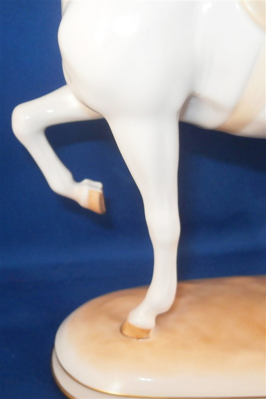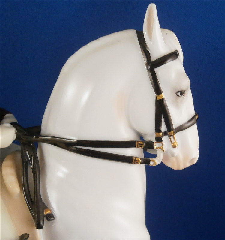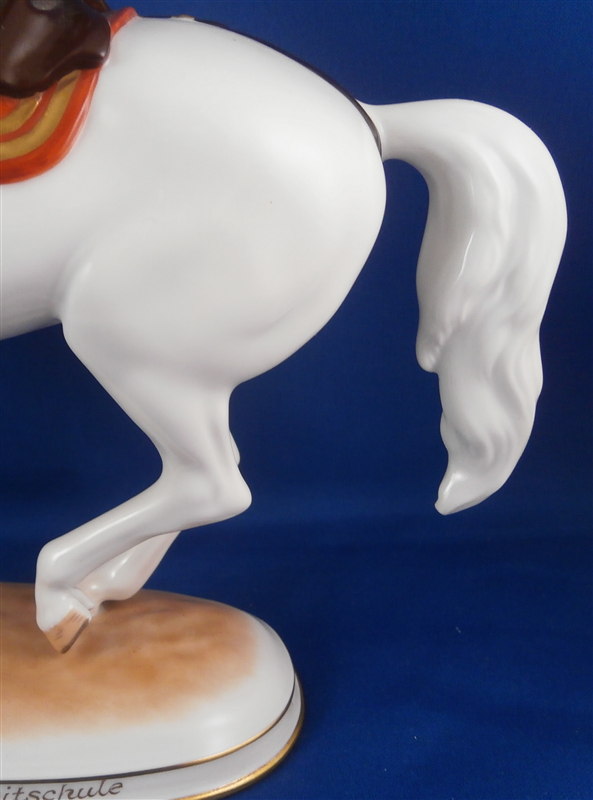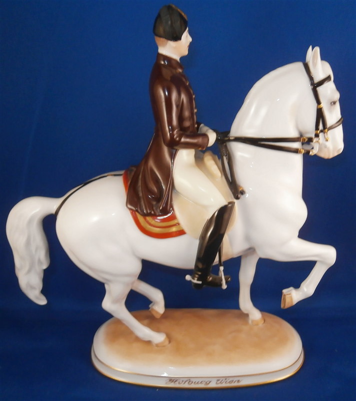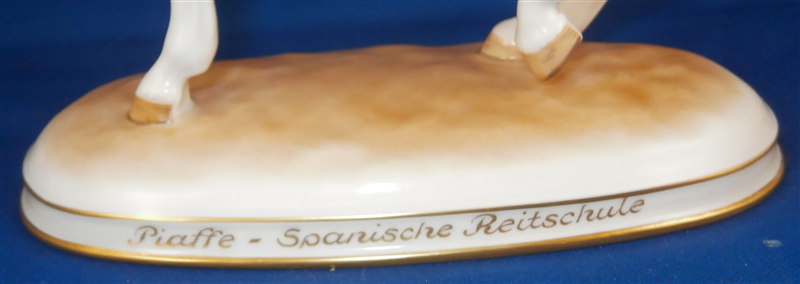 This is a figurine made by Augarten in the 20th century. It is from the series of figures depicting different pieces of the Spanish Riding School in Vienna this one being called Piaffe. Super modeling and painting and one of the harder to find pieces from this set. The figurine is in perfect condition which is always nice as they often ahve some damage to the fragile parts like reigns, ears, stirrups, etc. The figure is 9.5 inches tall, 3.25 inches wide and about 8.25 inches long. The piece is marked underneath with the blue shield with the crown on top as well as the word Wien underneath, impressed letter U, impressed 1590, a grey 36, Augarten Wien Austria in red and Made in Austria impressed. The side of the base reads Piaffe - Spanische Reitschule on one side and Hofburg Wien on the other. Please email me for more information or photos.
