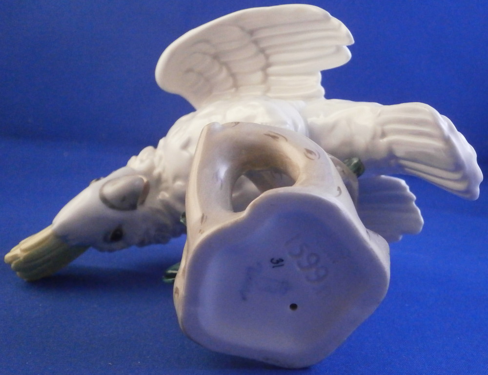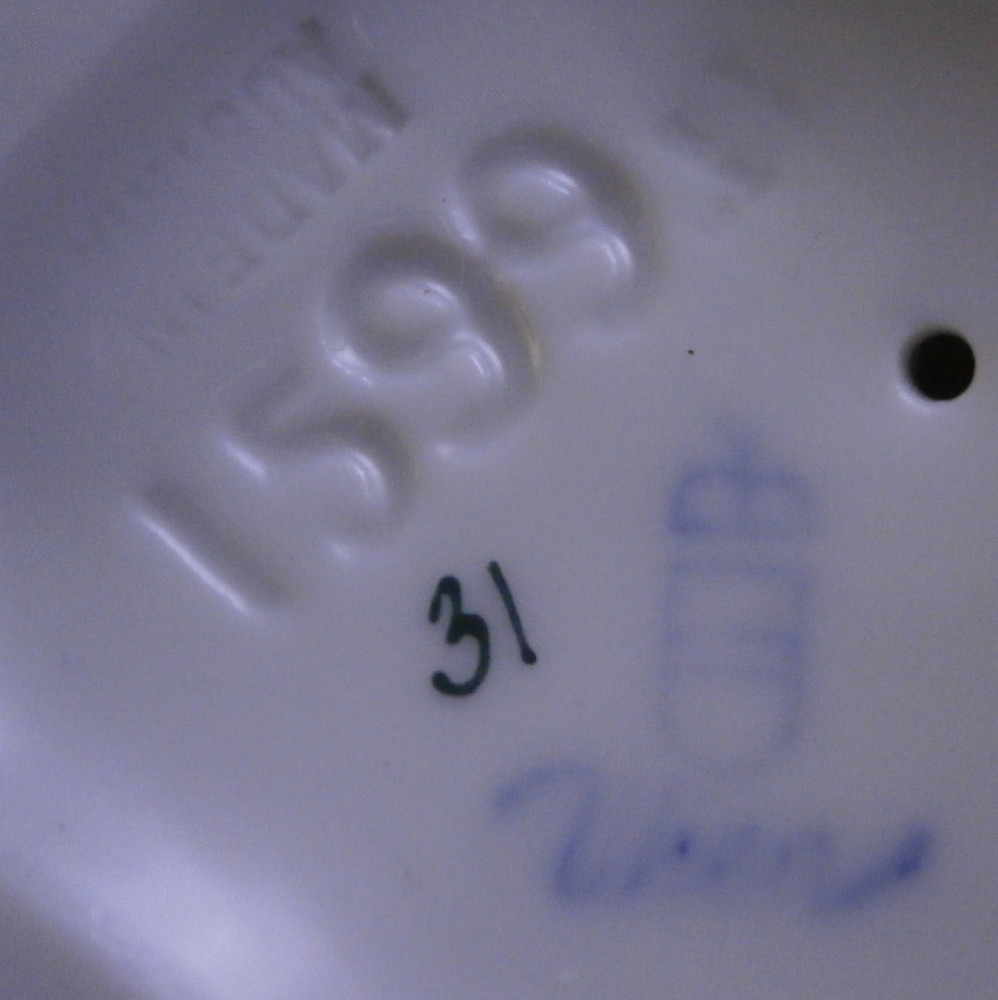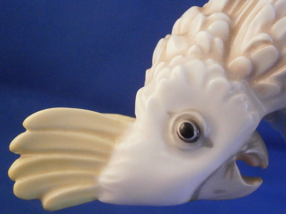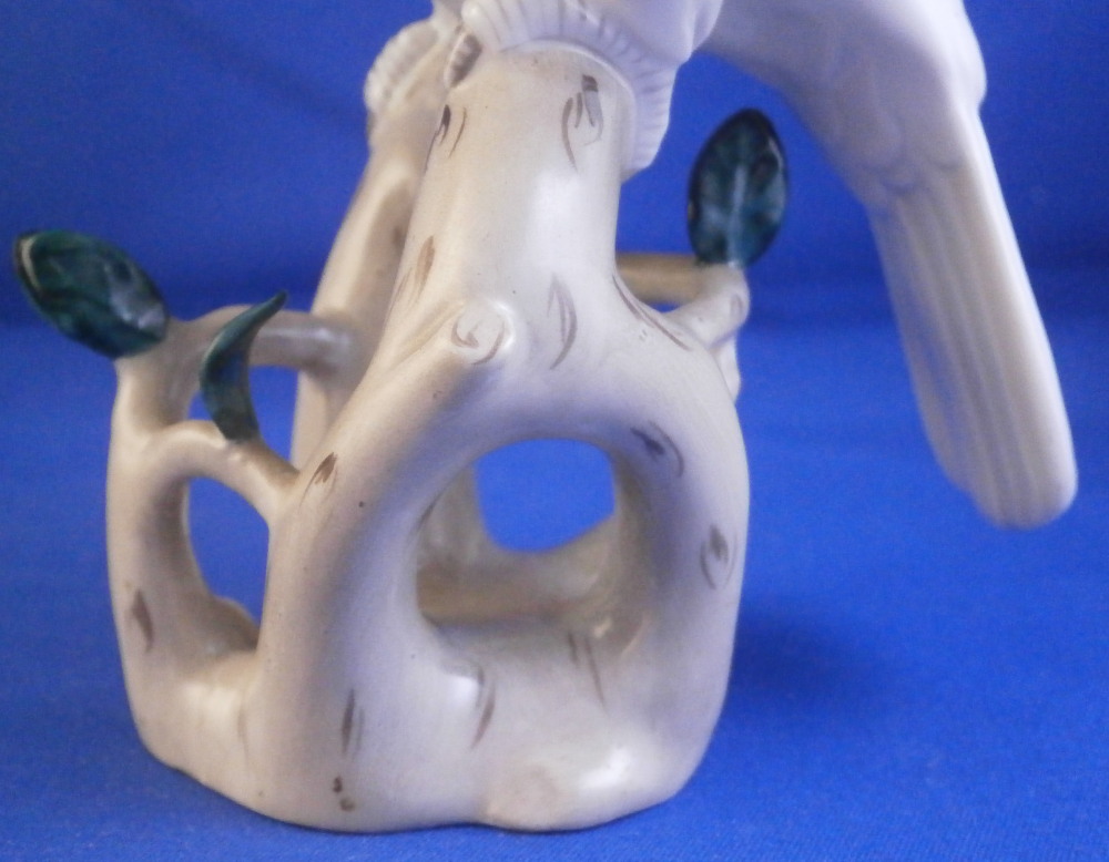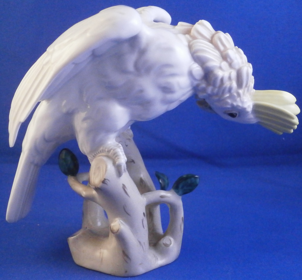 This is a fun Art Deco cockatoo bird figurine made by Augarten during the mid 20th century. The figure is superbly modeled (originally by the famous Mathilde Jaksch ) in a very typical pose for this sort of bird and hand painted with just enough color to make it a very elegant piece. The yellow head feathers and green leaves on the base make the piece stand out and look great! The figure is 4.5 inches tall, 3.75 inches wide and 5.125 inches deep. The piece is in perfect condition! It is marked underneath with the blue shield with the crown on top as well as the word Wien underneath, Made in Austria impressed, a painter's number 31 and the model number 1599 as shown. Please email me for more information or photos.
