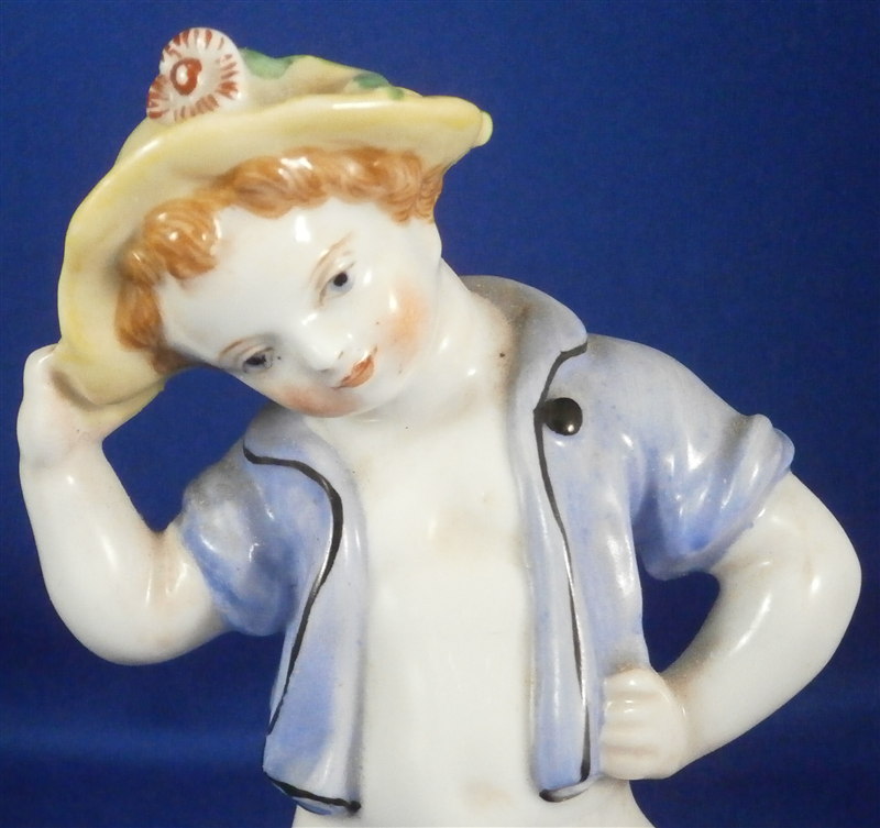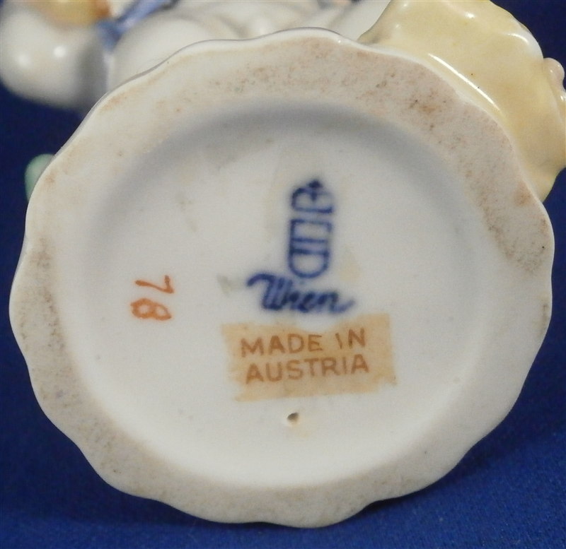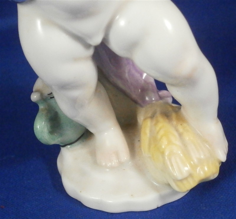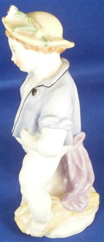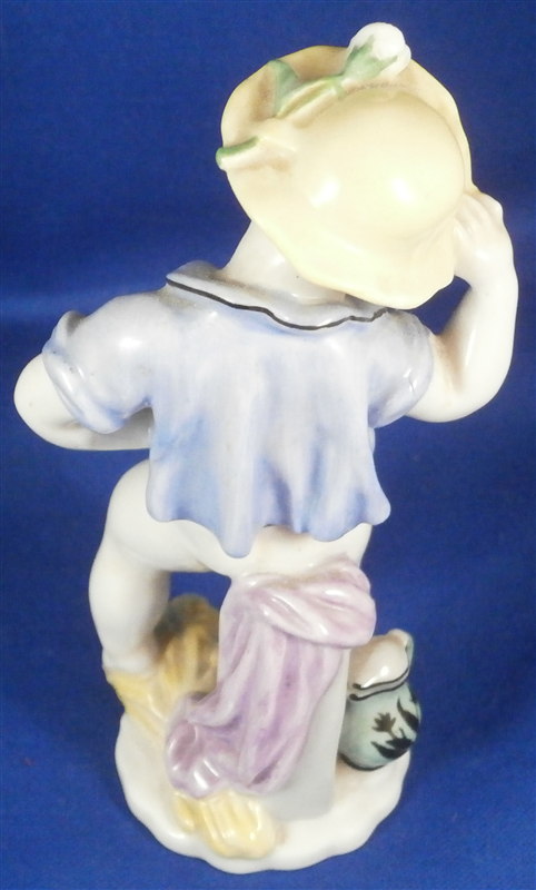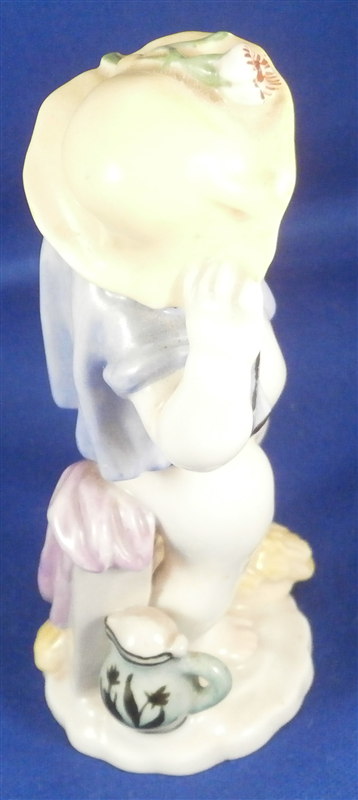 This is a rare and superb figurine designed by the famous Michael Powolny for Augarten in the 1920's. It is of a semi nude putto wearing a blue jacket and a yellow hat with a flower on top standing on a nice base with some wheat by his feet and a water pot next to him. A fun figurine that is superbly modeled and hand painted. A fairly hard to find model especially in perfect condition which is the case here. The figure is 4.5 inches tall, 2.5 inches wide and 1.875 inches deep. Marked underneath with the blue shield with the crown on top as well as the word Wien underneath, a grey number 2, a red number 78 and impressed 1514 and Made in Austria in red above glaze with more of a sticker type design that can be removed. It is probably from the original period with that sort of sticker but I am not 100% on that. Please email me for more information or photos.