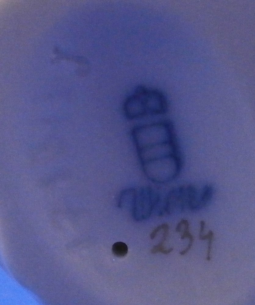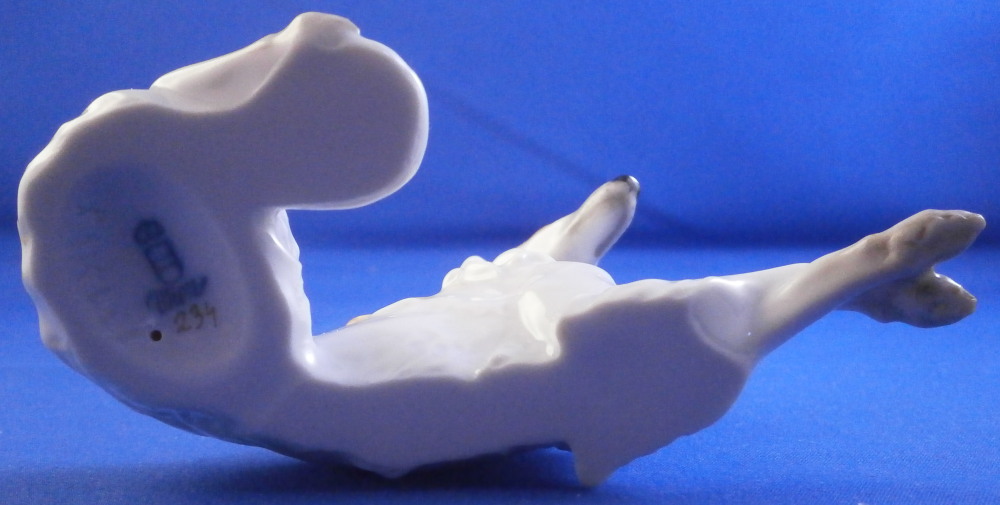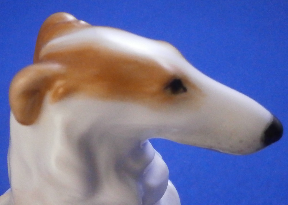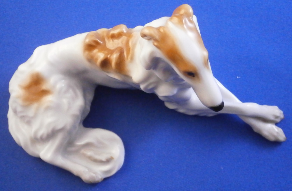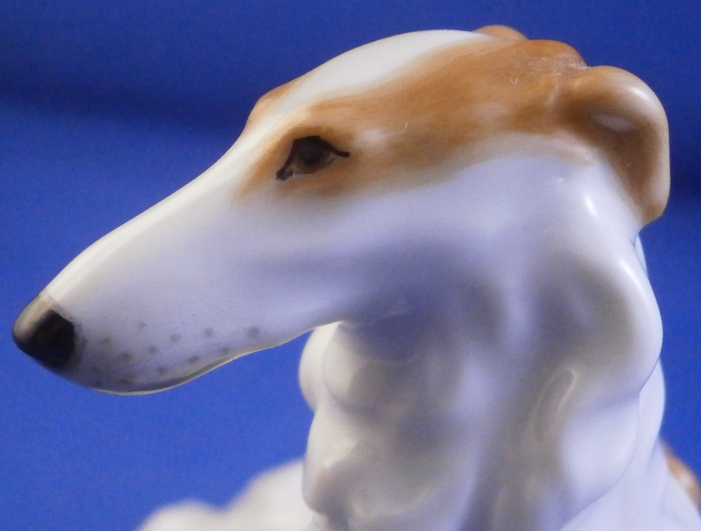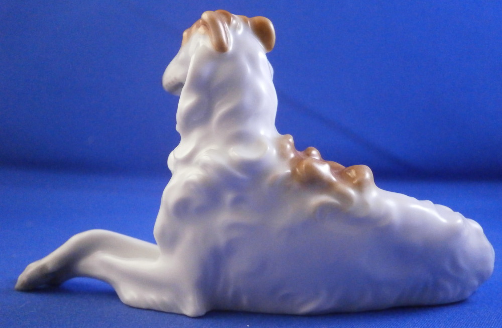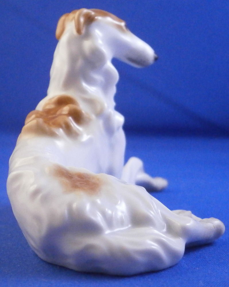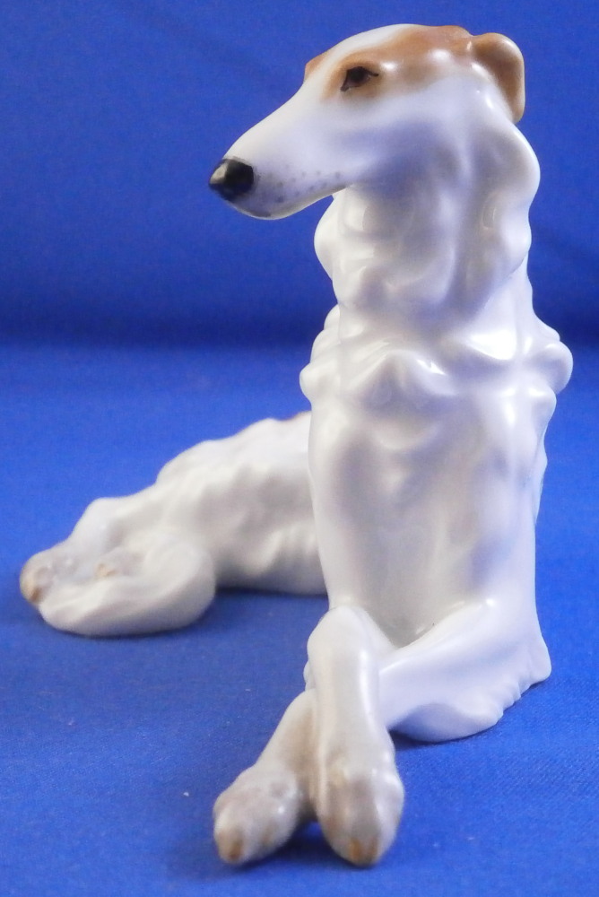 This is a figurine of a Russian Wolf dog made by Augarten in the 20th century. This is the very hard to find brown colored version which looks superb. More color than they usually are! The figure is 2.5 inches tall, 4.5 inches long and 2.125 inches wide. The piece is in perfect condition. Marked underneath with the blue shield with the crown on top as well as the word Wien underneath, a black number 234, impressed number 1713/ I as well as the impressed letter Y (I think). A really cute figurine that is superbly modeled and hand painted! Please email me for more information or photos.