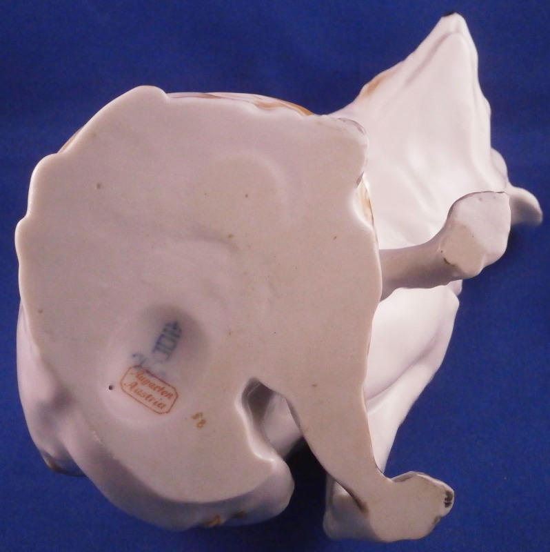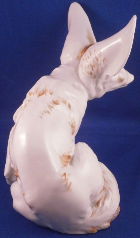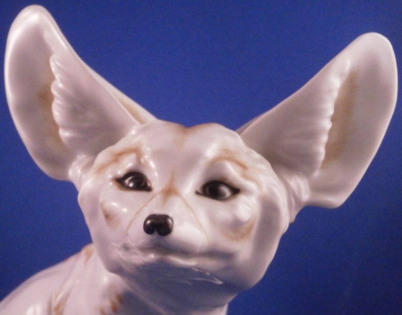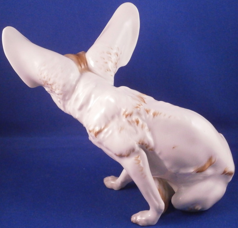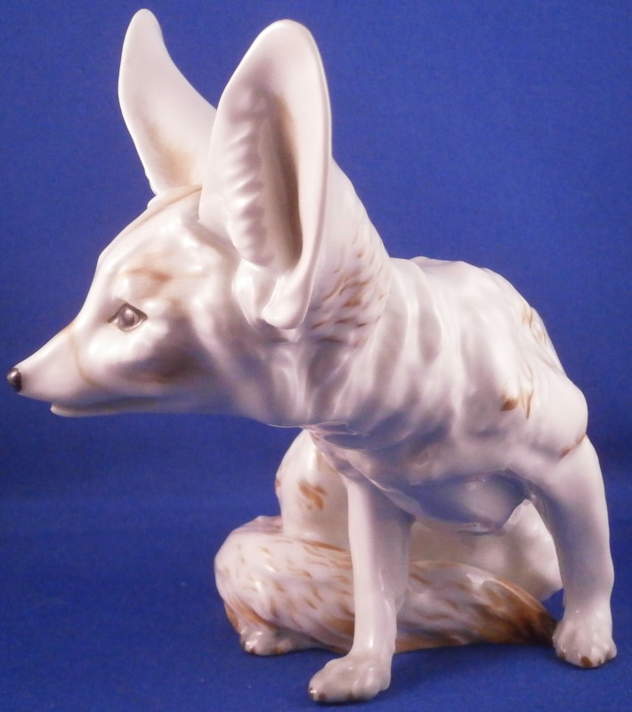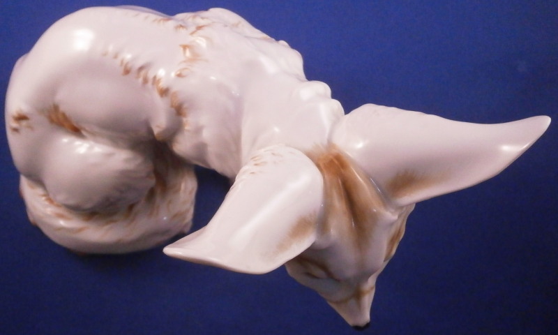 This is a rare figurine of a desert or Fennec fox made by Augarten during the original period it was designed in by Karin Jahrl around 1926. This to me was always the holy grail of porcelain figurines made by Augarten! My personal favorite and while I have seen them from later periods this is a rare original period piece. This figurine is a very popular model due to its cuteness factor :) Well modeled, too and hand painted just enough to make it as elegant as can be. He is 5.875 inches tall, 4.25 inches wide and 6.5 inches long. The figure is in perfect condition. Marked underneath with the blue shield with the crown on top as well as the word Wien underneath, Augarten Austria in a red rectangle as well as a painter's mark 58 in brown as shown. A piece that always makes you smile when you look at it! Please email me for more information or photos.