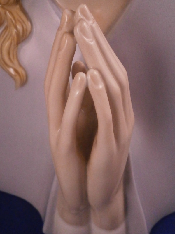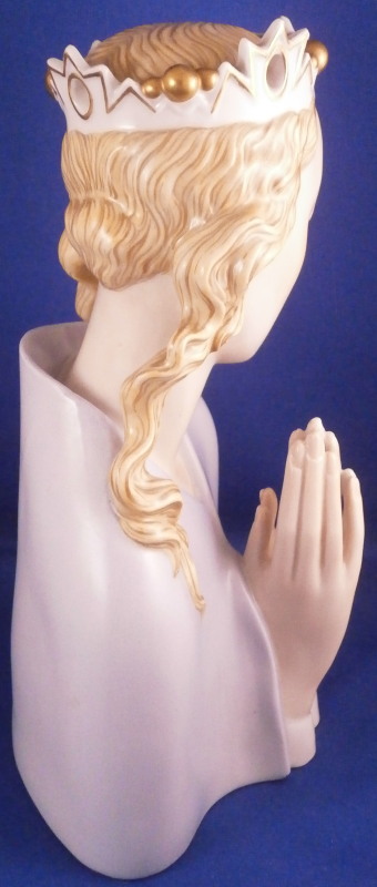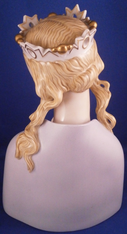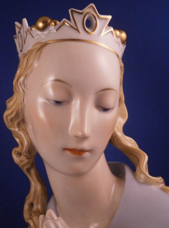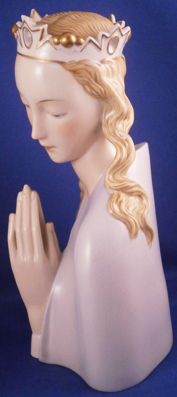 This is a rare painted version of a bust of the Madonna wearing a crown made by Augarten during the mid 20th century. This piece was originally designed by Ida Schwetz-Lehmann in 1933. One sees these in white quite often but rarely ever does one see the painted version like this here. The figurine is 8 inches tall, about 3.5 inches deep and about 5 inches wide so she is the larger size version. Marked underneath with the blue shield with the crown on top as well as the word Wien underneath as well as the usual impressed marks as shown including the artist initials ISL. The figure is in perfect condition. Please email me for more information or photos.