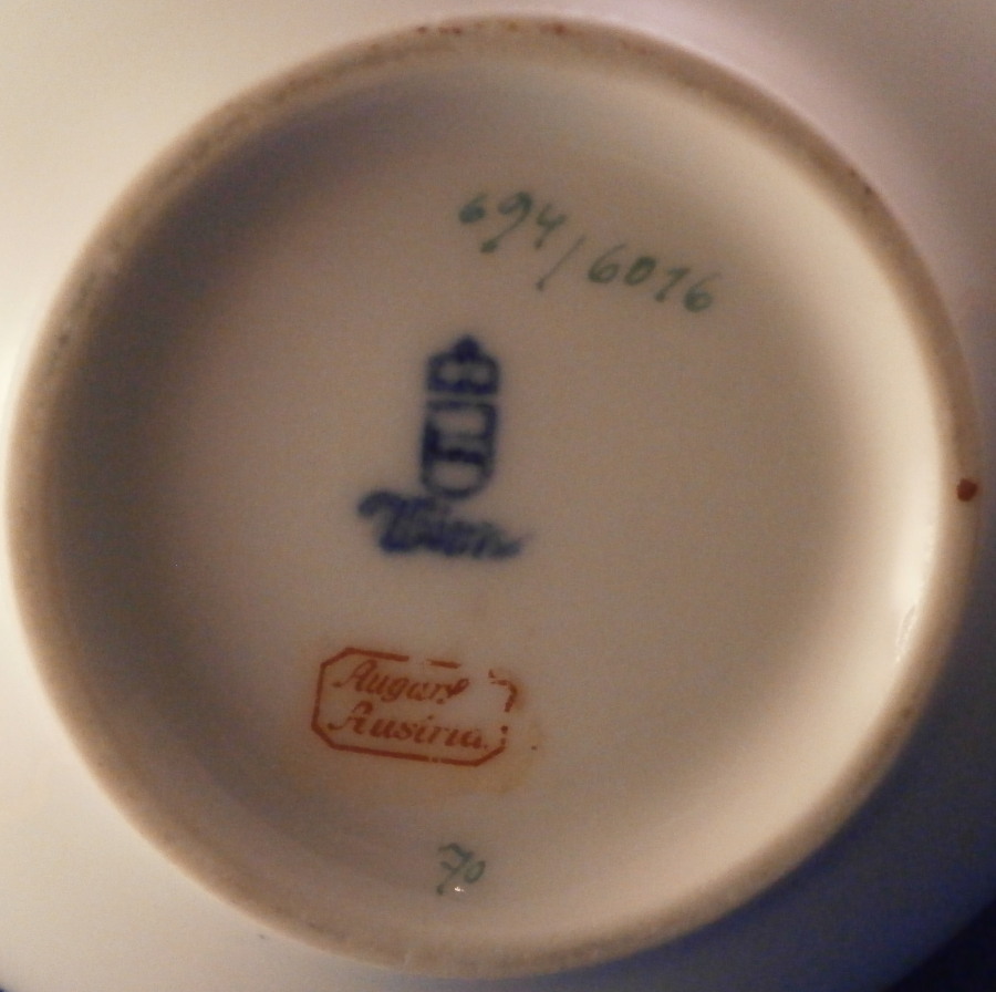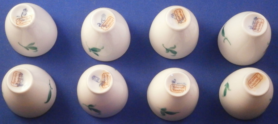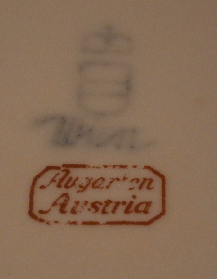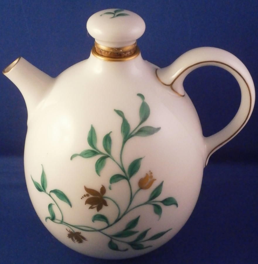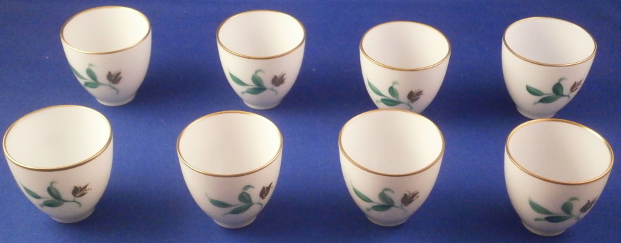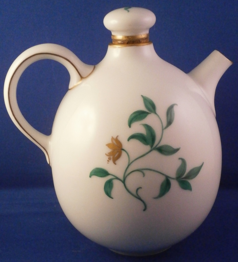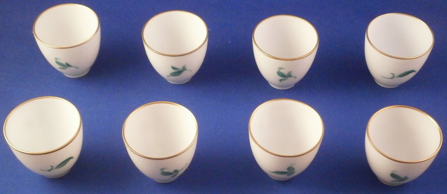 This is a rare Sake or liquor set made by Augarten during their beginning year of the early 20th century. It comes with a nicely shaped pot with a lid, eight little cups / shot glasses and a tray to hold them all. I have not seen a set like this from them and it really is superb! The lid of the pot is held in place by a cork that looks to have been either reglued or replaced. The set has a simple but very elegant design of green leaves and golden flowers as well as a simple gold trim. It looks great! The entire set is in great condition except for the already mentioned cork and one of the cups has a hairline to it as shown. No other issues at all. The cups are 1.5 inches tall and 1.5 inches in diameter at the top. The pot with its lid is about 6 inches tall, 6.25 inches wide and 4.5 inches deep. The tray is 0.75 inches tall and 11.275 inches in diameter. All pieces are marked with the under glaze blue shield mark with the crown on top and Wien underneath except for one cup and they all have the red rectangle with Augarten Austria in it underneath. Some green numbers and a green painter's mark 70 under the pot as shown. Please email me for more information or photos.
