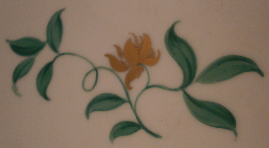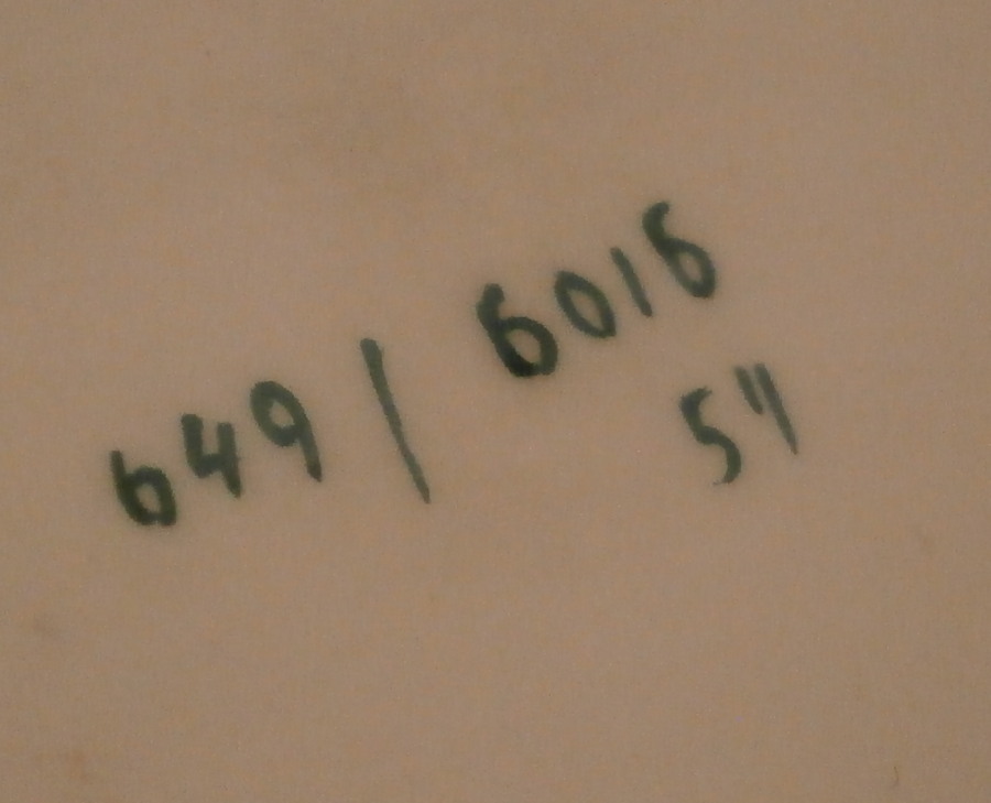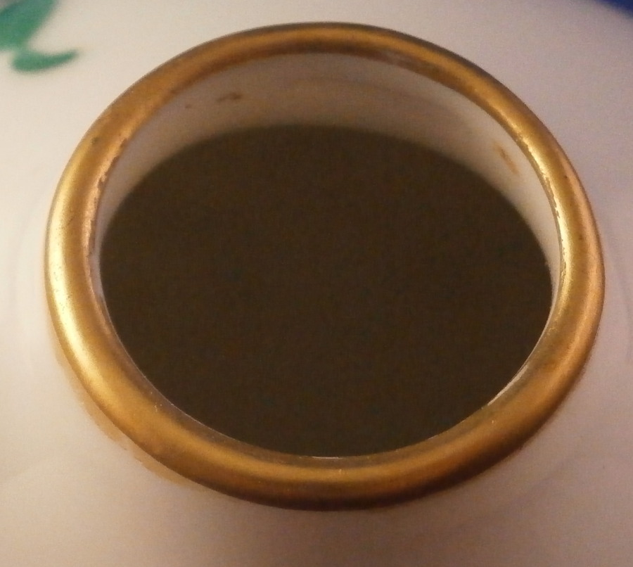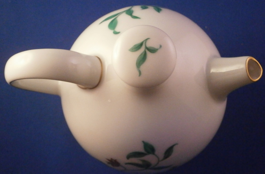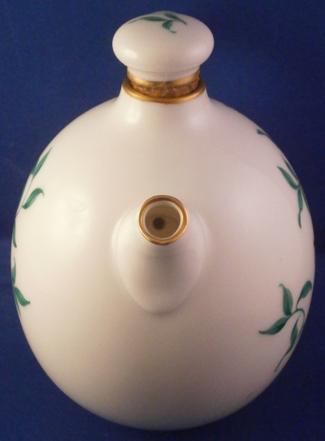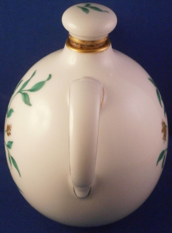 This is a rare Sake or liquor set made by Augarten during their beginning year of the early 20th century. It comes with a nicely shaped pot with a lid, eight little cups / shot glasses and a tray to hold them all. I have not seen a set like this from them and it really is superb! The lid of the pot is held in place by a cork that looks to have been either reglued or replaced. The set has a simple but very elegant design of green leaves and golden flowers as well as a simple gold trim. It looks great! The entire set is in great condition except for the already mentioned cork and one of the cups has a hairline to it as shown. No other issues at all. The cups are 1.5 inches tall and 1.5 inches in diameter at the top. The pot with its lid is about 6 inches tall, 6.25 inches wide and 4.5 inches deep. The tray is 0.75 inches tall and 11.275 inches in diameter. All pieces are marked with the under glaze blue shield mark with the crown on top and Wien underneath except for one cup and they all have the red rectangle with Augarten Austria in it underneath. Some green numbers and a green painter's mark 70 under the pot as shown. Please email me for more information or photos.