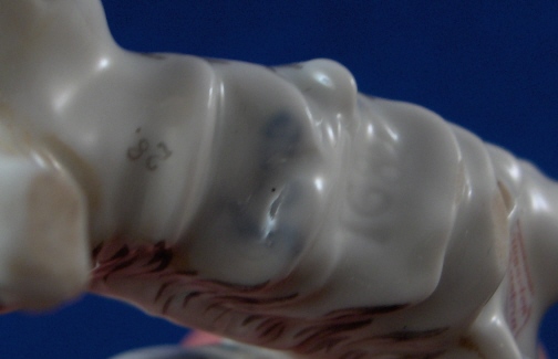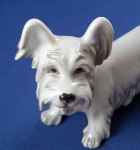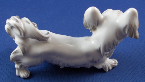 This is a figurine of a small dog (I am completely lost as to which breed he is) made by Augarten during the original period in the early 20th century. He is very cute and quite well modeled and painted. The little guy is 2.25 inches tall, 1.375 inches wide and 3.25 inches long. The dog is in perfect condition. Marked underneath with the blue shield with the crown on top as well as the word Wien underneath, a black number 28, impressed number 1682, as well as Augarten Austria in a red rectangle. Please email me for more information or photos.