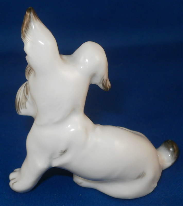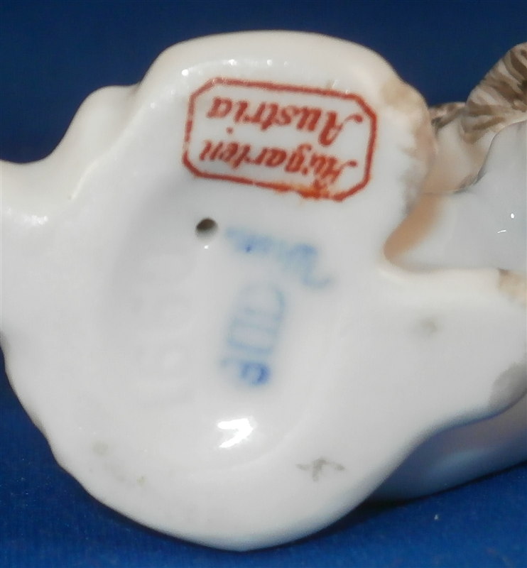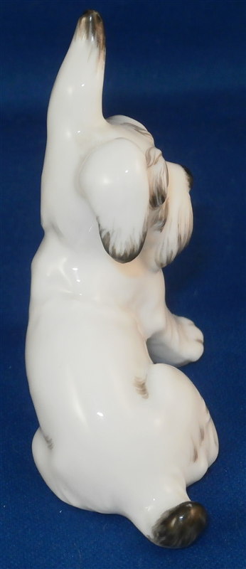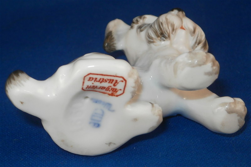 This is a figurine of a cute puppy dog - I think a Highland Terrier (but not totally sure) made by Augarten during the original period in the early 20th century. He is superbly modelled and hand painted just enough to be super cute! The figure is 2.625 inches tall, 2.625 inches long and 1.125 inches wide. The little dog is in perfect condition! He is marked underneath with the blue shield with the crown on top as well as the word Wien underneath, impressed model number 1660 (I think) as well as Augarten Austria in a red rectangle. Please email me for more information or photos.
