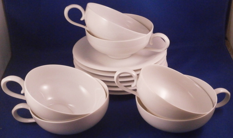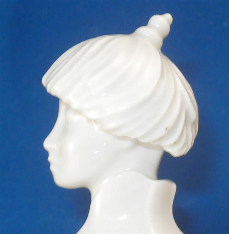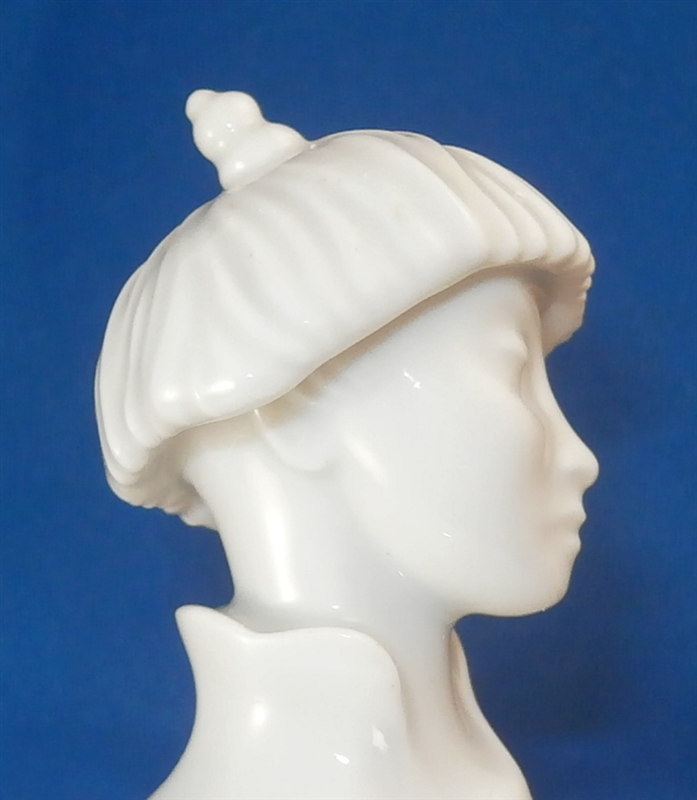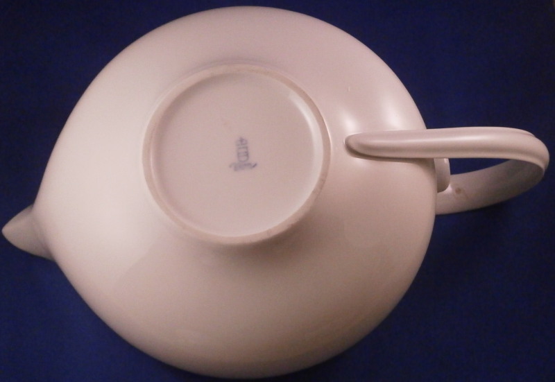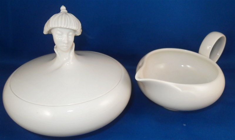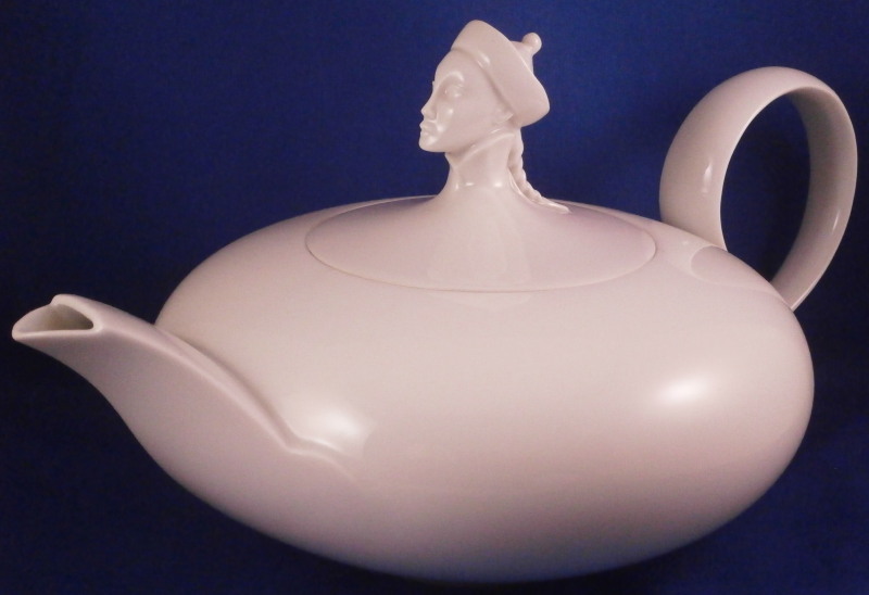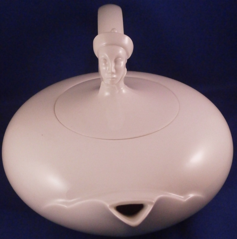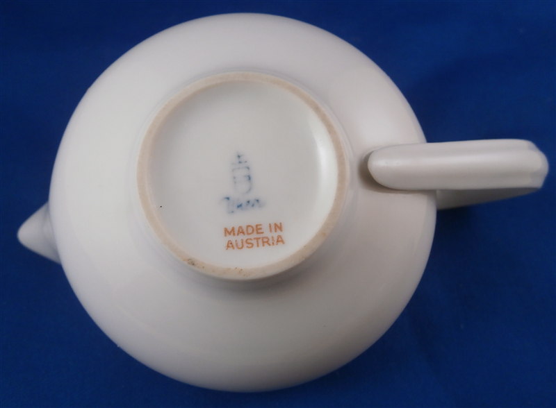 This is a neat tea set for six made by Augarten in the 20th century. It is from the Ena Orient series and was first designed by Ena Rottenberg in the 1930s and is not easy to find. Augarten recently re did this series with a modern twist but this set here is not from the new edition! There was some uproar over this due to the obvious sensitive nature of the design. What was a very popular motif in the 30's is maybe not that appropriate anymore in current times. I still think it is a fun design if one puts it into the context of the period. This is the tea set but there is also a coffee pot design out there. Four different exotic heads make up the possible finial. A malay, an Indian, a person of color and a Chinese person. I have the Malay and Chinese ones I believe in this set. The entire set is made of really nice thin porcelain with a very modern shape to it typical to the period and the teapot and sugar dish have the figural finial to them. All the pieces pieces are in perfect condition. The teapot handle has a brown spot to the top underside of the handle from when it was made - some sort of support was removed which is normal. The set is marked underneath as shown with underglaze blue shield with the crown on top as well as the word Wien underneath. The sugar and creamer as well as four cups also have Made in Austria in red under them. The tea pot is about 5.5 inches tall, 10.75 inches from handle to spout and 7 inches wide. The sugar pot and lid are about 4 inches tall and 4.75 inches in diameter. The creamer is 2.75 inches tall, 3.625 inches wide and 5.875 inches long. Each saucer is about 0.625 inches tall with a diameter of 5.875 inches. Each cup is about 1.75 inches tall and 4 inches in diameter with the handle sticking out another 1.125 inches. Please email me for more information or photos.