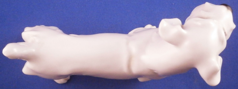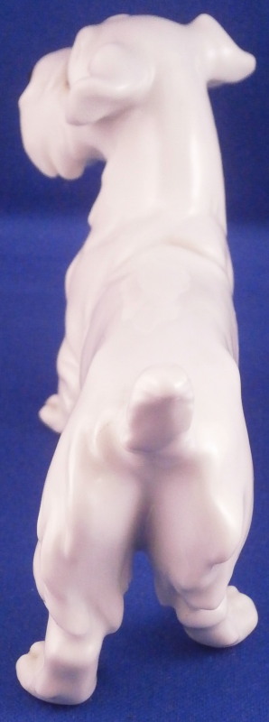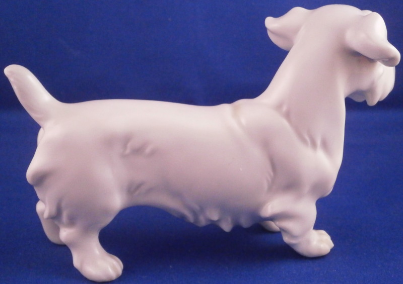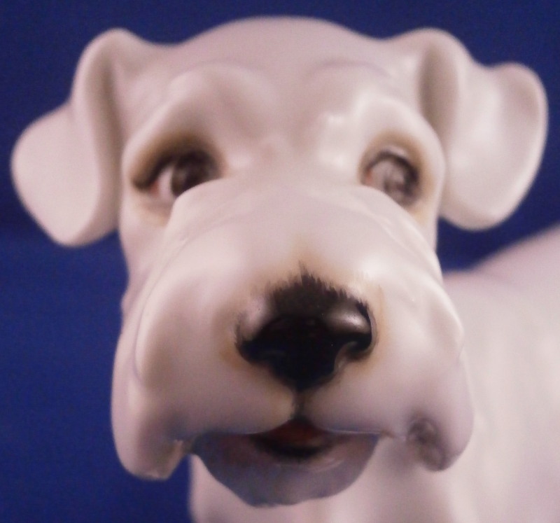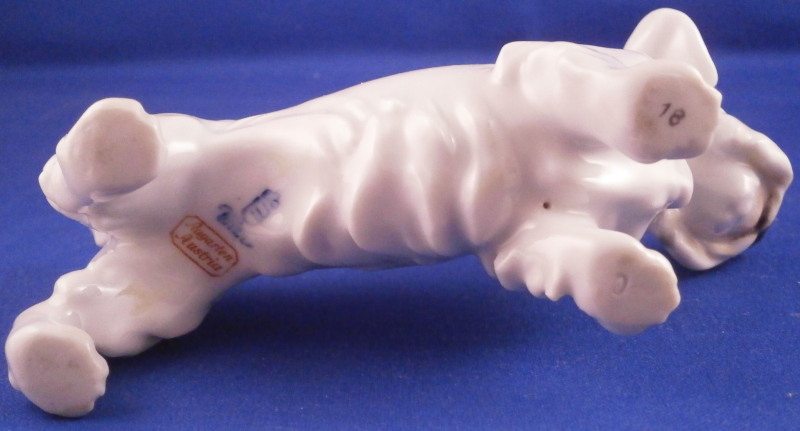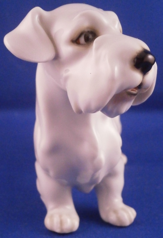 This is a really nice figurine of a Syleham Terrier made by Augarten during the original period of the early 20th century. Nicely modeled with lots of detail and hand painted jsut a touch in the face make this a very cute piece! The figure is 3.375 inches tall, 2 inches wide and 5.25 inches long. The dog is in perfect condition. Marked underneath with the blue shield with the crown on top as well as the word Wien underneath, a black number 18, impressed letter O, as well as Augarten Austria in a red rectangle as shown - a mark only their earliest peices have. Please email me for more information or photos.