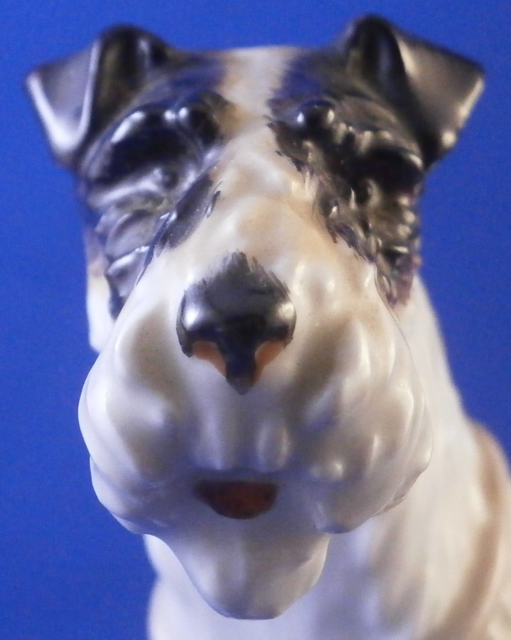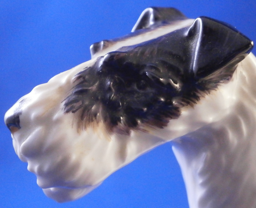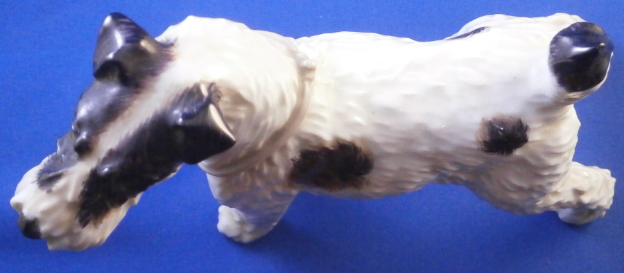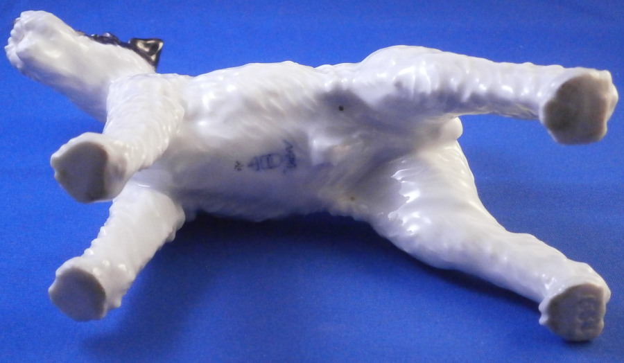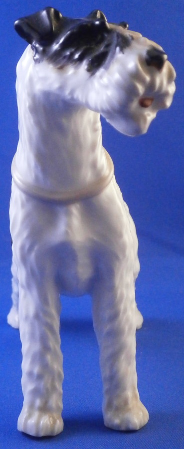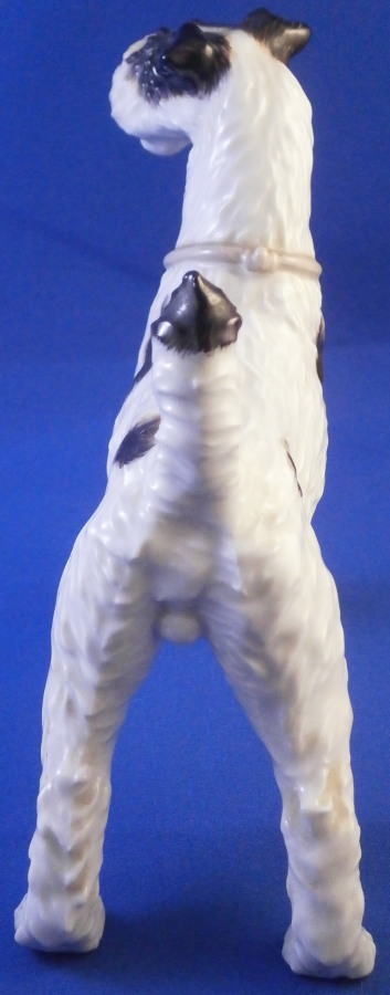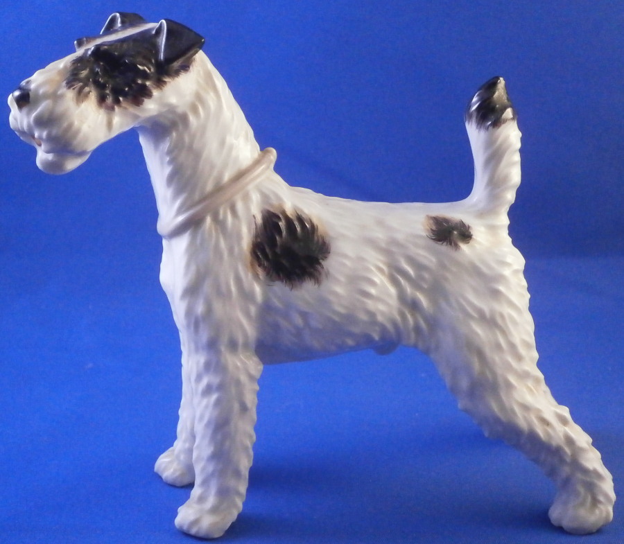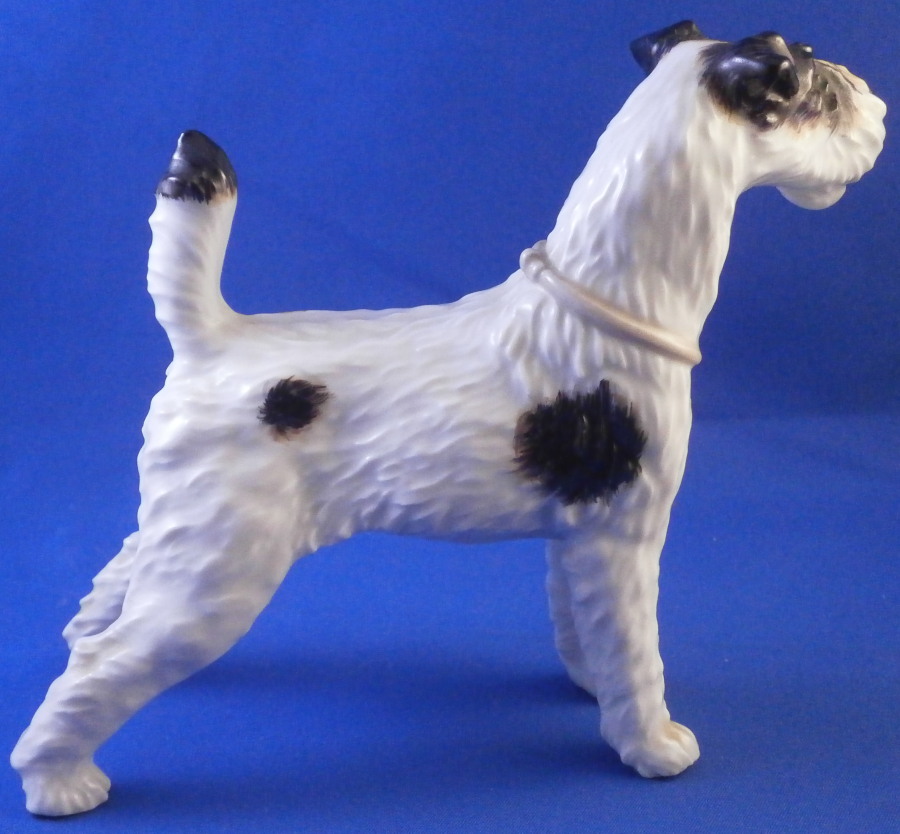 This is a really nice figurine of a Terrier made by Augarten during the mid 20th century. It is the version wearing a collar which is much harder to find and a bit bigger than the other versions. The figure is nicely modeled and hand painted very nicely! It is 5 inches tall, 2.5 inches wide and 5.5 inches long. The dog is in perfect condition. Marked underneath with the blue shield with the crown on top as well as the word Wien underneath, Made in Austria impressed, a model number is impressed under one of his feet and it has the painter's mark 76 in black as shown. A really nice figure of this breed! Please email me for more information or photos.