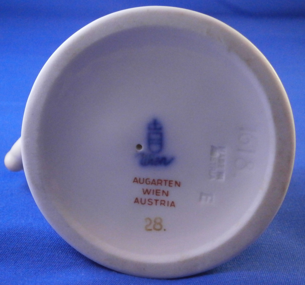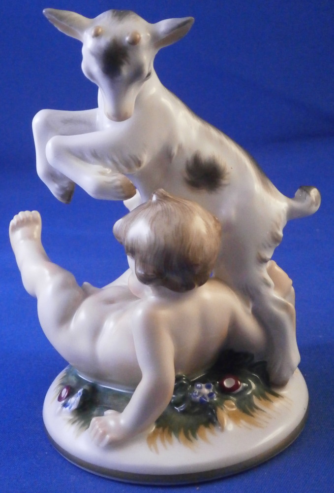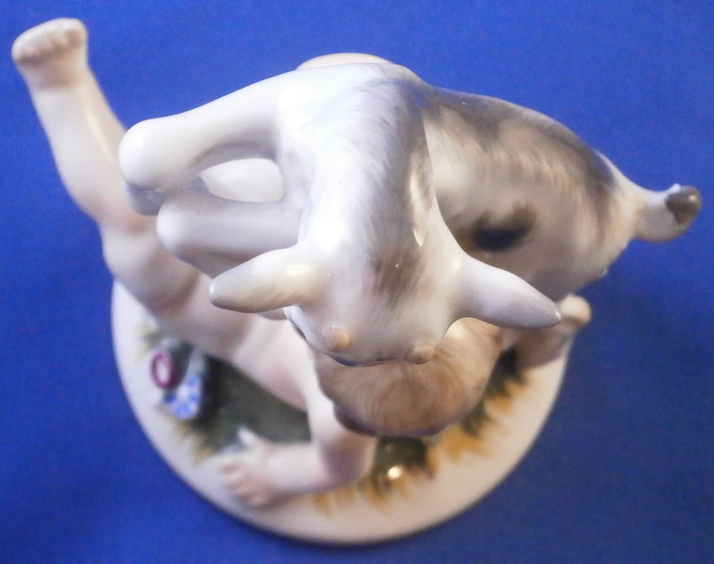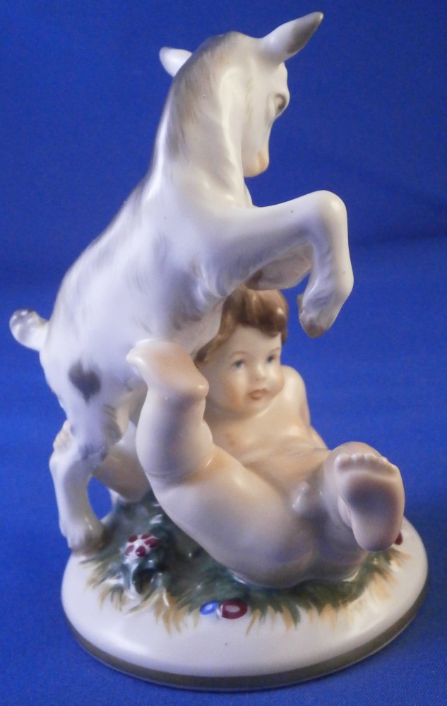 This is a figurine of a baby goat with a young boy (a kid with a kid :) made by Augarten during the mid 20th century. A fun piece that is nicely modeled with lots of detail and hand painted to perfection. The goat is standing on its hind legs with the front legs in the air above the baby's belly while the young boy is on the ground with his legs in the air just having a good time. Looks like they are best friends. Nice base with grasses and flowers on it and a gold trim around the edge. The figure is 3.875 inches tall and the base has a diameter of 2.625 inches. The piece is in perfect condition. It is marked underneath with the under glaze blue shield with the crown on top as well as the word Wien underneath, Augarten Wien Austria in red, an impressed letter E, impressed model number 1618 and a gold number 28. Please email me for more information or photos.
