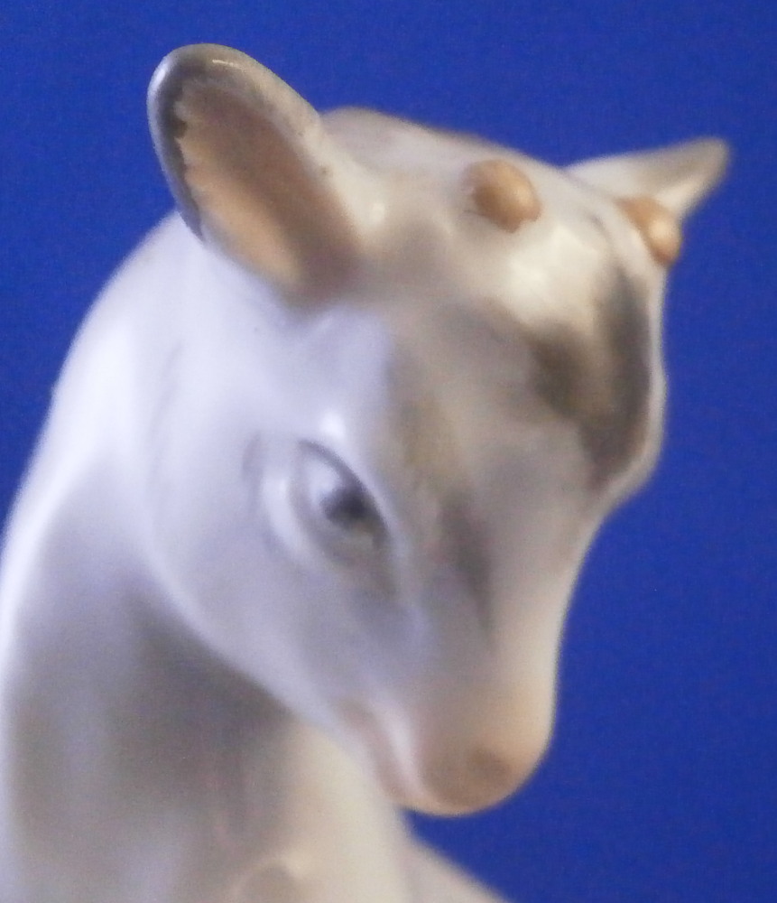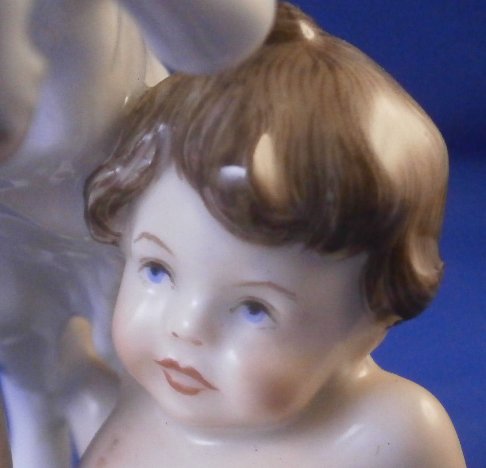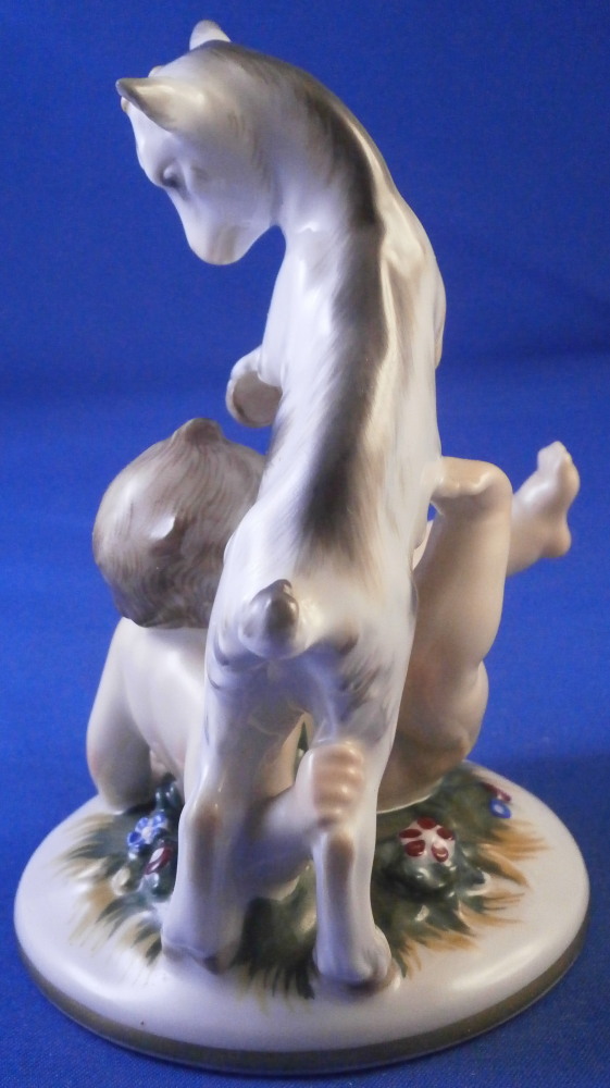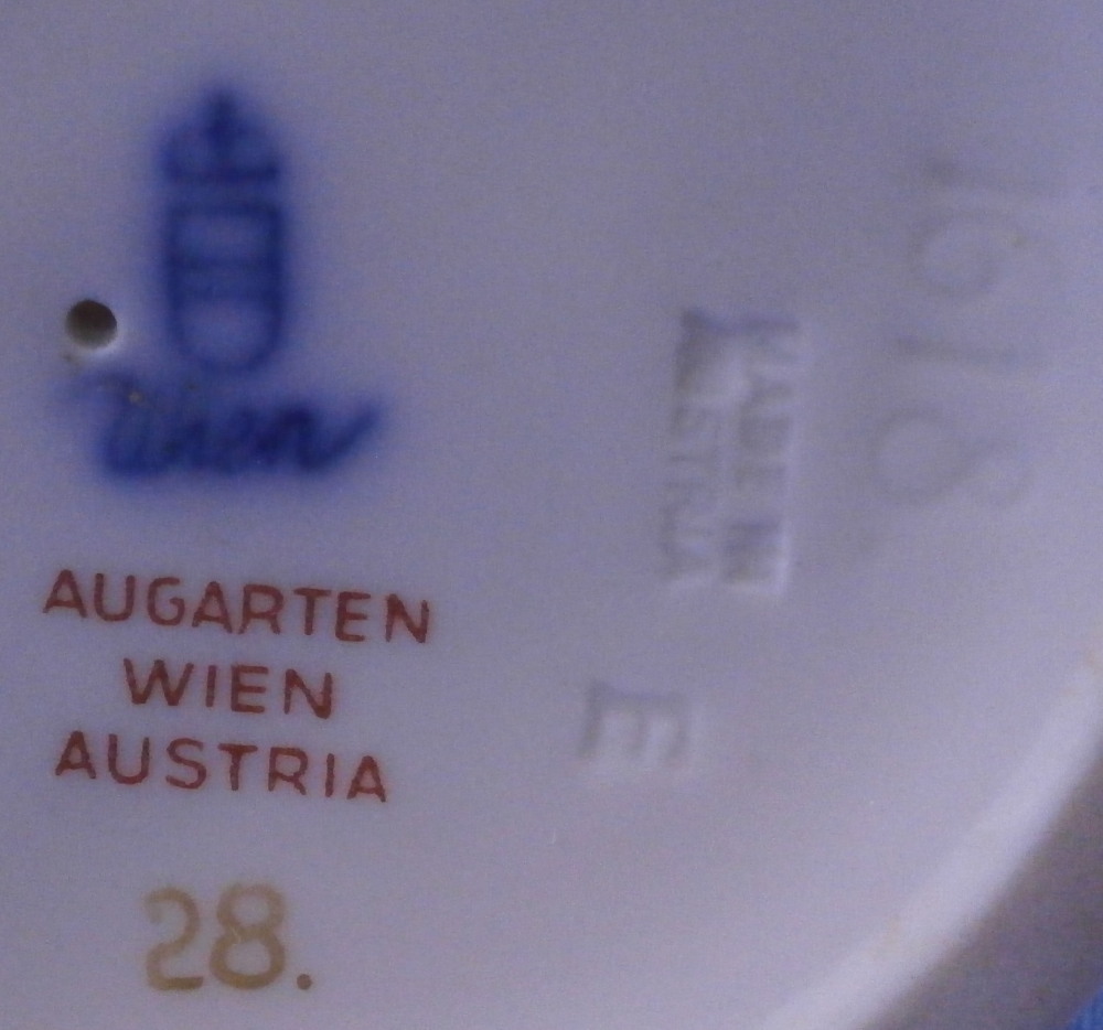 This is a figurine of a baby goat with a young boy (a kid with a kid :) made by Augarten during the mid 20th century. A fun piece that is nicely modeled with lots of detail and hand painted to perfection. The goat is standing on its hind legs with the front legs in the air above the baby's belly while the young boy is on the ground with his legs in the air just having a good time. Looks like they are best friends. Nice base with grasses and flowers on it and a gold trim around the edge. The figure is 3.875 inches tall and the base has a diameter of 2.625 inches. The piece is in perfect condition. It is marked underneath with the under glaze blue shield with the crown on top as well as the word Wien underneath, Augarten Wien Austria in red, an impressed letter E, impressed model number 1618 and a gold number 28. Please email me for more information or photos.
