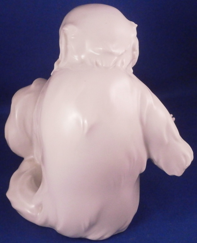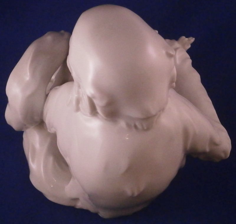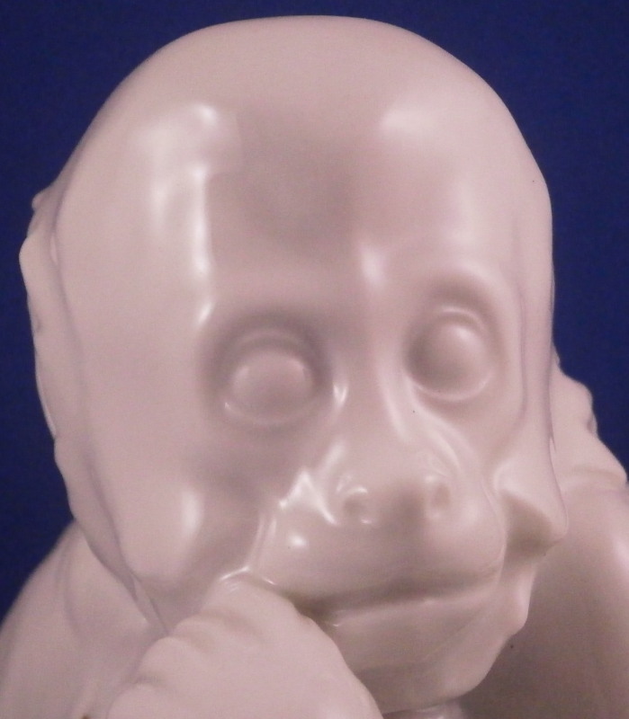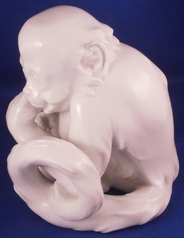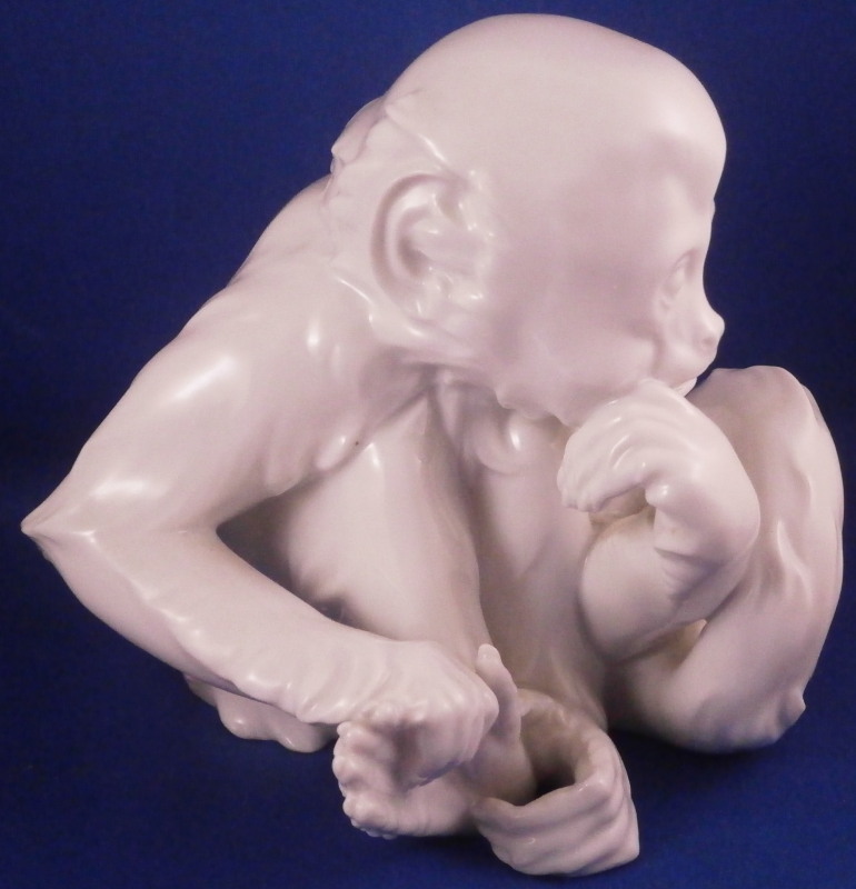This is a figurine of a cute monkey made by Augarten in the 20th century. It is of a baby Orangutan that is super cute. Very well modeled with lots of detail! It is 5 inches tall, 5.25 inches wide and 4.5 inches deep. The figure is in perfect condition. Marked underneath with the blue shield with the crown on top as well as the word Wien underneath, an impressed number that is hard to see maybe 1722 and impressed number 3. Impressed on his arm is the designers name - Robert Ullmann but it is very ahrd to see as well. Please email me for more information or photos.