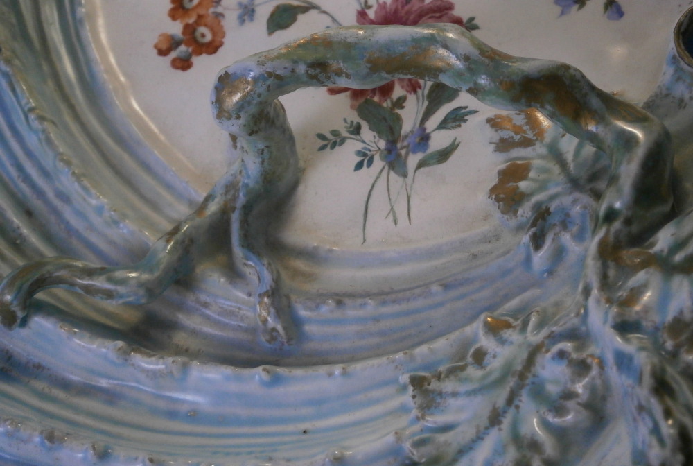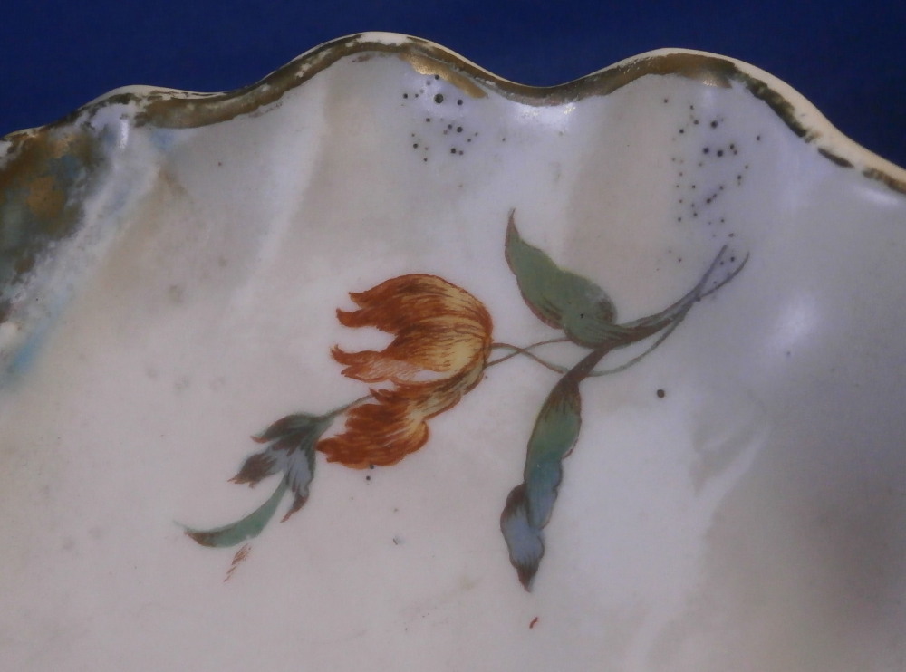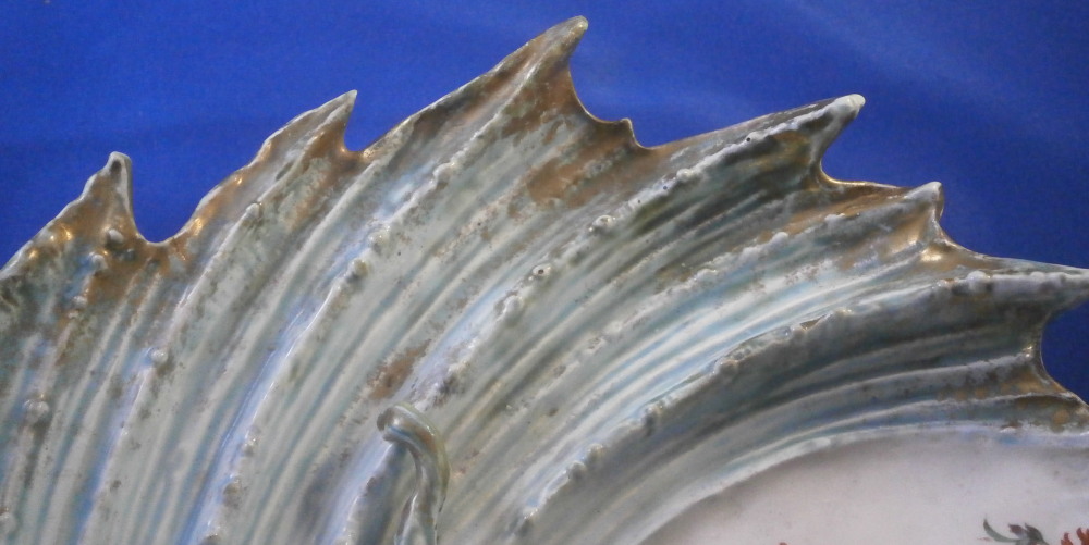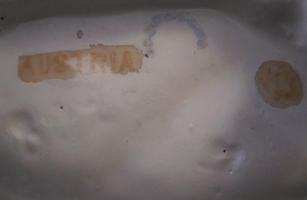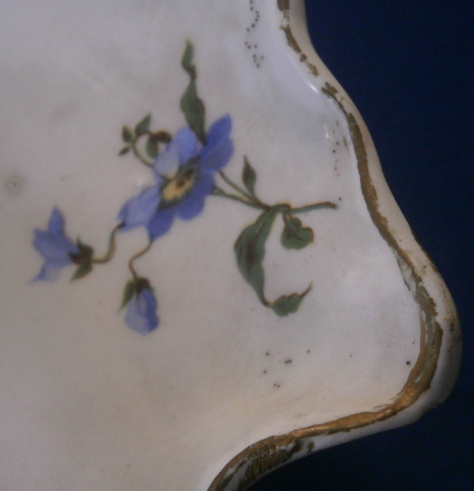 This is a funky dish made of some sort of ceramic / pottery in Austria. I know absolutely nothing about it - I bought it because it was supposed to be hand painted but in fact the flowers are an unusually nice transfer print both in terms of detail and color. Very reminiscent of 18th century porcelain which is why I was intrigued. Alas no one painted it afterall :( Still a really nice dish with one side having this dragon wing like design to it painted in turquoise and gold and the other the nice floral arrangement and two single flowers. Branch handle with three leaves to one end. The dish sits on three feet. The serving dish is in great condition with a bit of wear to the gold trim on the edge. It is marked underneath Austria in a spot not covered by the white glaze and there is another circular spot that has a mark to it and some blue writing in a semi circle but neither is clear enough to figure out. The piece is 10.25 inches in diameter and 3 inches tall so a very nice size. A very unusual and interesting dish! Please email me for more information or photos.