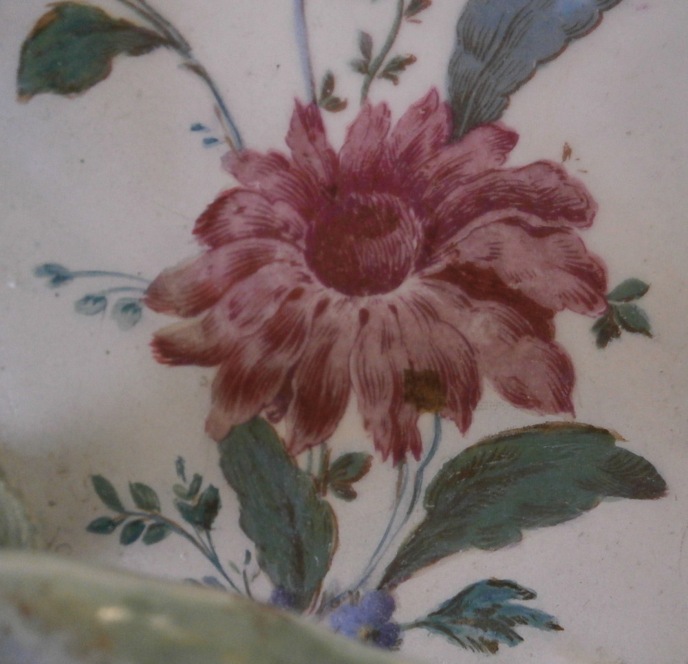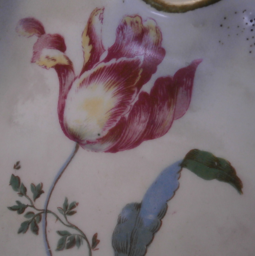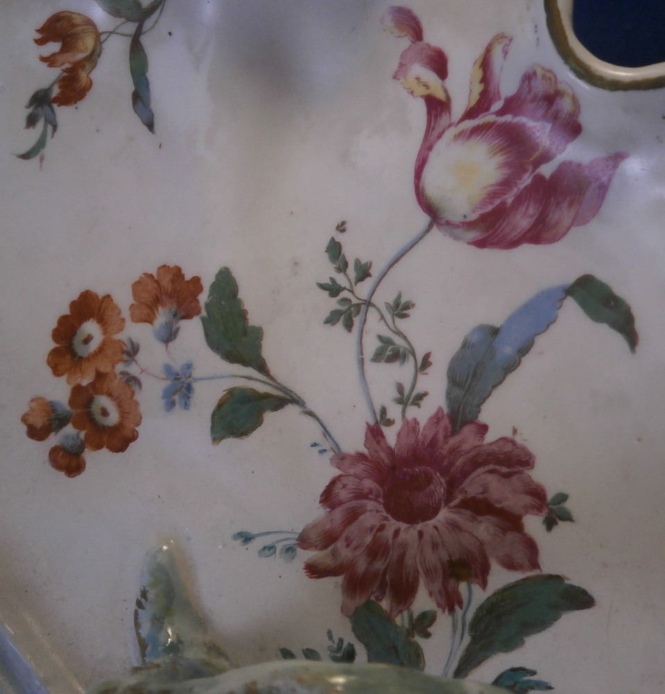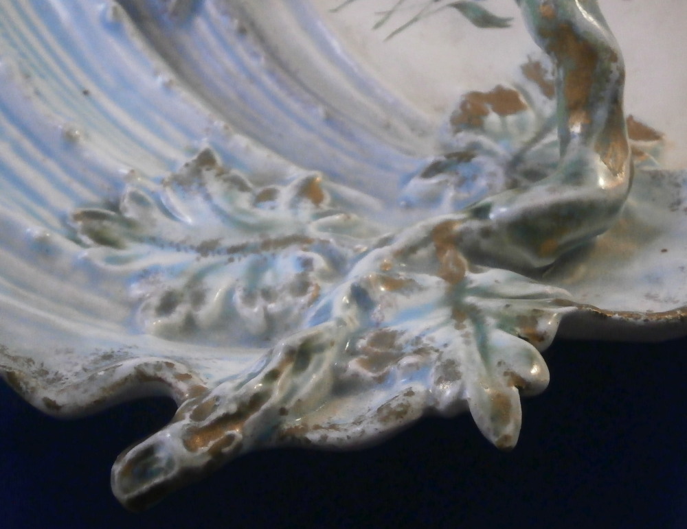 This is a funky dish made of some sort of ceramic / pottery in Austria. I know absolutely nothing about it - I bought it because it was supposed to be hand painted but in fact the flowers are an unusually nice transfer print both in terms of detail and color. Very reminiscent of 18th century porcelain which is why I was intrigued. Alas no one painted it afterall :( Still a really nice dish with one side having this dragon wing like design to it painted in turquoise and gold and the other the nice floral arrangement and two single flowers. Branch handle with three leaves to one end. The dish sits on three feet. The serving dish is in great condition with a bit of wear to the gold trim on the edge. It is marked underneath Austria in a spot not covered by the white glaze and there is another circular spot that has a mark to it and some blue writing in a semi circle but neither is clear enough to figure out. The piece is 10.25 inches in diameter and 3 inches tall so a very nice size. A very unusual and interesting dish! Please email me for more information or photos.