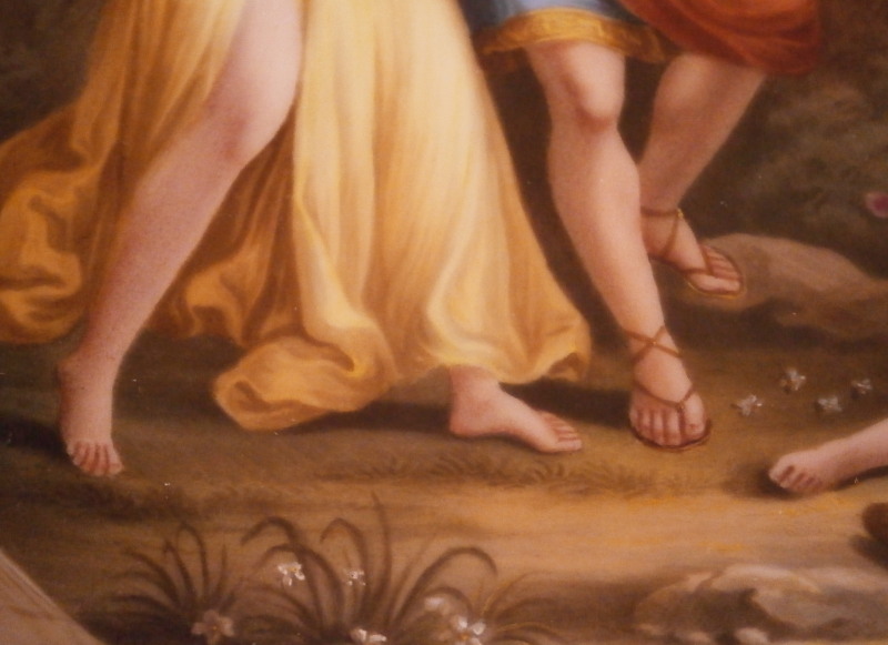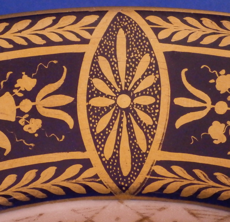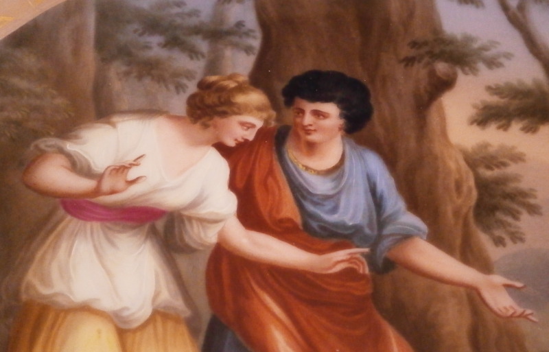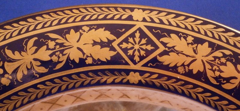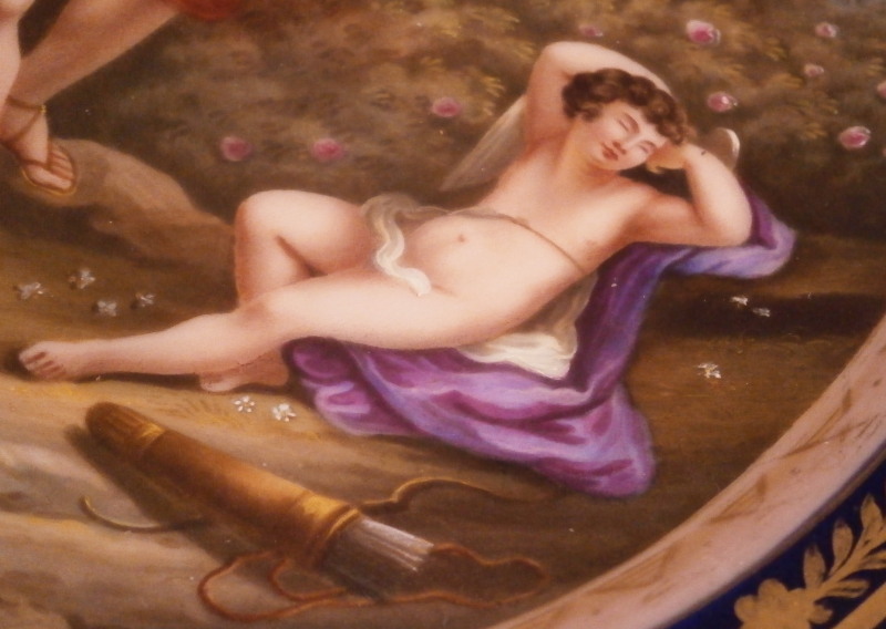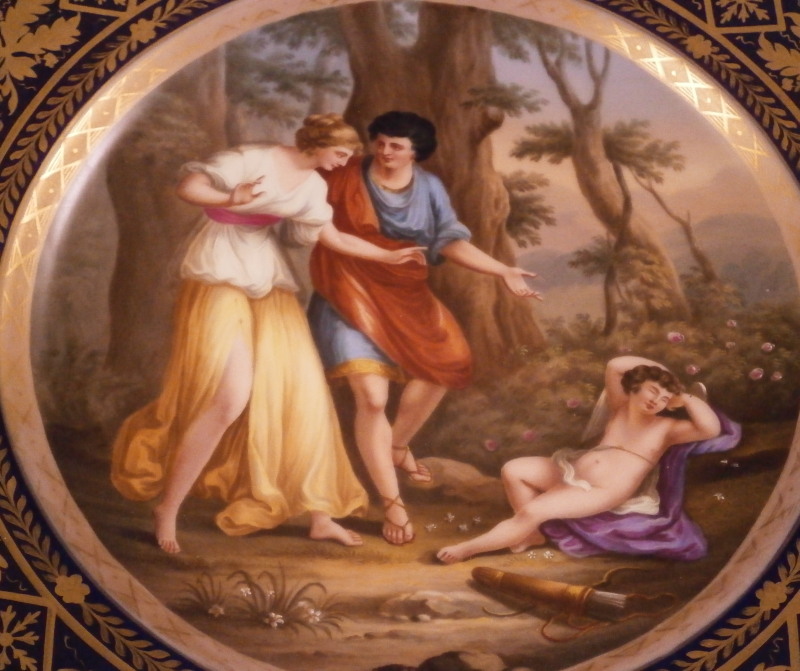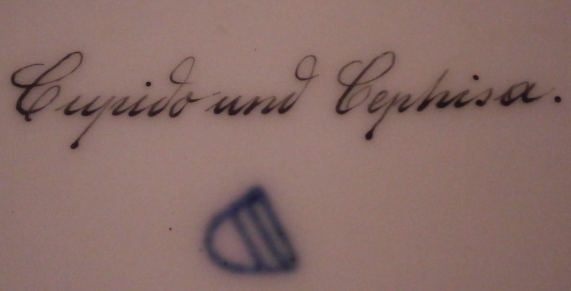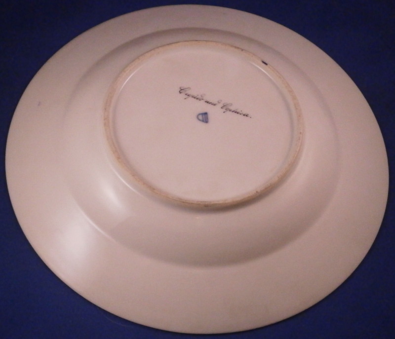 This is a plate made by one of the many factories copying the Royal Vienna beehive / shield mark in the 19th or early 20th century. The center is hand painted with a signed scene of a Cupid and Cephisa to it. The story goes that Cephisa wants to cut the wings of Love (cupid) while the guy standing is Montesquieu who stops her from doing so. It is after a painting after Kaufmann's Céphise et l'Amour . The scene is of a nice quality. The edge of the well of the plate has a gold trim to it and the rim has a nice blue ground with fancy gilding to it. Typical for plates in this style. These types of plates are very elegant and decorative which is why they are so popular. The plate is in great condition with some wear to the gilding around the edge of the well. It displays perfectly! The piece is 9.625 inches in diameter and 1.5 inches tall so a very nice size. It is marked underneath with the blue shield / beehive mark as well as the name of the scene in black Cupido und Cephisa as shown. Please email me for more information or photos.