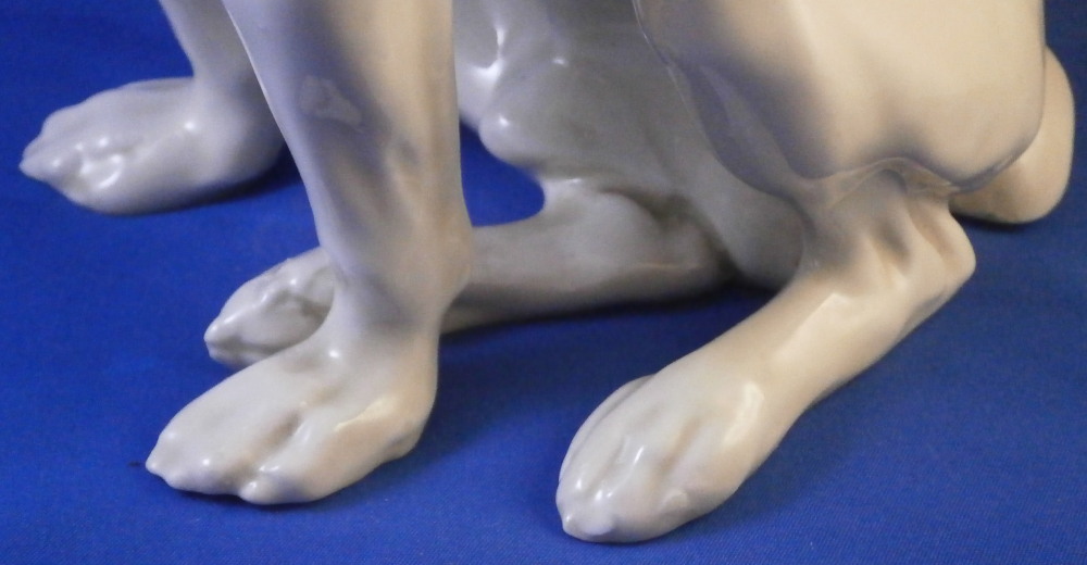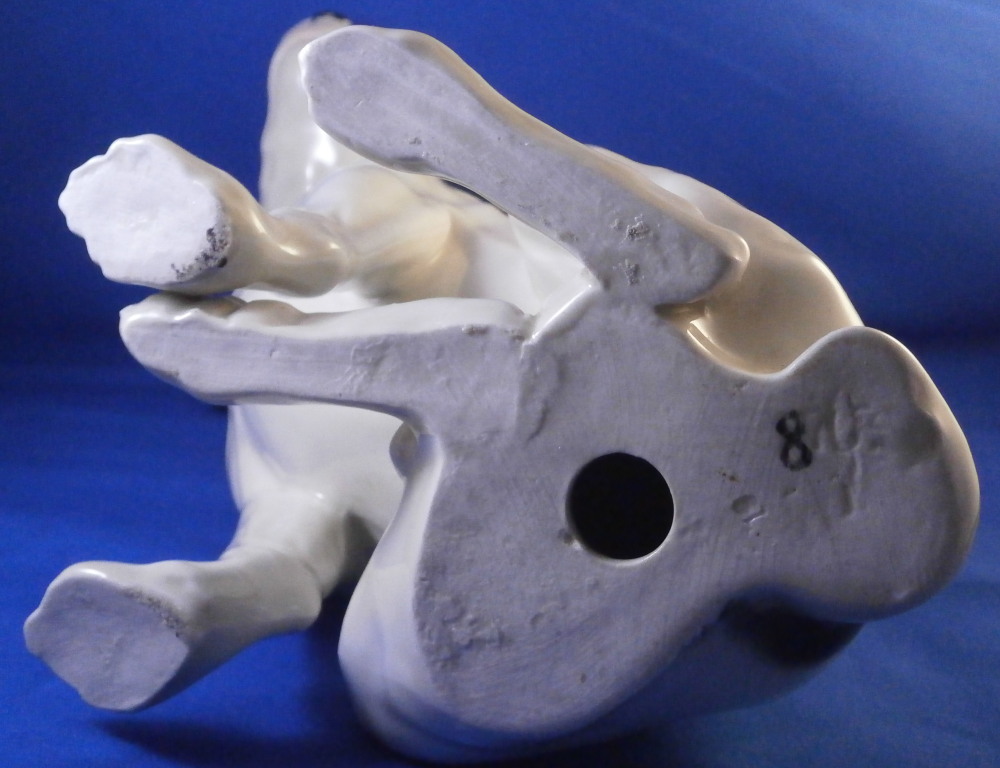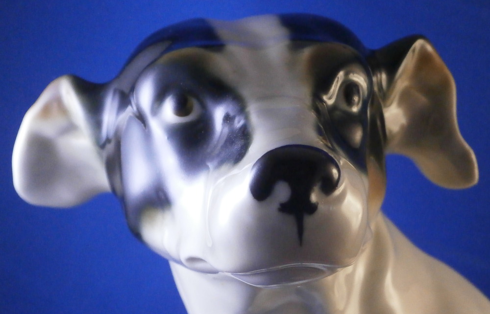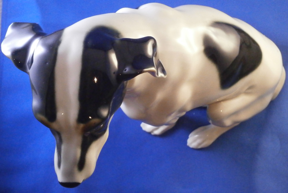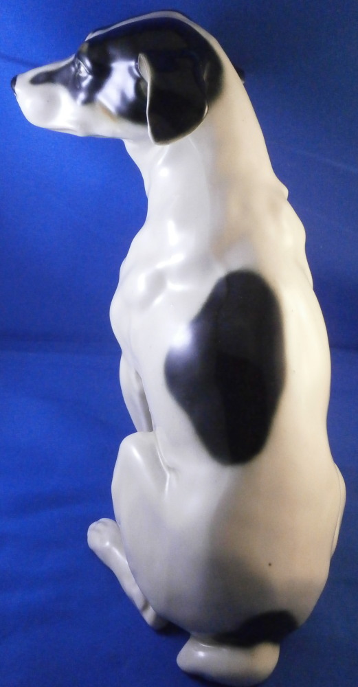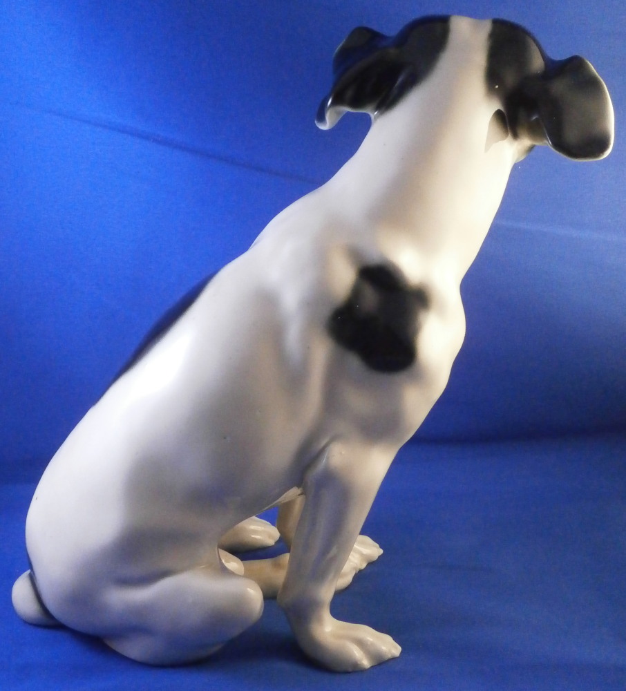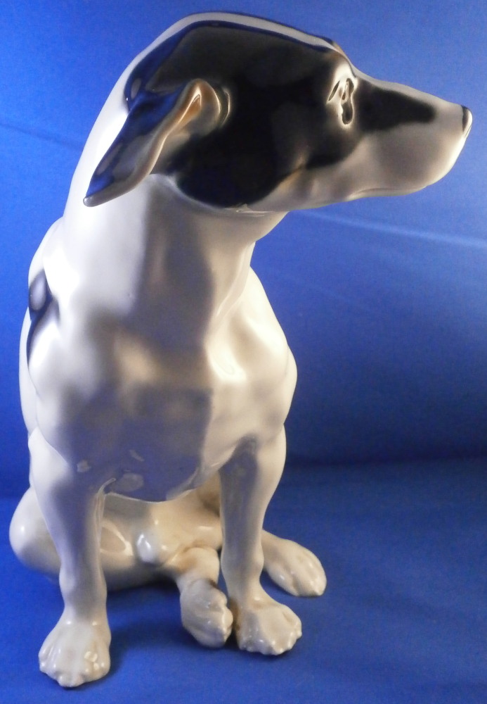 This is a ceramic dog figurine made in Austria in the early 20th century. Either by the Wiener Kunstkeramische Werkstätten or Goldscheider but even though this is the second one I now own I have not found out who made them. The dog reminds me a lot of Niki from the Nymphenburg porcelain factory designed by Willy Zügel . He is definitely a terrier and I think it is a Foxterrier but I stink with dog breeds so I might be wrong. The figure is superbly modeled and hand painted perfectly. It is of a nice size as well. The figurine is marked on the bottom with some numbers that are hard to see 19 and possibly 70 and a black 8 but nothing that is of much help sadly. No factory mark so it was either missed which did happen from time to time or has worn off or something else. I lean towards worn of which means it was more likely made by Goldscheider since they had a printed mark. Either way a really nice figure! The dog is 9.375 inches tall, 5.125 inches wide and 8.5 inches long which is a great size. The piece is in perfect condition which is always a plus. Please email me for more information or photos.