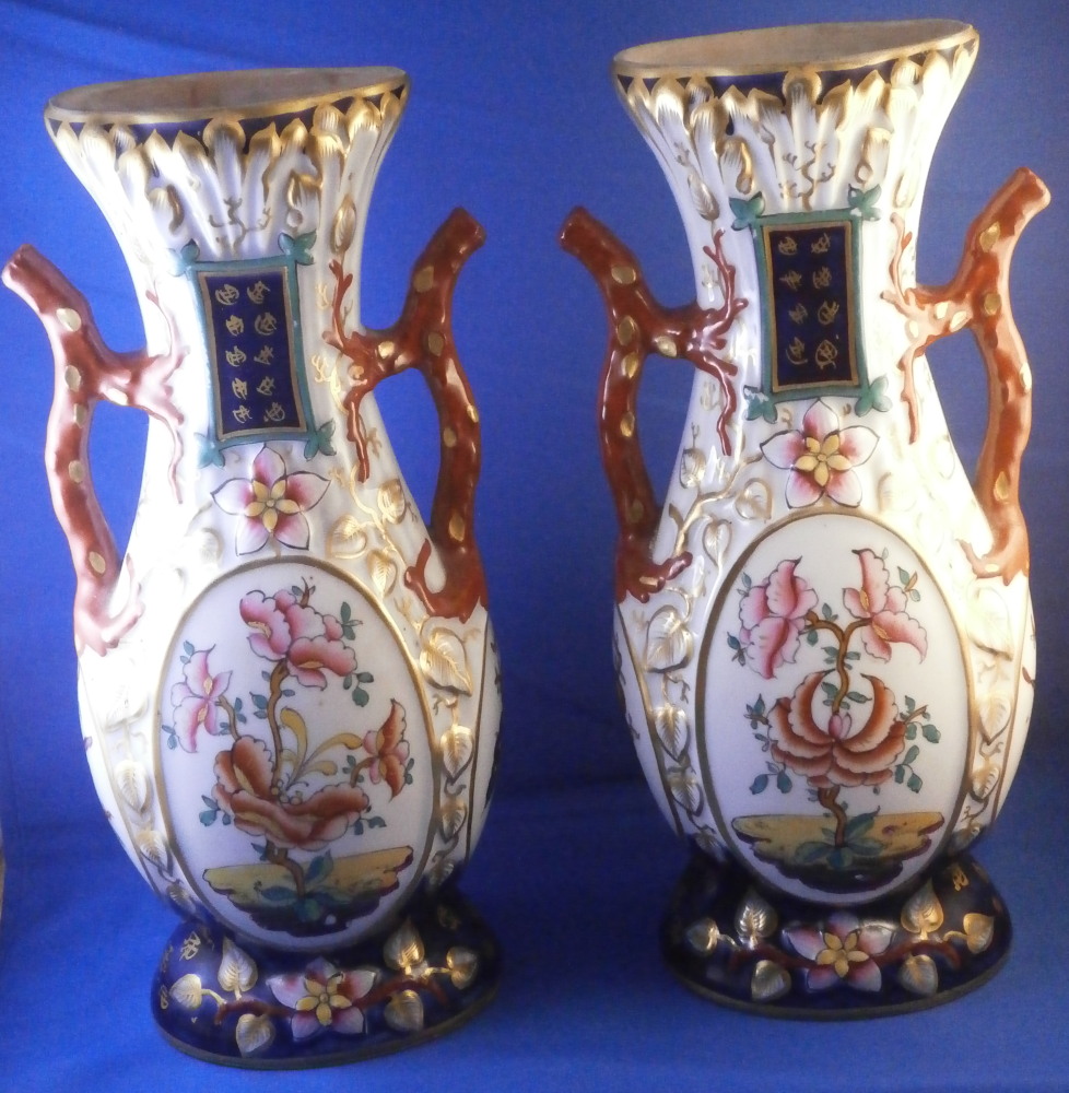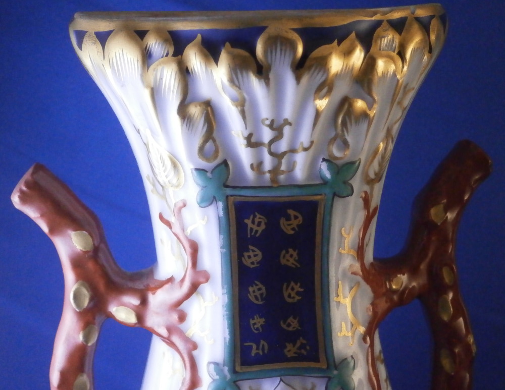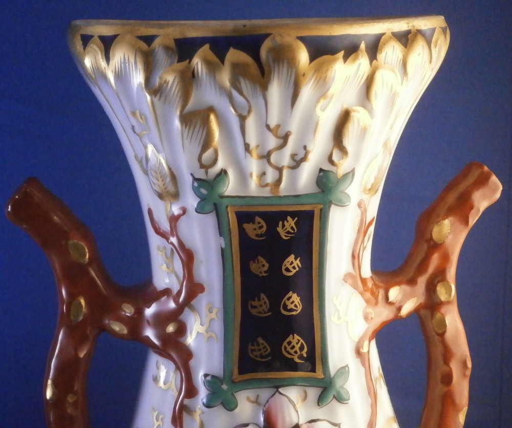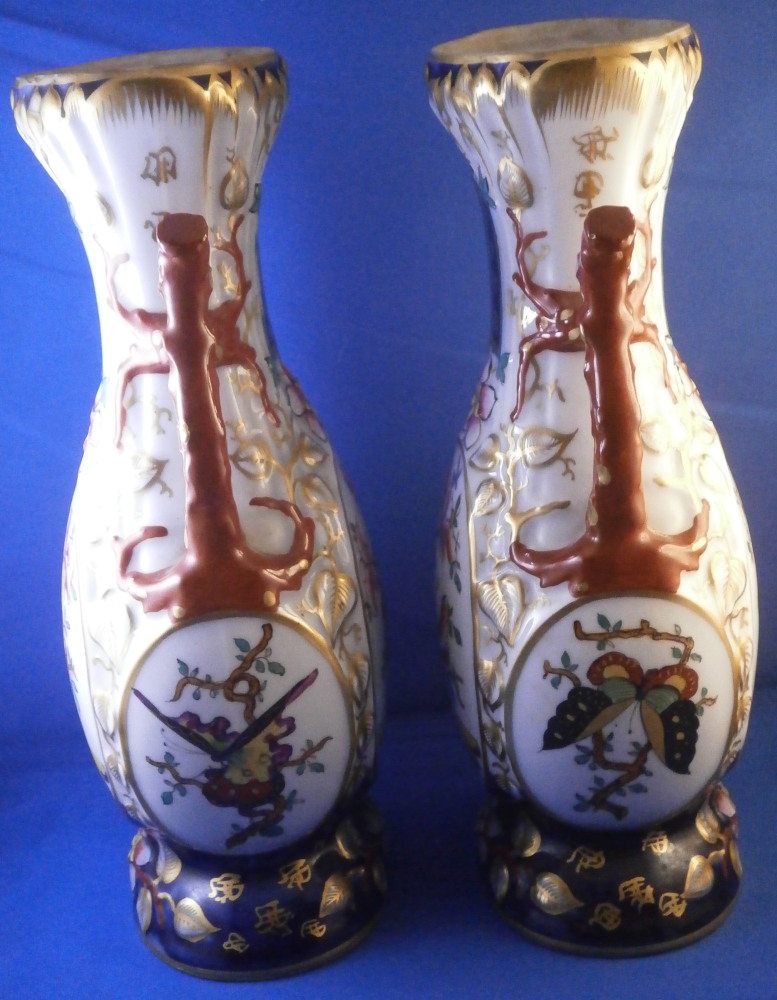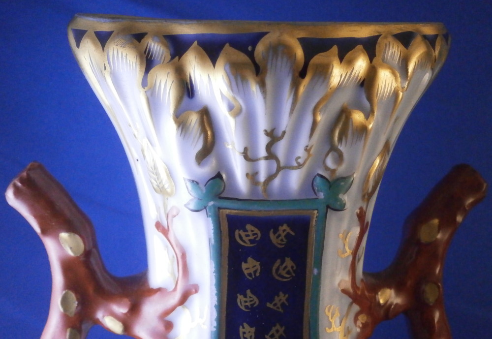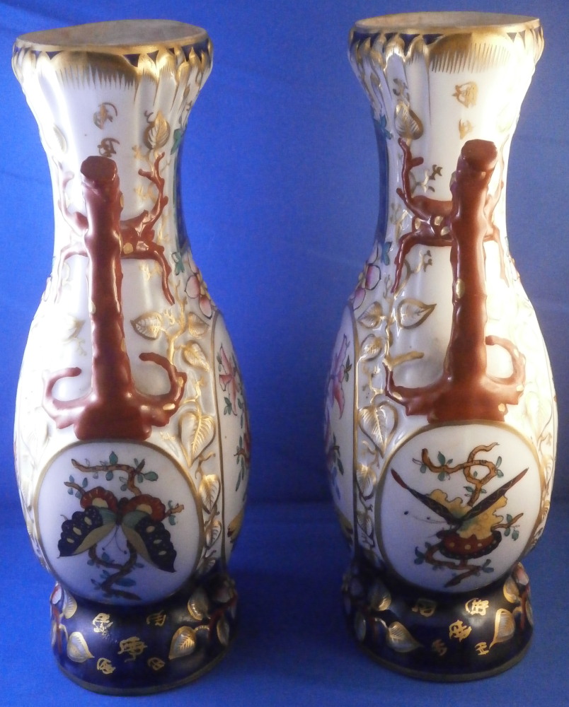 This is a great pair of vases made by Bayeux in France during the Gosse period of the mid 19th century. Each has a nice shape to it with a corral look handle to each side and lots of relief designs like leaves highlighted with gilding. The top edge has a bit of blue ground color to it as does the foot of the vases. Each has a cartouche to the front and back including a stylized plant with some nice blossoms with a blossom above the cartouche as well as below. There is a little blue ground rectangular area to the neck of each vase with psydo Chinese characters to it with more to the sides of the base. Each side of the vases has a stylized butterfly design to it which is quite typical of this maker! . These are really nice examples for this maker and is is unusual to find such a nice pair! The pair is in great condition with a tiny bit of wear to the gilding, two small chips to the top edge of one vase though on seems to be from when it was made as it is gilded over. A little chipping to the green paint around the chop marks cartouche along the neck areas but all in all they are in superb condition and display perfectly. Inside rim is unglazed as shown. Neither piece is marked but the style is quite easily identifiable and they were definitely made by Bayeux during this period! Each vase is about 11.25 inches tall, about 5.375 inches wide and 4.25 inches deep. Please email me for more information or other pictures.