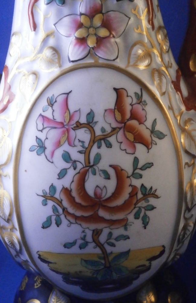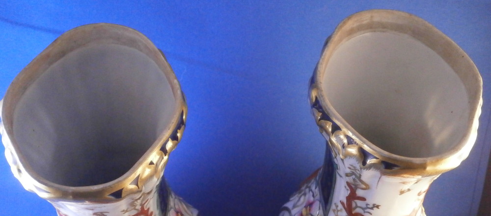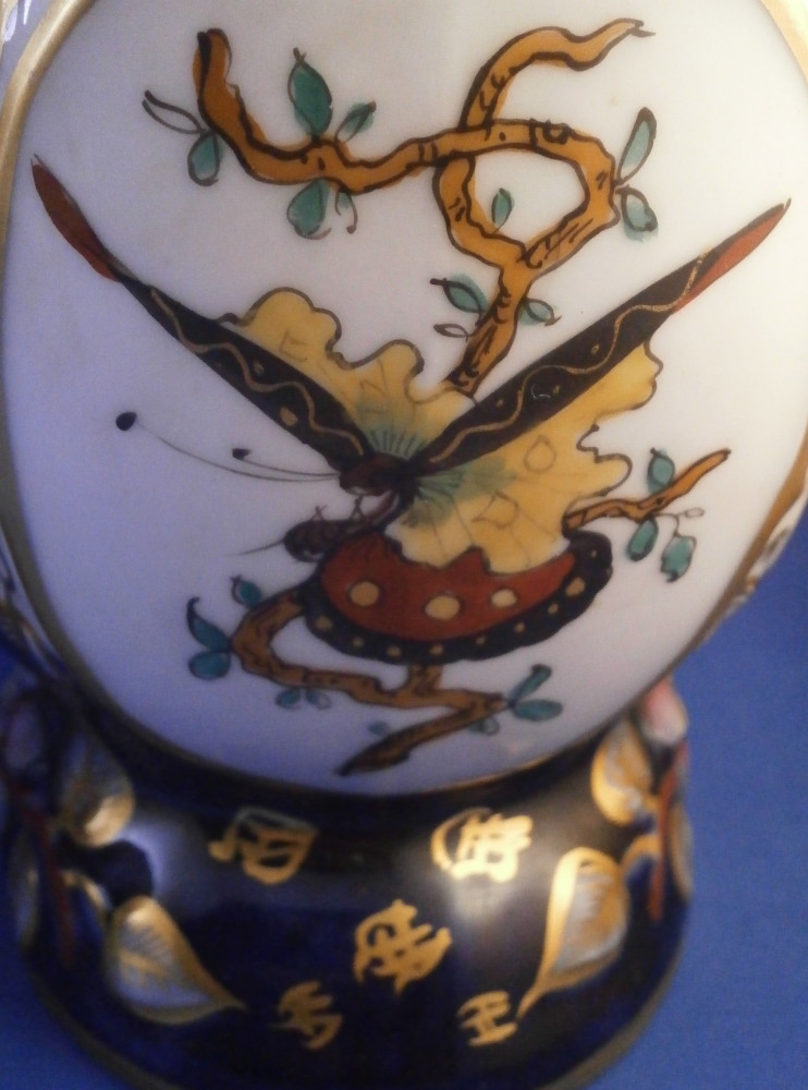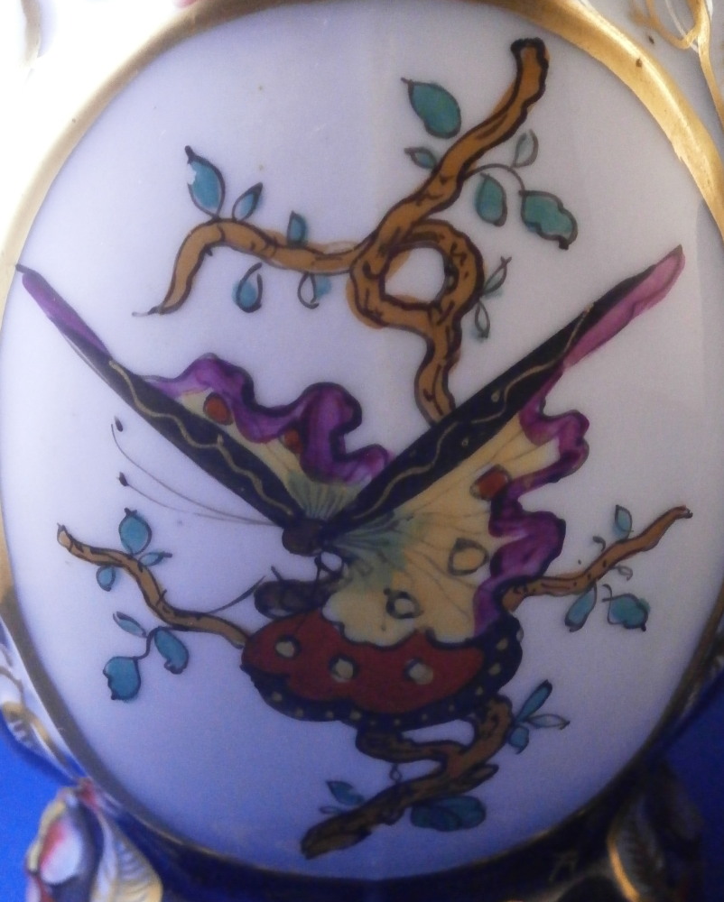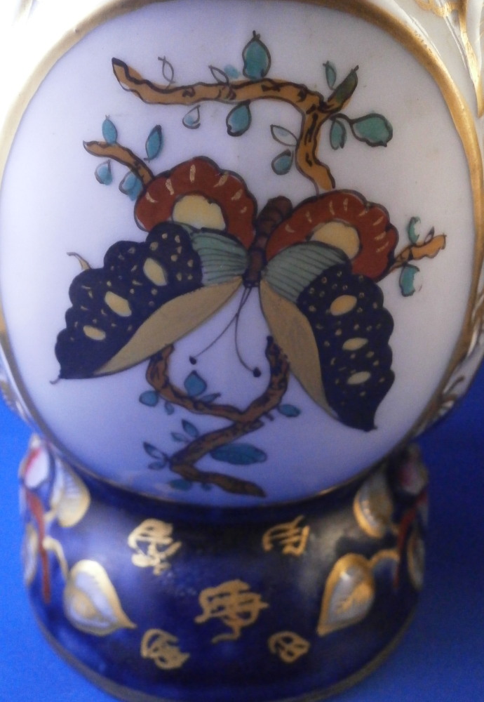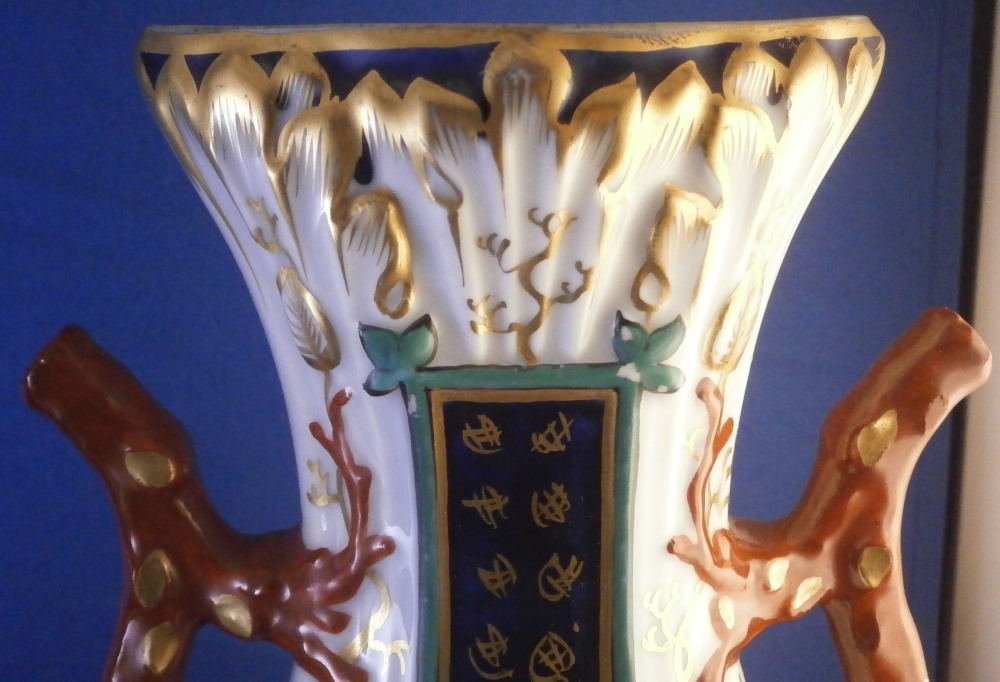 This is a great pair of vases made by Bayeux in France during the Gosse period of the mid 19th century. Each has a nice shape to it with a corral look handle to each side and lots of relief designs like leaves highlighted with gilding. The top edge has a bit of blue ground color to it as does the foot of the vases. Each has a cartouche to the front and back including a stylized plant with some nice blossoms with a blossom above the cartouche as well as below. There is a little blue ground rectangular area to the neck of each vase with psydo Chinese characters to it with more to the sides of the base. Each side of the vases has a stylized butterfly design to it which is quite typical of this maker! . These are really nice examples for this maker and is is unusual to find such a nice pair! The pair is in great condition with a tiny bit of wear to the gilding, two small chips to the top edge of one vase though on seems to be from when it was made as it is gilded over. A little chipping to the green paint around the chop marks cartouche along the neck areas but all in all they are in superb condition and display perfectly. Inside rim is unglazed as shown. Neither piece is marked but the style is quite easily identifiable and they were definitely made by Bayeux during this period! Each vase is about 11.25 inches tall, about 5.375 inches wide and 4.25 inches deep. Please email me for more information or other pictures.