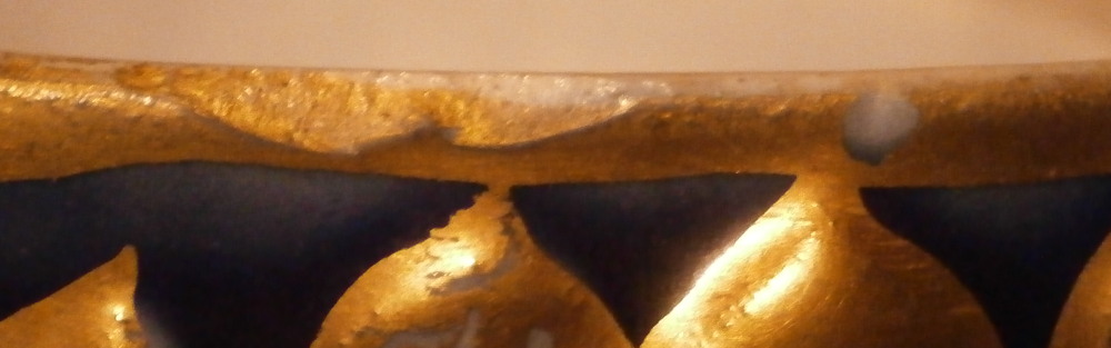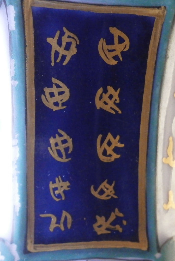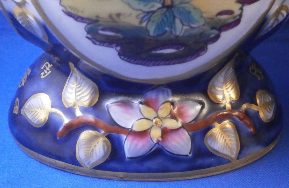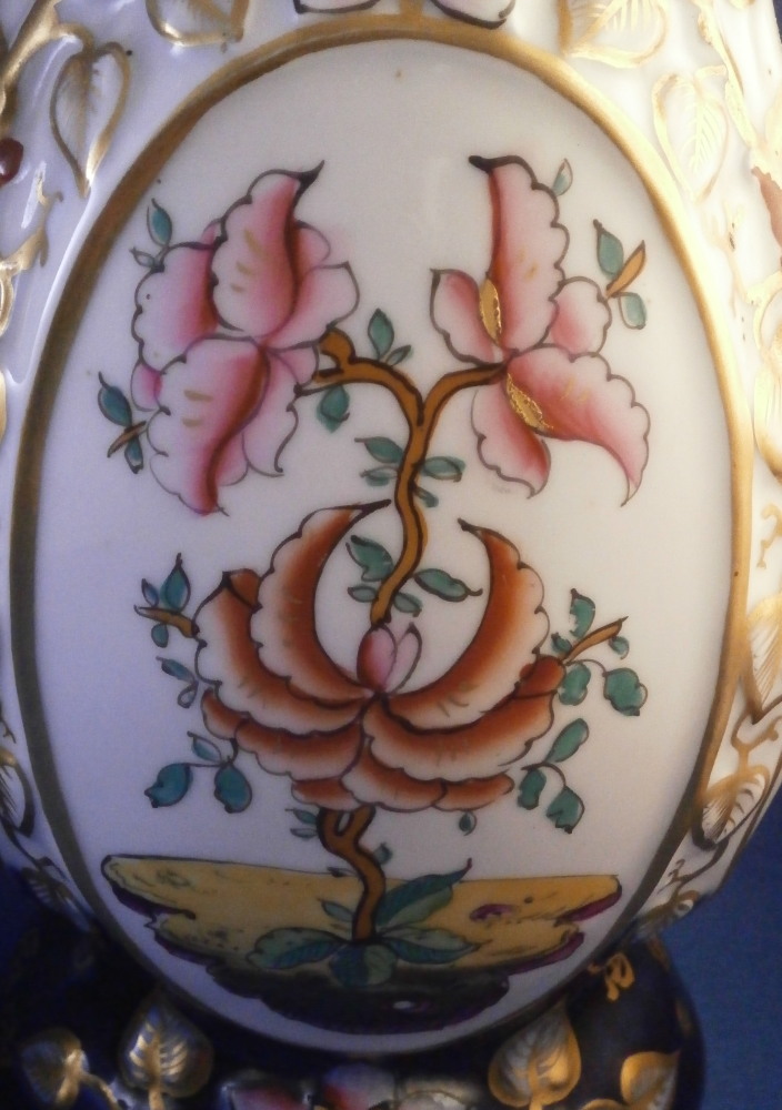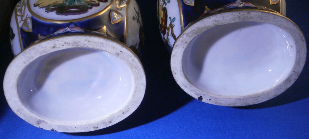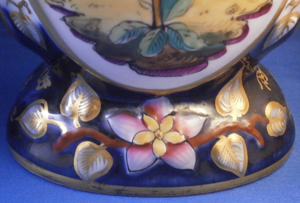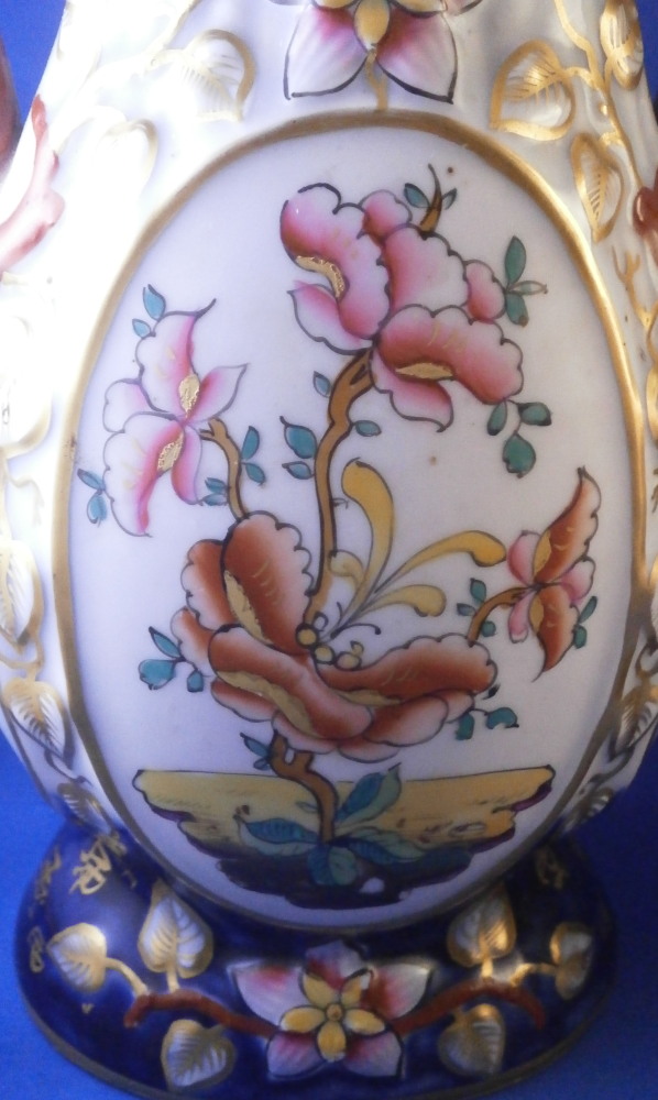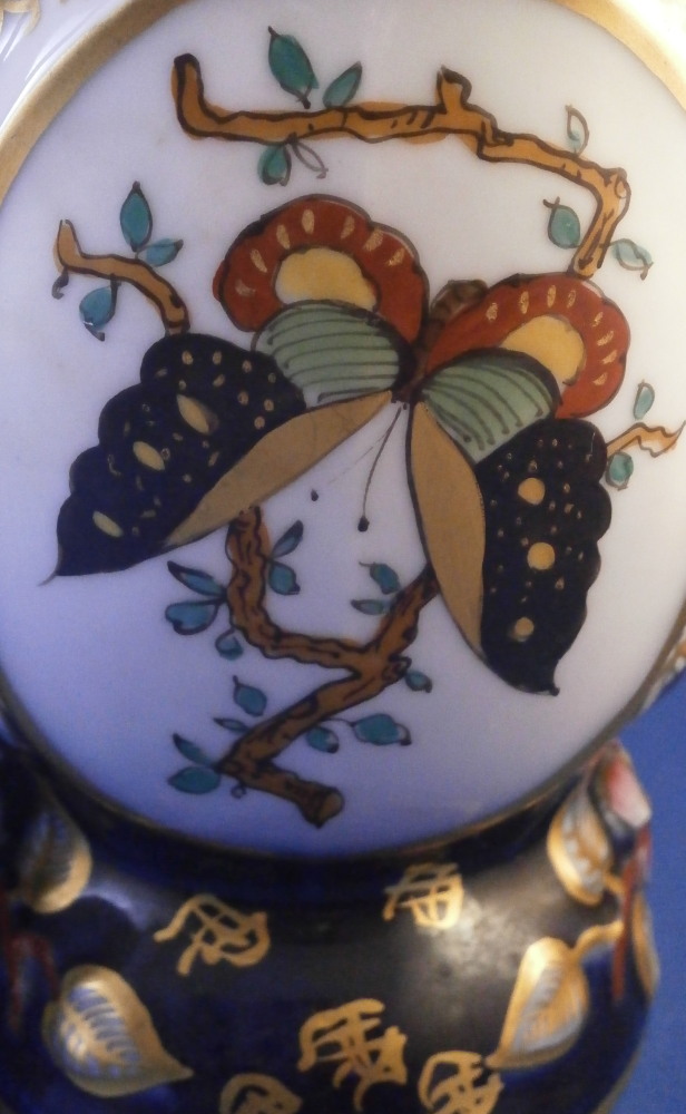 This is a great pair of vases made by Bayeux in France during the Gosse period of the mid 19th century. Each has a nice shape to it with a corral look handle to each side and lots of relief designs like leaves highlighted with gilding. The top edge has a bit of blue ground color to it as does the foot of the vases. Each has a cartouche to the front and back including a stylized plant with some nice blossoms with a blossom above the cartouche as well as below. There is a little blue ground rectangular area to the neck of each vase with psydo Chinese characters to it with more to the sides of the base. Each side of the vases has a stylized butterfly design to it which is quite typical of this maker! . These are really nice examples for this maker and is is unusual to find such a nice pair! The pair is in great condition with a tiny bit of wear to the gilding, two small chips to the top edge of one vase though on seems to be from when it was made as it is gilded over. A little chipping to the green paint around the chop marks cartouche along the neck areas but all in all they are in superb condition and display perfectly. Inside rim is unglazed as shown. Neither piece is marked but the style is quite easily identifiable and they were definitely made by Bayeux during this period! Each vase is about 11.25 inches tall, about 5.375 inches wide and 4.25 inches deep. Please email me for more information or other pictures.