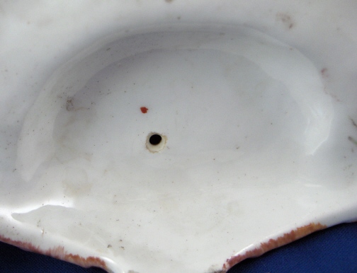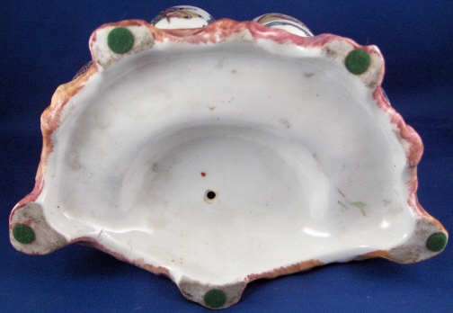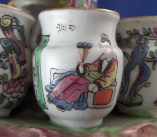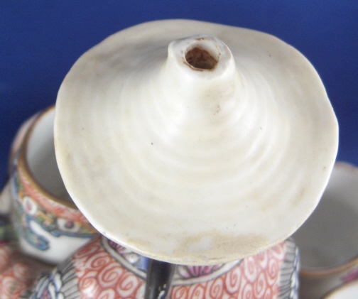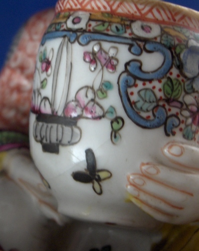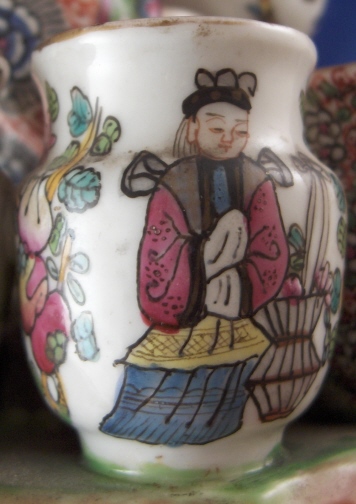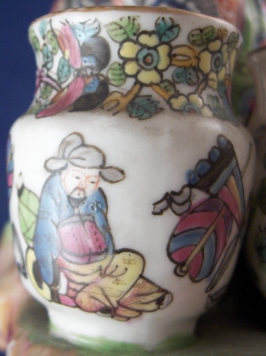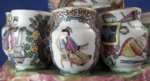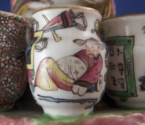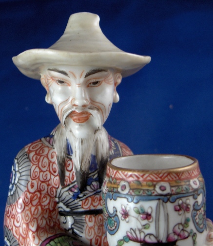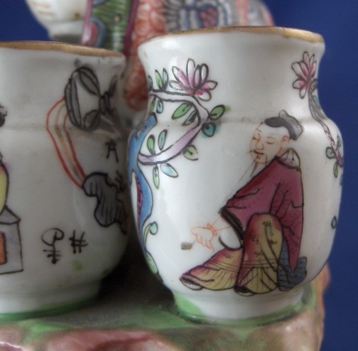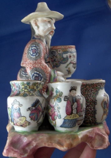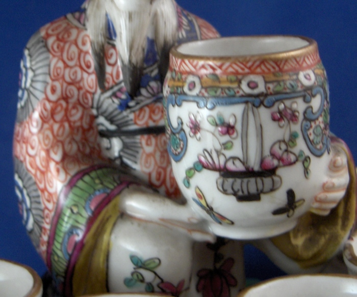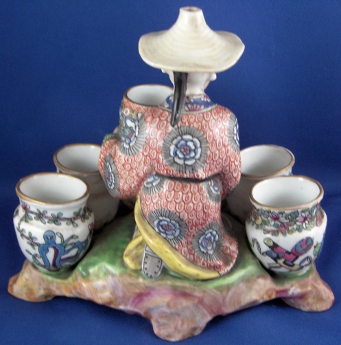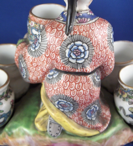 This is a merchant with his seven spice pots made by Bayeux during the Langlois period around 1830. Not sure what it is for but likely for spices or such. It is a rare piece modeled as a chinaman surrounded by six small pots and one pot in his hand all decorated in the chinoiserie style with figures, flowers, designs and even writing. Each pot has a different design to it and a nice gold trim to the top. The asian merchant is wearing a very detailed robe and a nice hast with a hole on top likely for a liquid or to hold incense!? All on a nice base painted like roks with grass on top. A superb piece that looks amazing on display! The piece is in superb condition with some wear to the gold trim on the pots and the one he is holding in his hands has a hairline that you can only see whn you search for it! The dish is not marked but that is normal! It is 6.25 inches tall, 7.375 inches wide and 4.875 inches deep. Please email me for more information or other pictures.