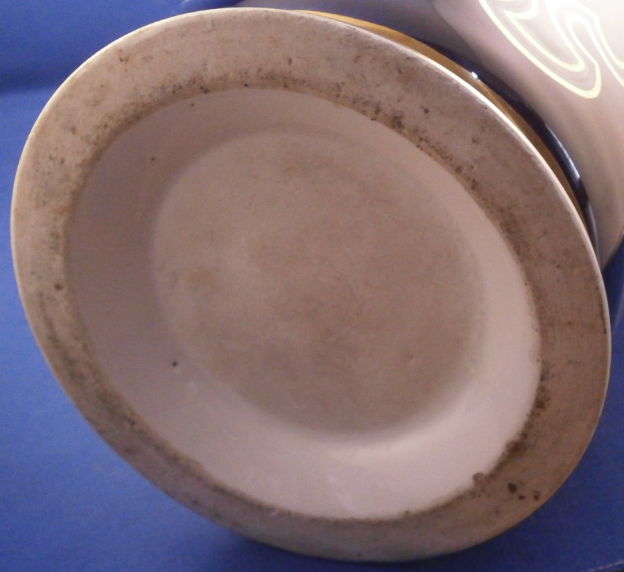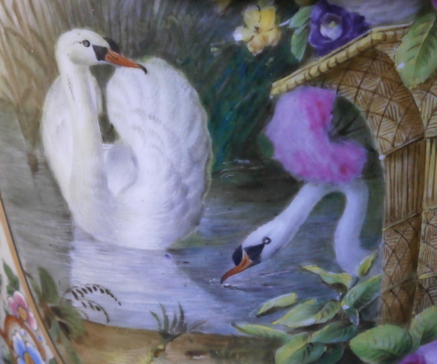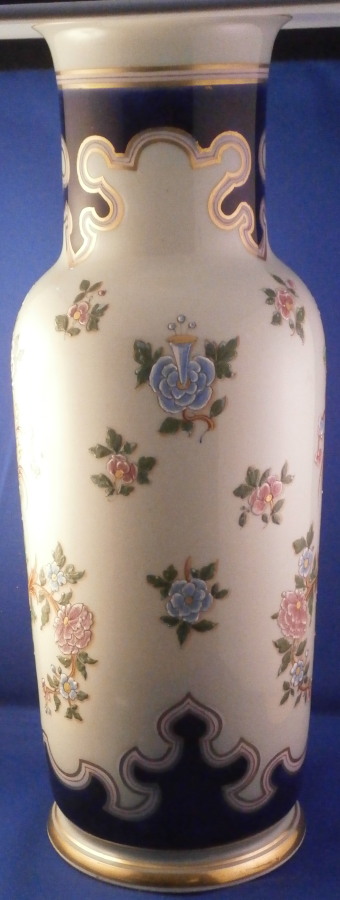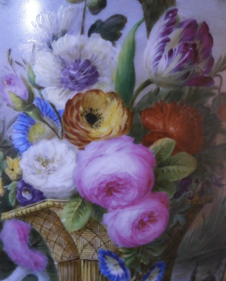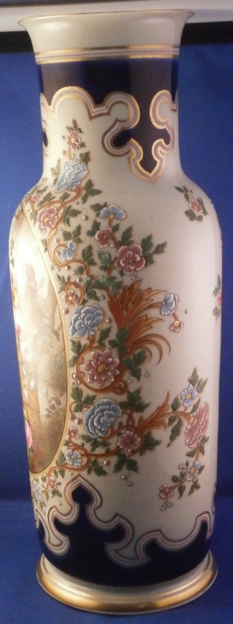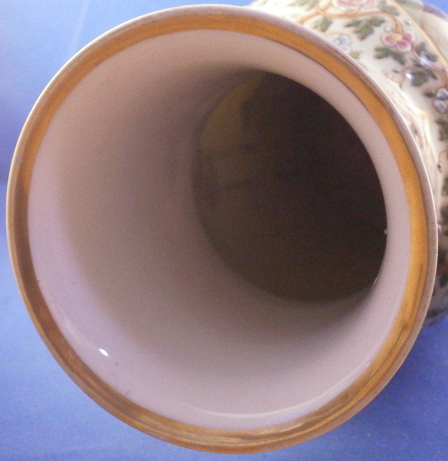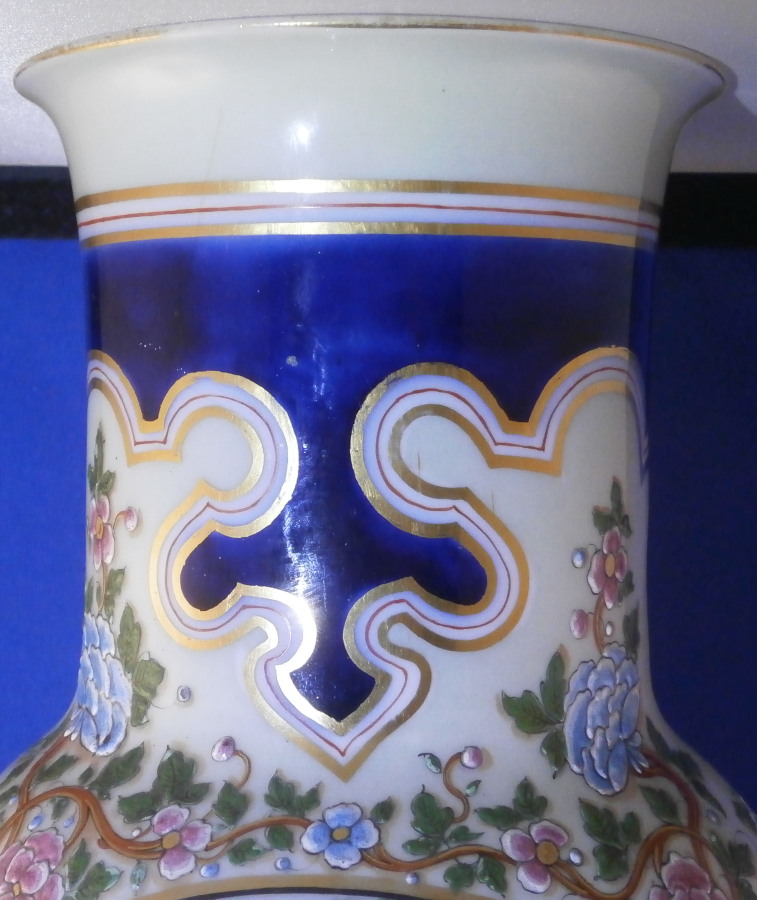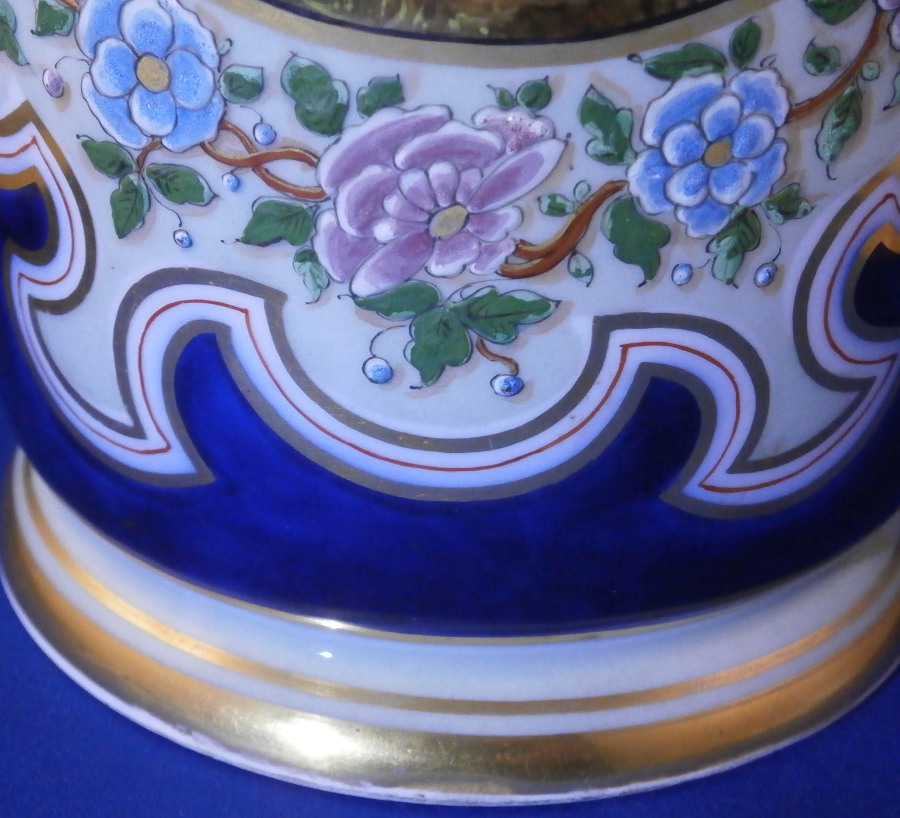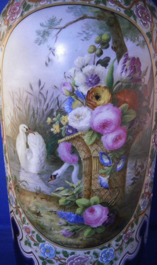This is a really nice and quite large scenic vase definitely made by Bayeux in France during the mid 19th century during the Langlois period . This is when they made their best peices and very heavily influences by the Asian taste. The vase has a really nice size being 16.25 inches tall with a diameter of 6 inches. It is hand painted with a really nice typically French scene on the front including two swans in some water with a huge basket filled with flowers and a nice landscape surrounding. What makes it very typically Bayeux are the amsazing Asian inspired flowers all over the vase. They did this in raised heavily enamels that gives them depth unlike any other maker. Just stunning! There are flowering vies all around the scene and single flowers to the back side of the piece. The top and bottom have a gold trim to the edges as well as a typical cobalt blue ground color with some more gold trim with a thin red line between. It is a stunning example of their work and unique among porcelain- that Chinese / french mix. The vase displays perfectly but had been drilled as a lamp in the past and restored though it will not hold water properly again. A bit of gold wear to the edges and a thin glaze line to the neck that does not go into the porcelain - their glaze is very thick and prone to this sort of issue. The piece is unmarked but that is very normal for these makers of this period or the mark could have been where they drilled it and is now gone. Please email me for more information or other pictures.