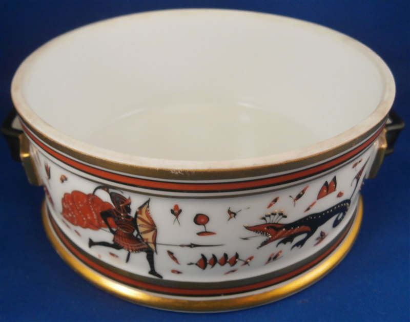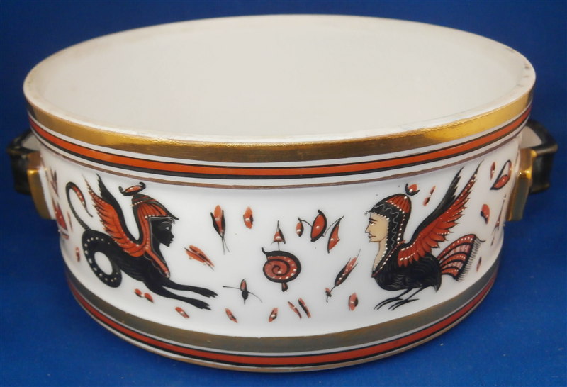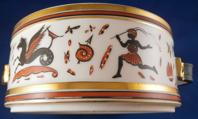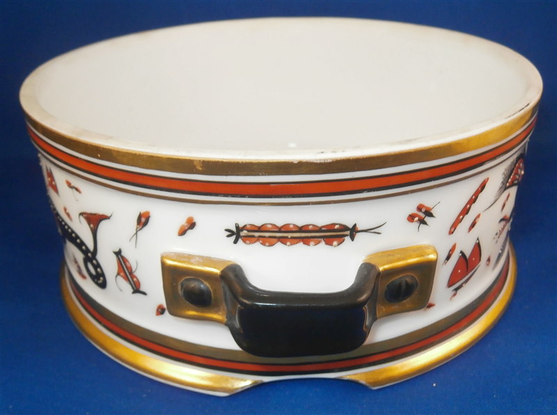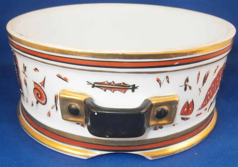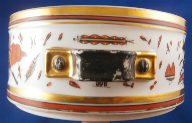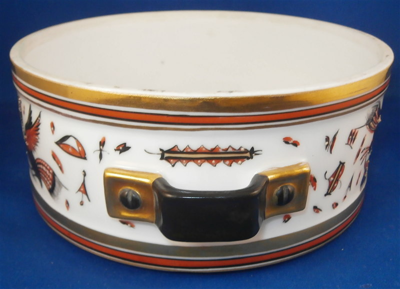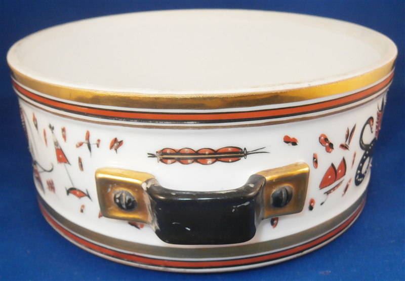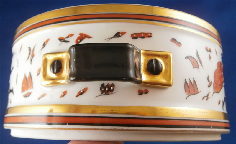 This is a great sectional Bento / lunch box made by Bayeux during the Gosse period of the mid 19th century. I have never seen this outside of Asian porcelain so it was a must have for me. The set consists of three boxes and a lid each piece fitting on top of the other in a specific order so there are each slightly different. The bottom has two indentations so you can get it of the table more easily and to connect the metal piece to it that would go through the handles and over the lid to carry it though I do not have that part. The lid has the indetations for that as well. No wear on those areas so not sure if the metal was ever used here!? Each piece is decorated with lots of small designs including snakes, weapons, butterflies, leaves anf figures of all sorts. Hard to mention them all so look at the pictures. This style of decoration was popular in the mid 19th century and even KPM used it. The handles are nicely shaped with the attachments made to look like screws. The colors used are black, beige, a dark orange and some gilding with raied white highlights here and there. One of the most fun pieces I have seen in a while and definitely very unusual in terms of shape in the world of European porcelain! The pieces are all in great condition with a tiny bit of wear mostly to two handles and one figural decoration. No chips, etc. The set is not marked but that is pretty normal! The entire piece is 8.375 inches tall with the lid having a diameter of 6.25 inches. You can use it for your lunch or to store lots of knicknacks in it or something along those lines - be creative :) Please email me for more information or other pictures.