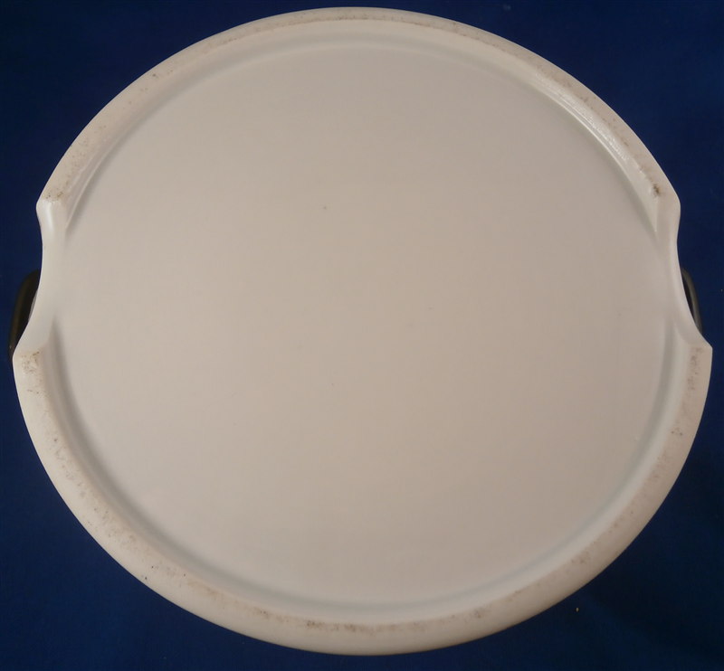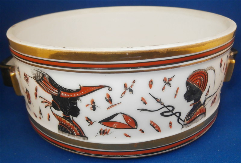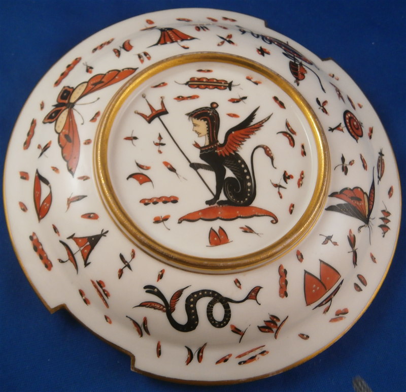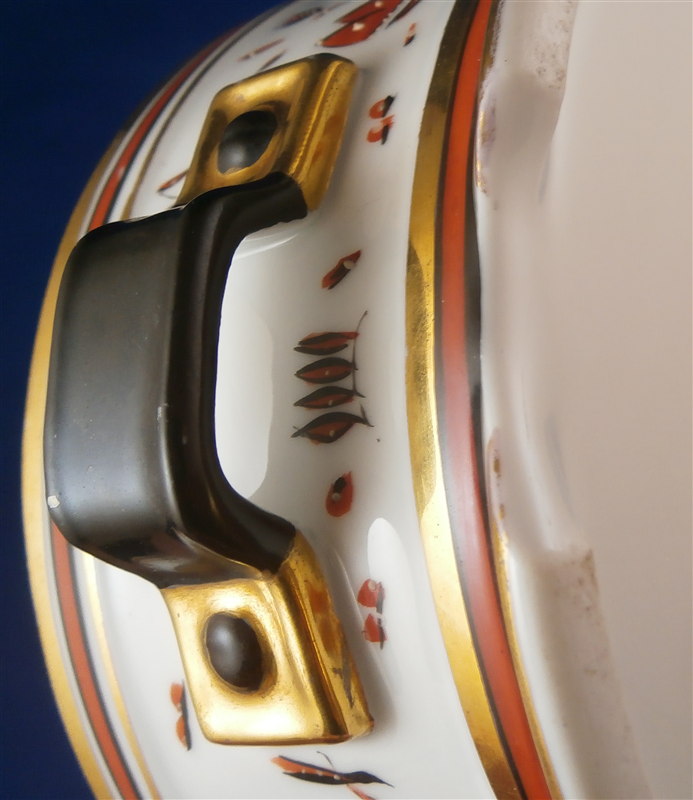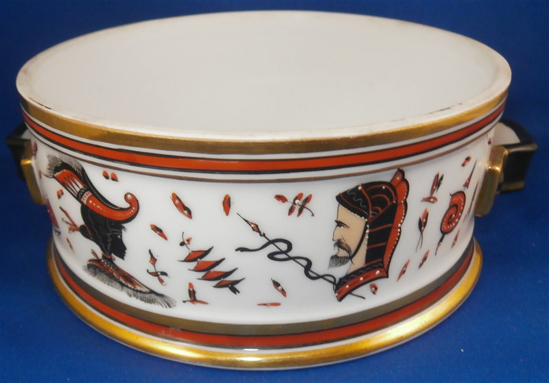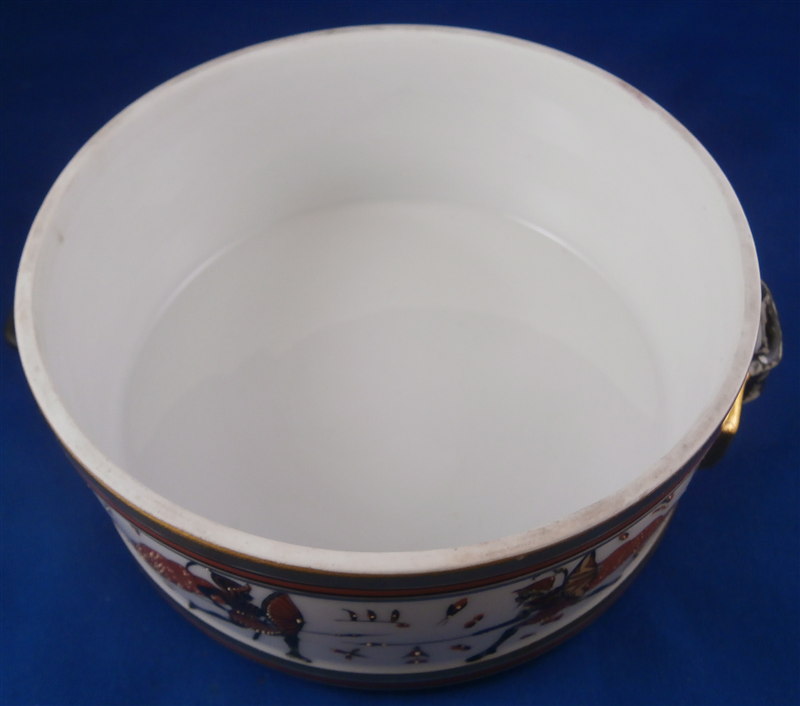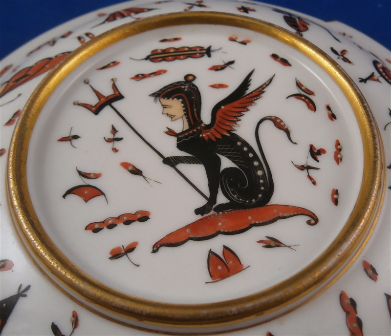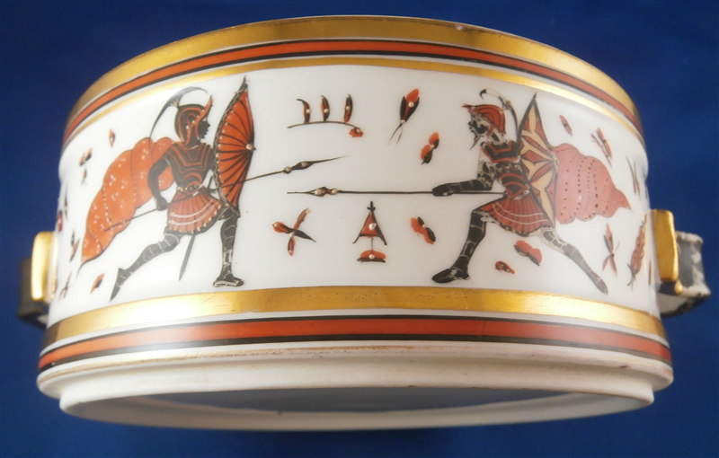 This is a great sectional Bento / lunch box made by Bayeux during the Gosse period of the mid 19th century. I have never seen this outside of Asian porcelain so it was a must have for me. The set consists of three boxes and a lid each piece fitting on top of the other in a specific order so there are each slightly different. The bottom has two indentations so you can get it of the table more easily and to connect the metal piece to it that would go through the handles and over the lid to carry it though I do not have that part. The lid has the indetations for that as well. No wear on those areas so not sure if the metal was ever used here!? Each piece is decorated with lots of small designs including snakes, weapons, butterflies, leaves anf figures of all sorts. Hard to mention them all so look at the pictures. This style of decoration was popular in the mid 19th century and even KPM used it. The handles are nicely shaped with the attachments made to look like screws. The colors used are black, beige, a dark orange and some gilding with raied white highlights here and there. One of the most fun pieces I have seen in a while and definitely very unusual in terms of shape in the world of European porcelain! The pieces are all in great condition with a tiny bit of wear mostly to two handles and one figural decoration. No chips, etc. The set is not marked but that is pretty normal! The entire piece is 8.375 inches tall with the lid having a diameter of 6.25 inches. You can use it for your lunch or to store lots of knicknacks in it or something along those lines - be creative :) Please email me for more information or other pictures.