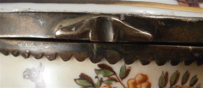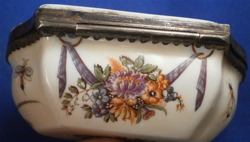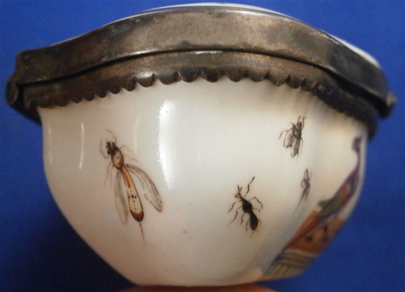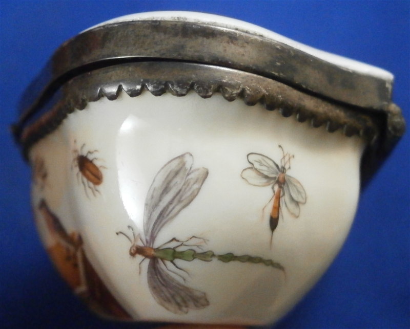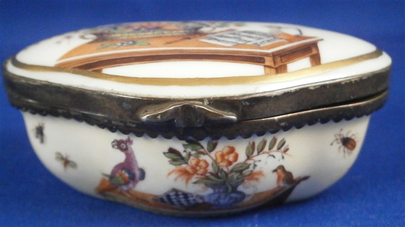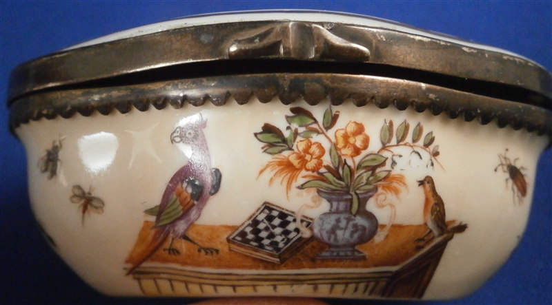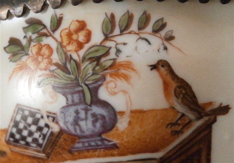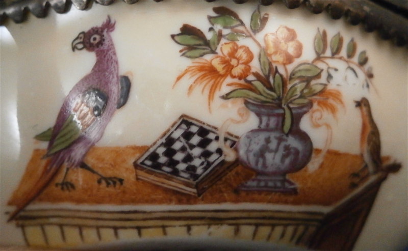 This is a really fun porcelain tabatiere / snuff box made in about 1725 and decorated at about the same time by Johann Friedrich Metzsch , a Hausmaler who owned a workshop in Bayreuth . I always knew it was a very early peice because of the mounts and quality but just recently figured it out when I saw two other peices by him with identical flwers and a very similar parrot! So I was thrilled to say the least. I don't know of any other snuff box out there decorated by him! The superb quality of the painting suggests he himself painted this plate. Of all the Hausmaler pieces his work seems to be the hardest to find and honestly also one of the best! J.F. Metzsch painted mostly Meissen blanks aand that is the case here as well. This is really a superb example of his work in the typical colors and style - one of the best I have seen by him! The bottom sides of the box is superbly hand painted with an amazing scene on one side of a parrot standing on a table with a chess board by his side, a superb vase filled with flowers next to the chess board and another bird on the other side of the table. The handles on the jugs and vases are baroque, not rococo, so that fits in with my dating and the little Chinoiserie scene on the vase is charming as can be - definitely hinting at Meissen there. The quality of the scenes is amazing and really fun and colorful. The sides of the box have some fun insects on them with the back side having a floral arrangement held up by strings also of superb quality. The underside has a nice floral design to it as well. The "white " areas are slightly yellowish in ground color (not from restoration!). The top of the box also has a nice table scene on it with a large floral arrangement with a bird sitting on top, a flute next to the basket with some sheet music next to that and a pitcher at the end of the table. Gold trim all along the outside near the edge of the lid. The mounts are silver and really early - the only other ones that I have seen are on a St. Cloud pre 1750 snuff box I own. The inside is gilded completely. The box doesn't close anymore because the top and bottom on one side don't glide over each other anymore. All in all a very special snuff box of superb quality by a top notch maker and decorator. It is in good condition and displays perfectly but the bottom part has two minor chips to the inside edge, a little paint flaking to some leaves and age appropriate wear to the glaze of the underside while the top part has some chipping along the inside edge with two large flat chips to the one side as shown. It doesn't affect the top view but can be seen from the back edge as shown. There are no marks except for what looks to be an impressed or incised mark on the lower right hand corner of the lid. The box is about 1.25 inches tall, 2.75 inches wide and 1.875 inches deep. Please email me for more information or photos.