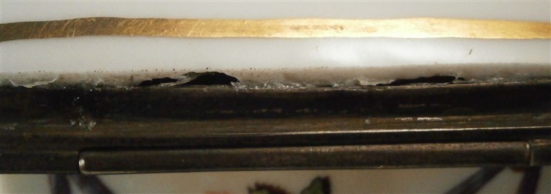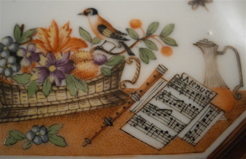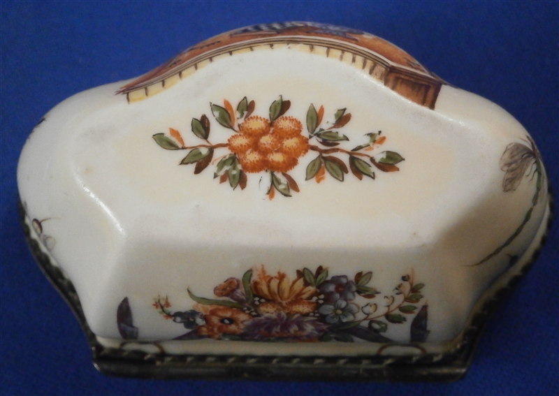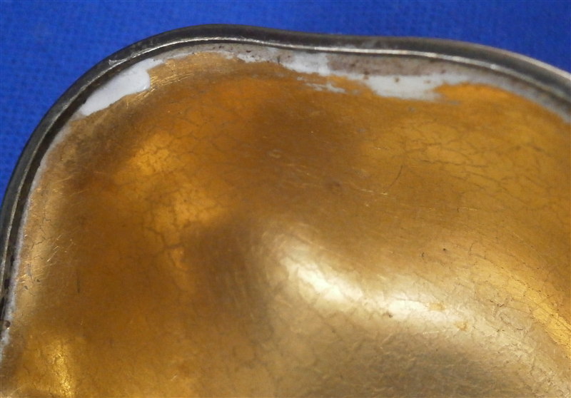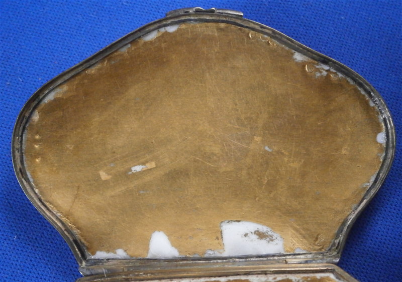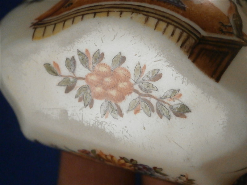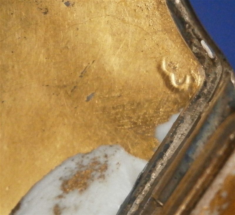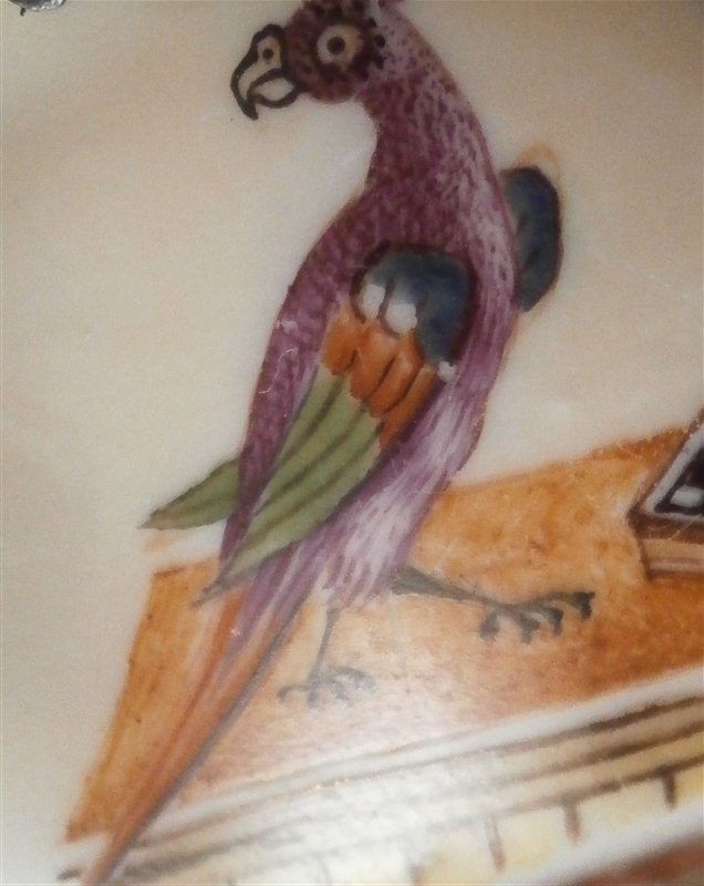 This is a really fun porcelain tabatiere / snuff box made in about 1725 and decorated at about the same time by Johann Friedrich Metzsch , a Hausmaler who owned a workshop in Bayreuth . I always knew it was a very early peice because of the mounts and quality but just recently figured it out when I saw two other peices by him with identical flwers and a very similar parrot! So I was thrilled to say the least. I don't know of any other snuff box out there decorated by him! The superb quality of the painting suggests he himself painted this plate. Of all the Hausmaler pieces his work seems to be the hardest to find and honestly also one of the best! J.F. Metzsch painted mostly Meissen blanks aand that is the case here as well. This is really a superb example of his work in the typical colors and style - one of the best I have seen by him! The bottom sides of the box is superbly hand painted with an amazing scene on one side of a parrot standing on a table with a chess board by his side, a superb vase filled with flowers next to the chess board and another bird on the other side of the table. The handles on the jugs and vases are baroque, not rococo, so that fits in with my dating and the little Chinoiserie scene on the vase is charming as can be - definitely hinting at Meissen there. The quality of the scenes is amazing and really fun and colorful. The sides of the box have some fun insects on them with the back side having a floral arrangement held up by strings also of superb quality. The underside has a nice floral design to it as well. The "white " areas are slightly yellowish in ground color (not from restoration!). The top of the box also has a nice table scene on it with a large floral arrangement with a bird sitting on top, a flute next to the basket with some sheet music next to that and a pitcher at the end of the table. Gold trim all along the outside near the edge of the lid. The mounts are silver and really early - the only other ones that I have seen are on a St. Cloud pre 1750 snuff box I own. The inside is gilded completely. The box doesn't close anymore because the top and bottom on one side don't glide over each other anymore. All in all a very special snuff box of superb quality by a top notch maker and decorator. It is in good condition and displays perfectly but the bottom part has two minor chips to the inside edge, a little paint flaking to some leaves and age appropriate wear to the glaze of the underside while the top part has some chipping along the inside edge with two large flat chips to the one side as shown. It doesn't affect the top view but can be seen from the back edge as shown. There are no marks except for what looks to be an impressed or incised mark on the lower right hand corner of the lid. The box is about 1.25 inches tall, 2.75 inches wide and 1.875 inches deep. Please email me for more information or photos.